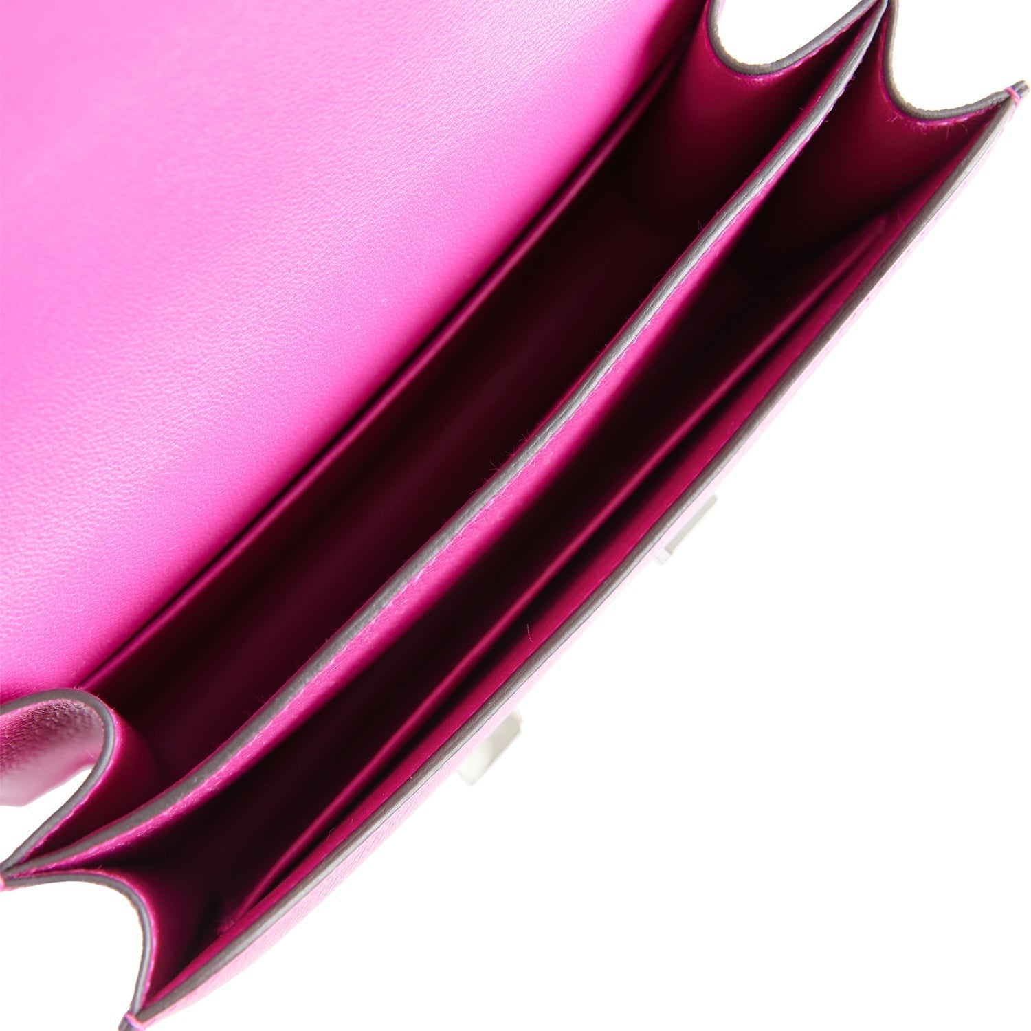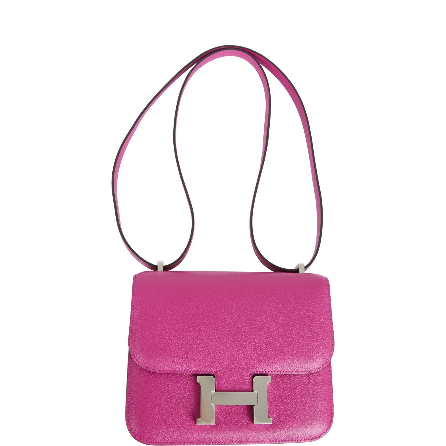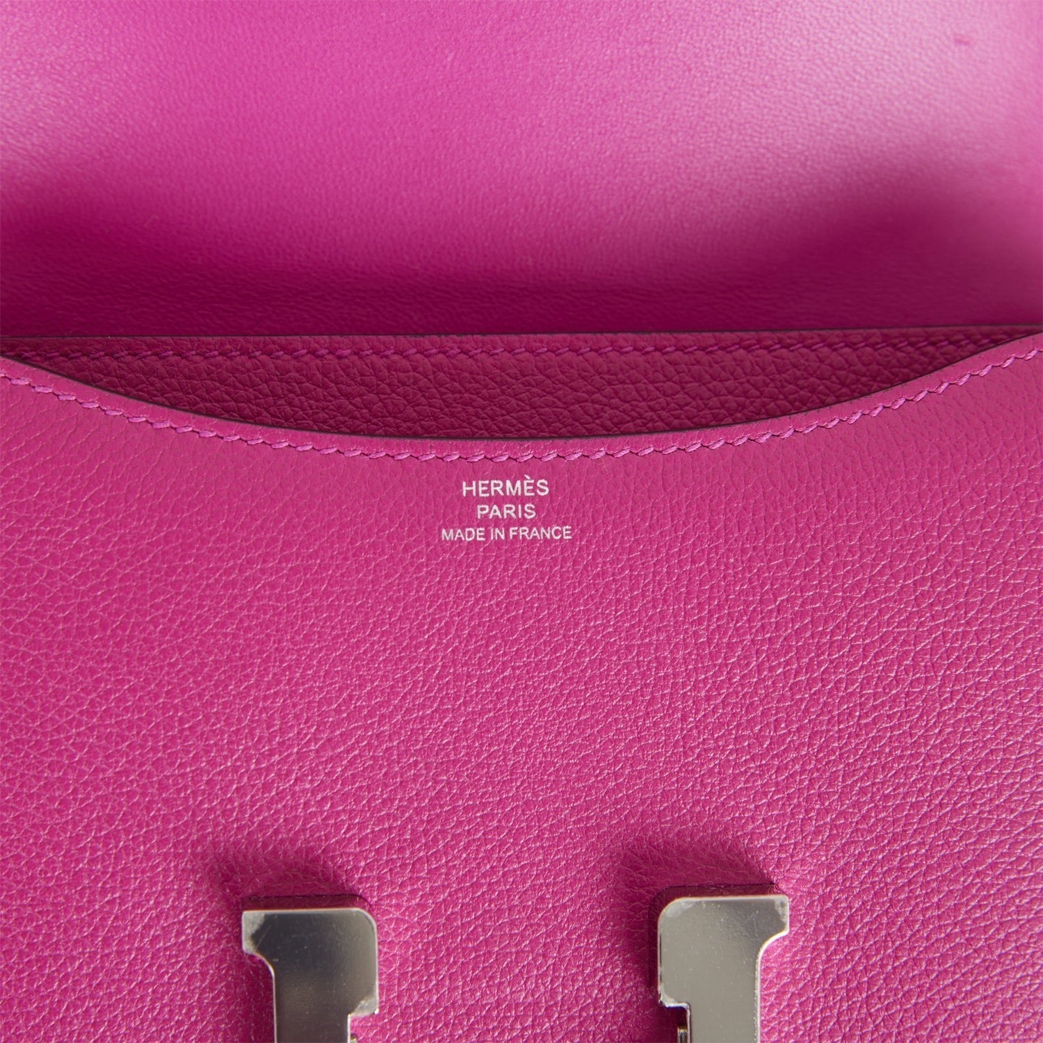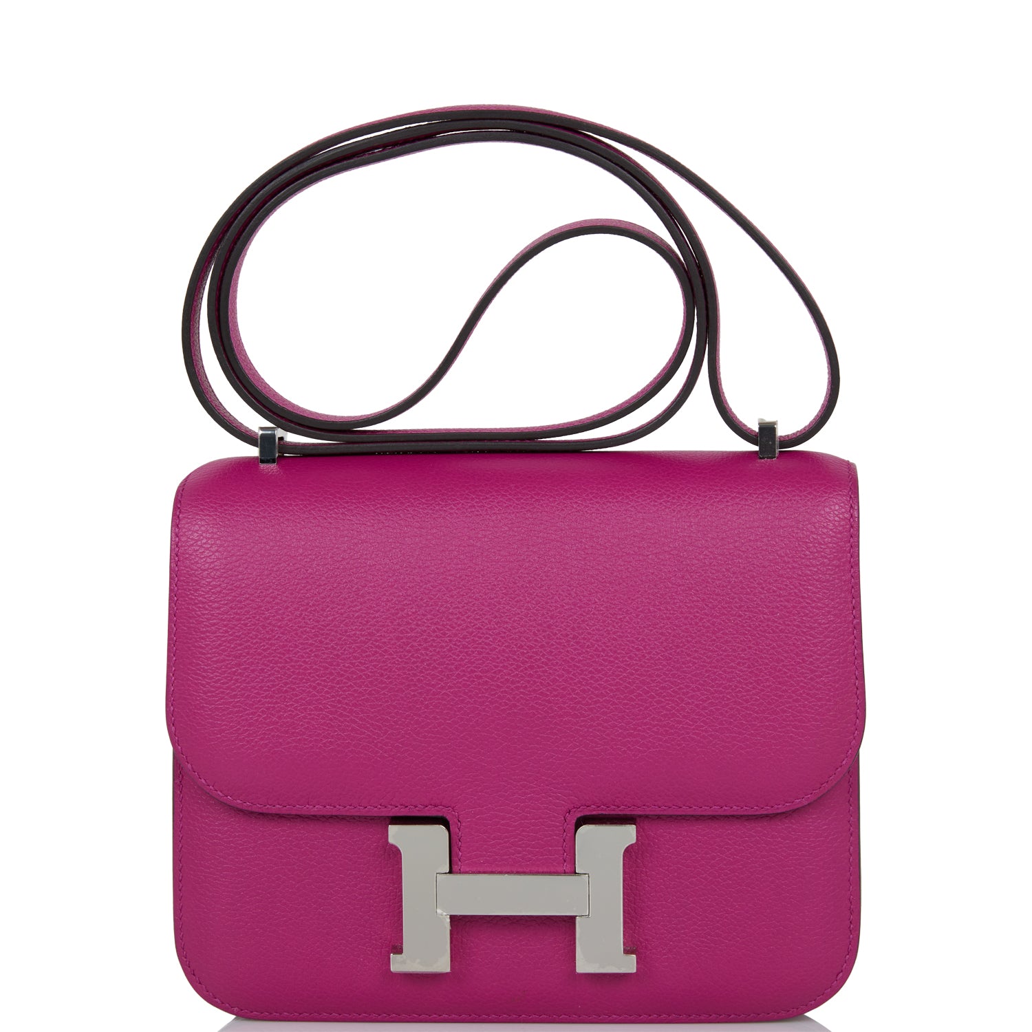 This Constance is in Rose Pourpre evercolor leather with palladium hardware and has tonal stitching, a metal "H" snap lock closure and adjustable shoulder strap.