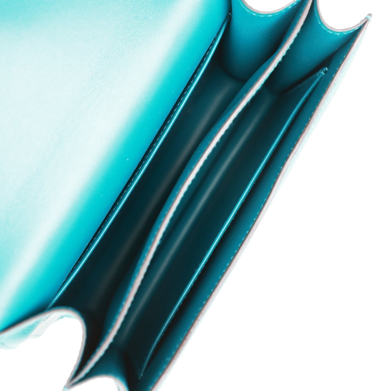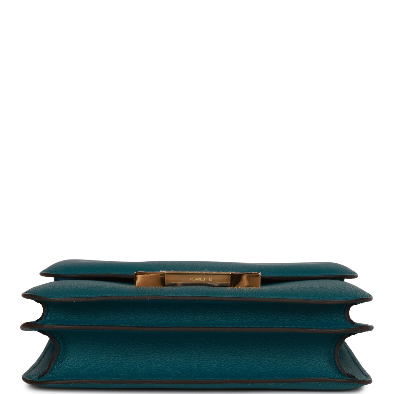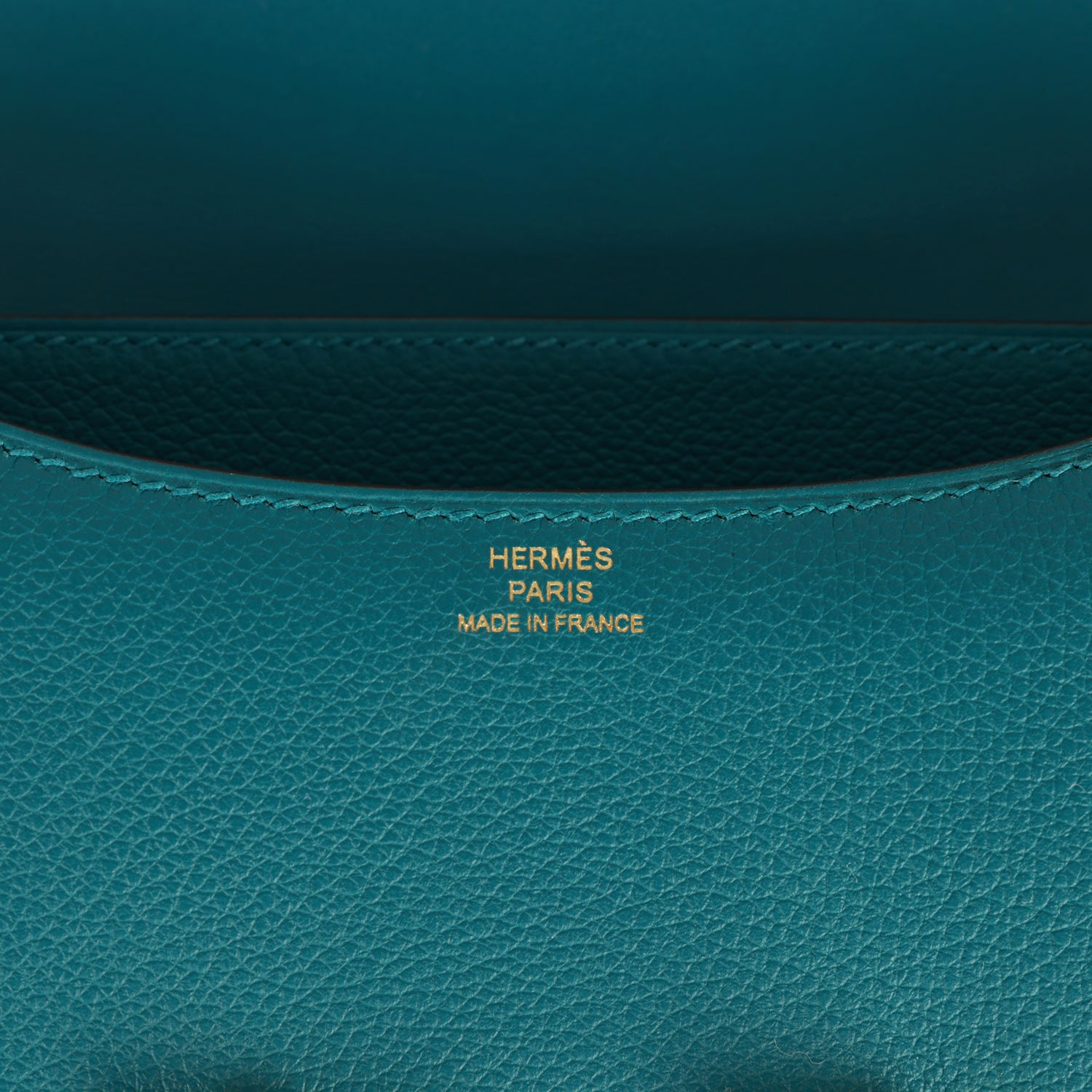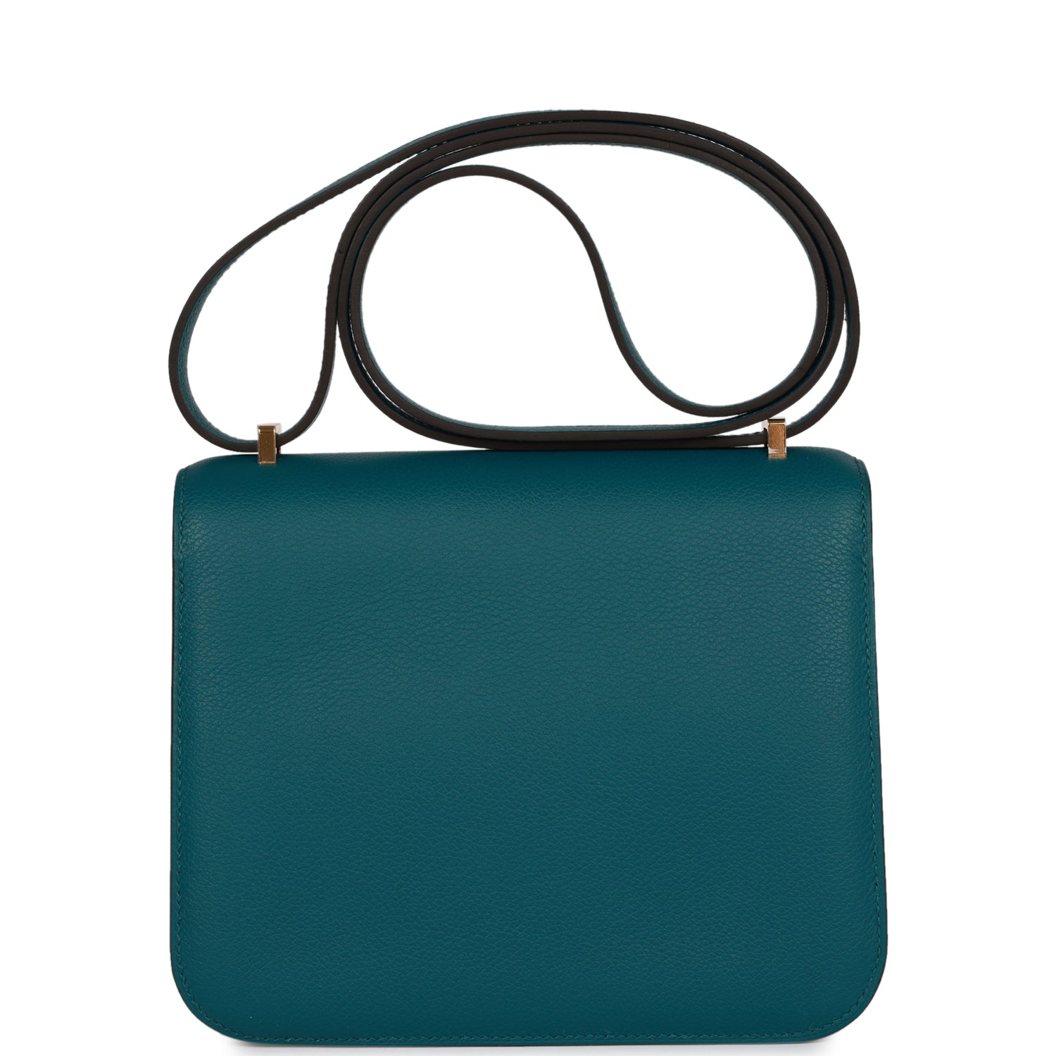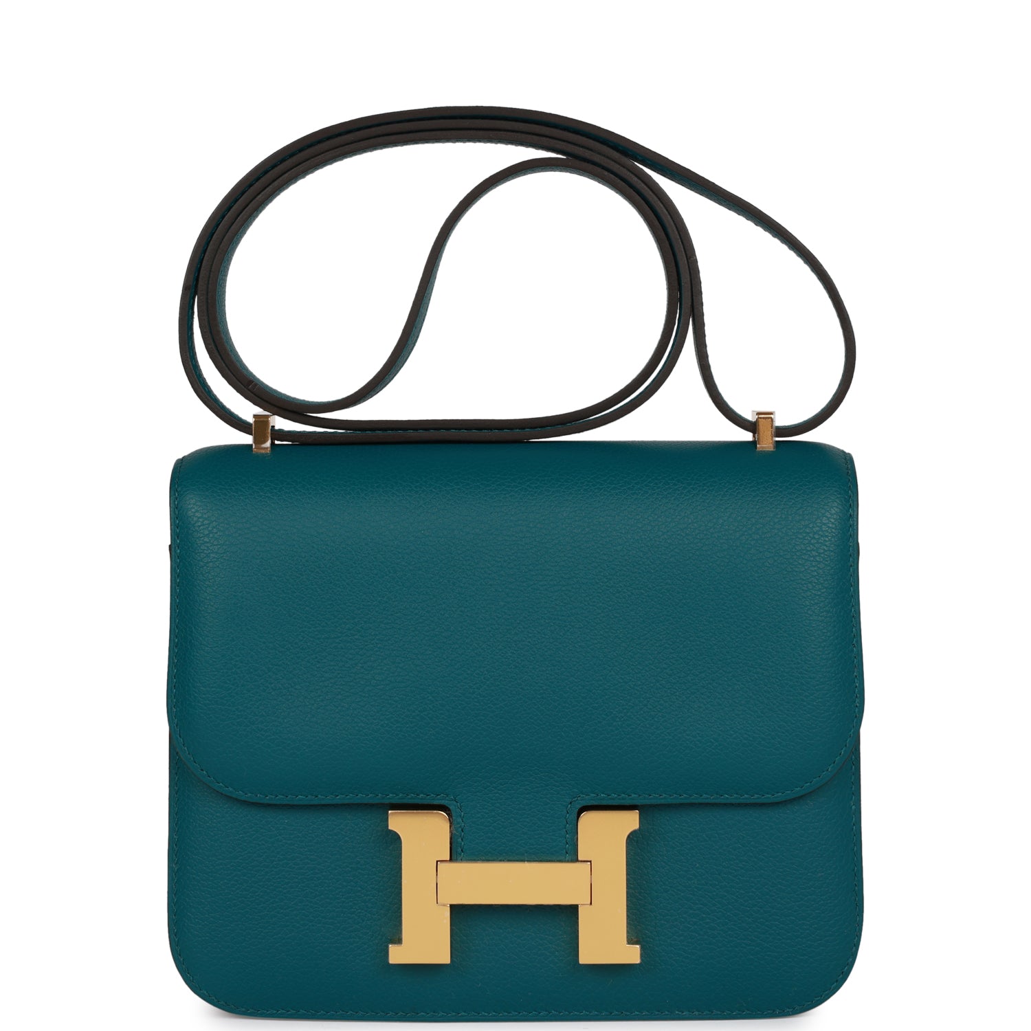 This Constance is in Vert Bosphore evercolor leather with gold hardware and has tonal stitching, a metal "H" snap lock closure and adjustable shoulder strap.
