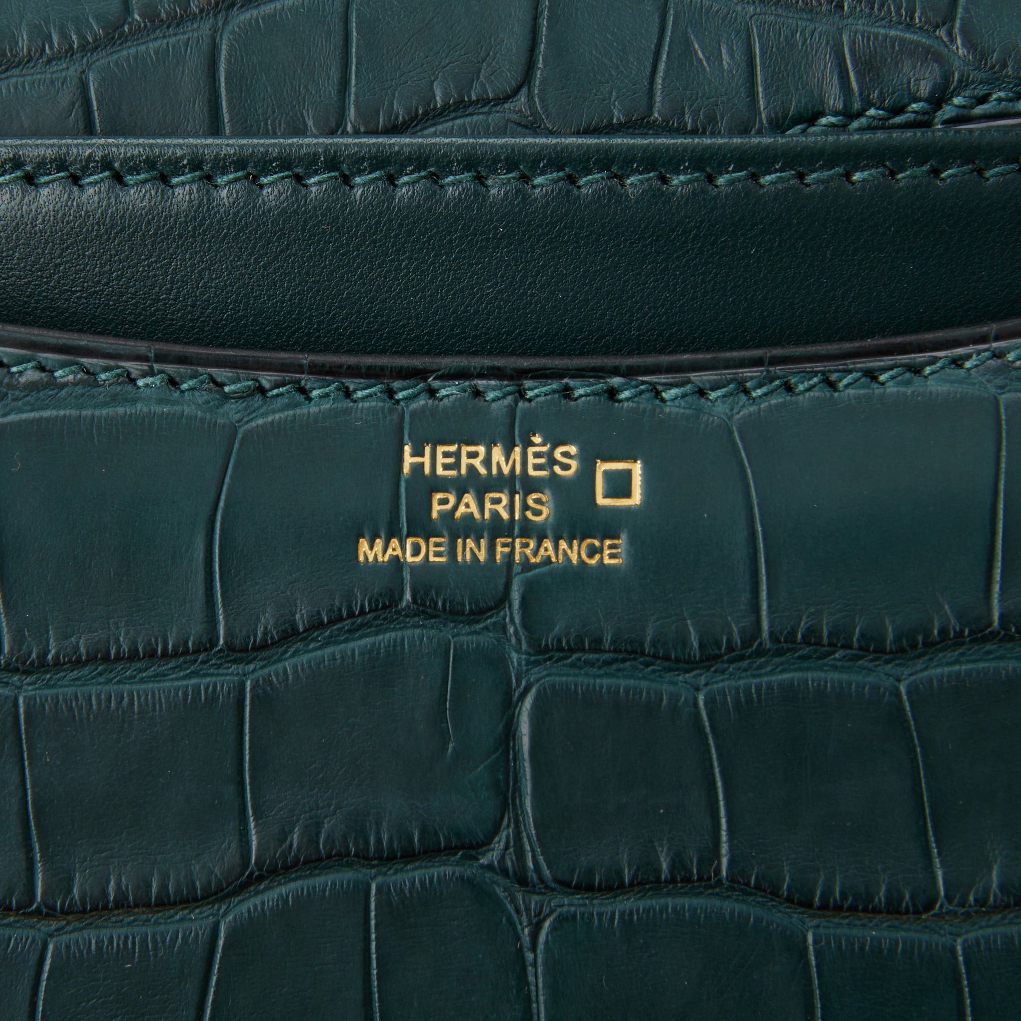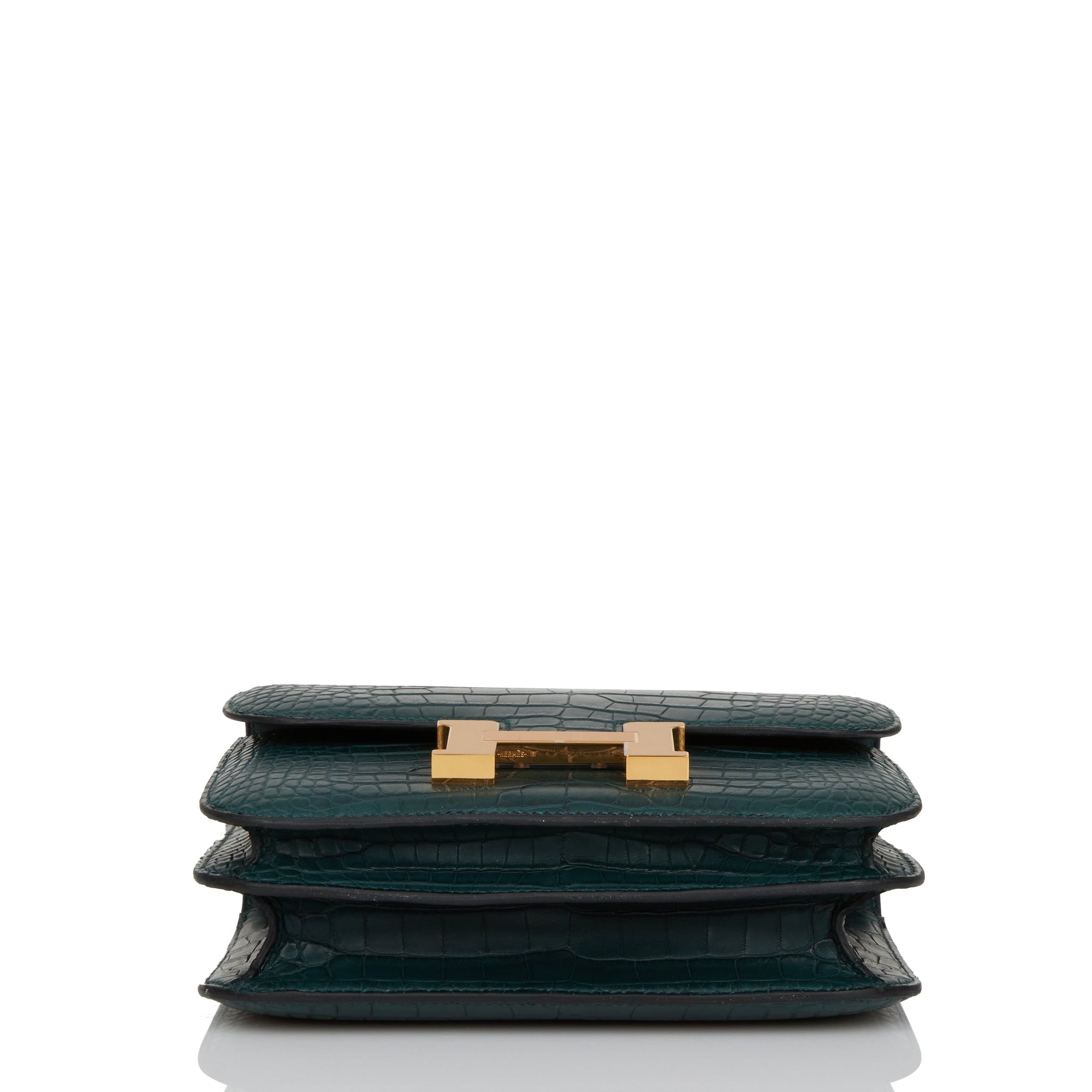 This Constance is of Vert Cypress matte alligator with gold hardware and features tonal stitching, a "H" snap lock closure, and an adjustable shoulder strap.
