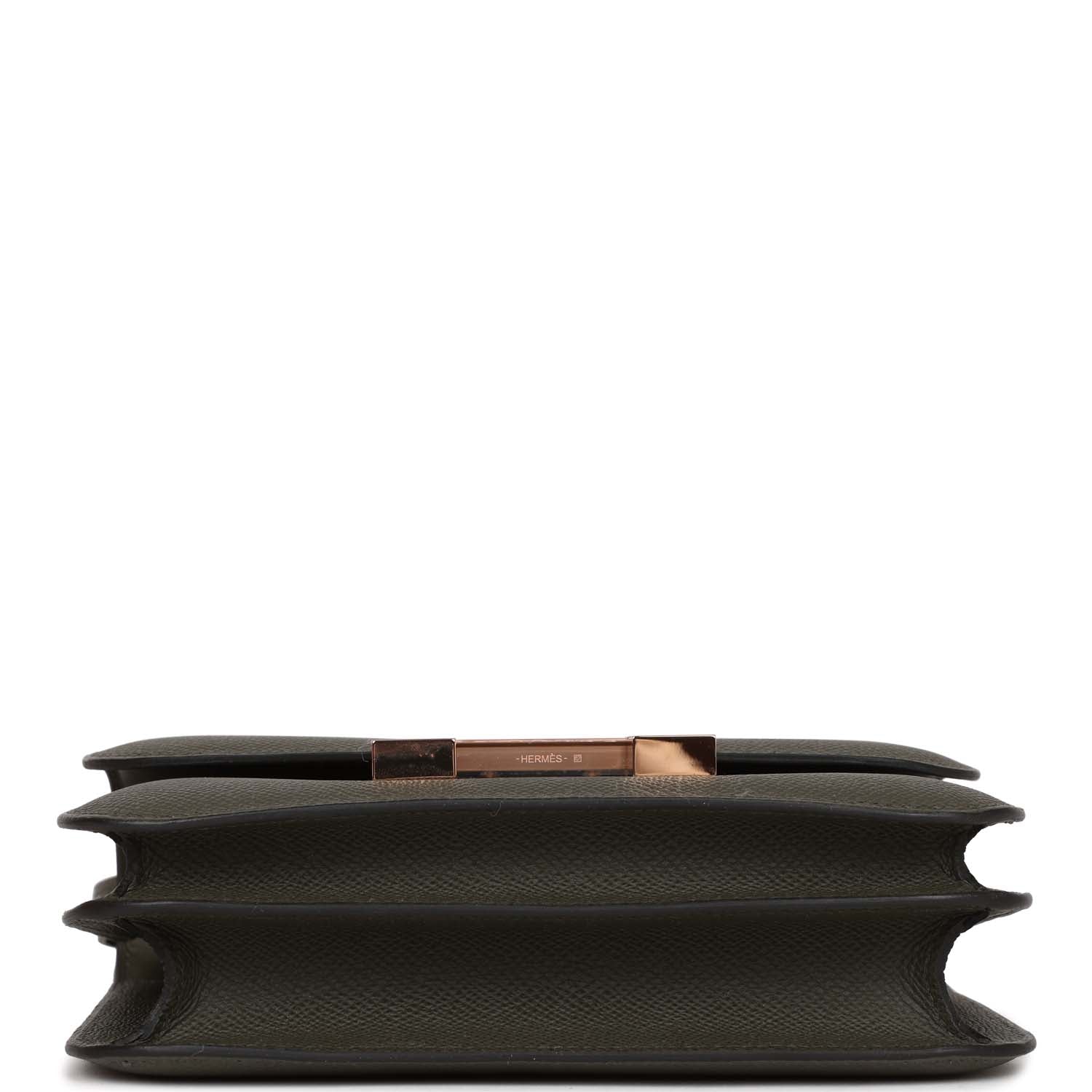 This Constance is in Vert de Gris epsom leather with rose gold hardware, has tonal stitching, a metal "H" snap lock closure, and an adjustable shoulder strap.