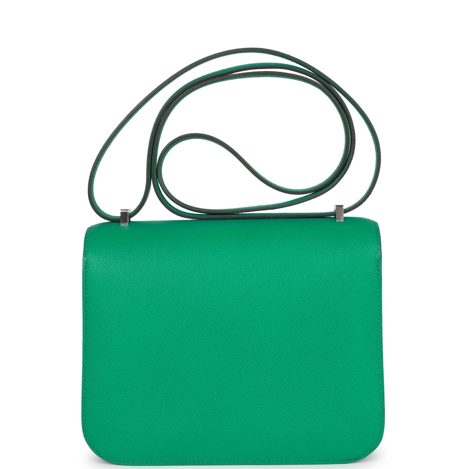This Constance is in Vert Jade epsom leather with palladium hardware, has tonal stitching, a metal "H" snap lock closure and adjustable shoulder strap.