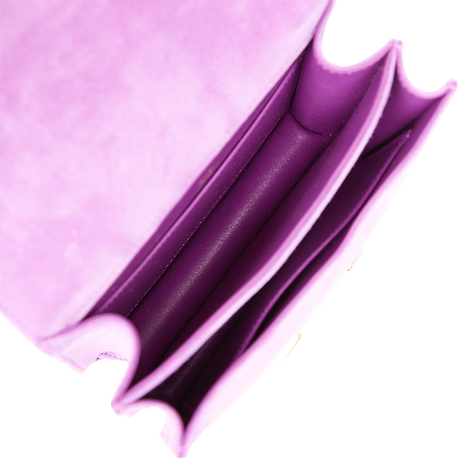 The interior is lined with Violet lambskin and has an open pocket on the front wall, a center divide, and a slit pocket on the back wall.