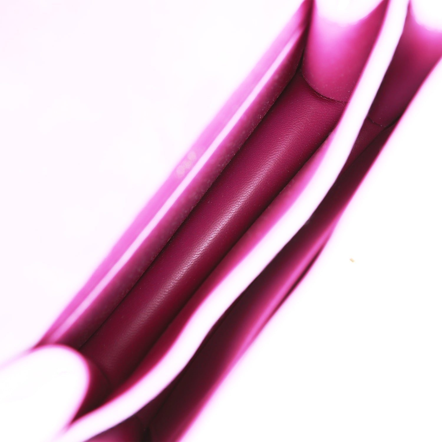 The interior is lined with Violet lambskin and has an open pocket on the front wall, a center divide, and a slit pocket on the back wall.