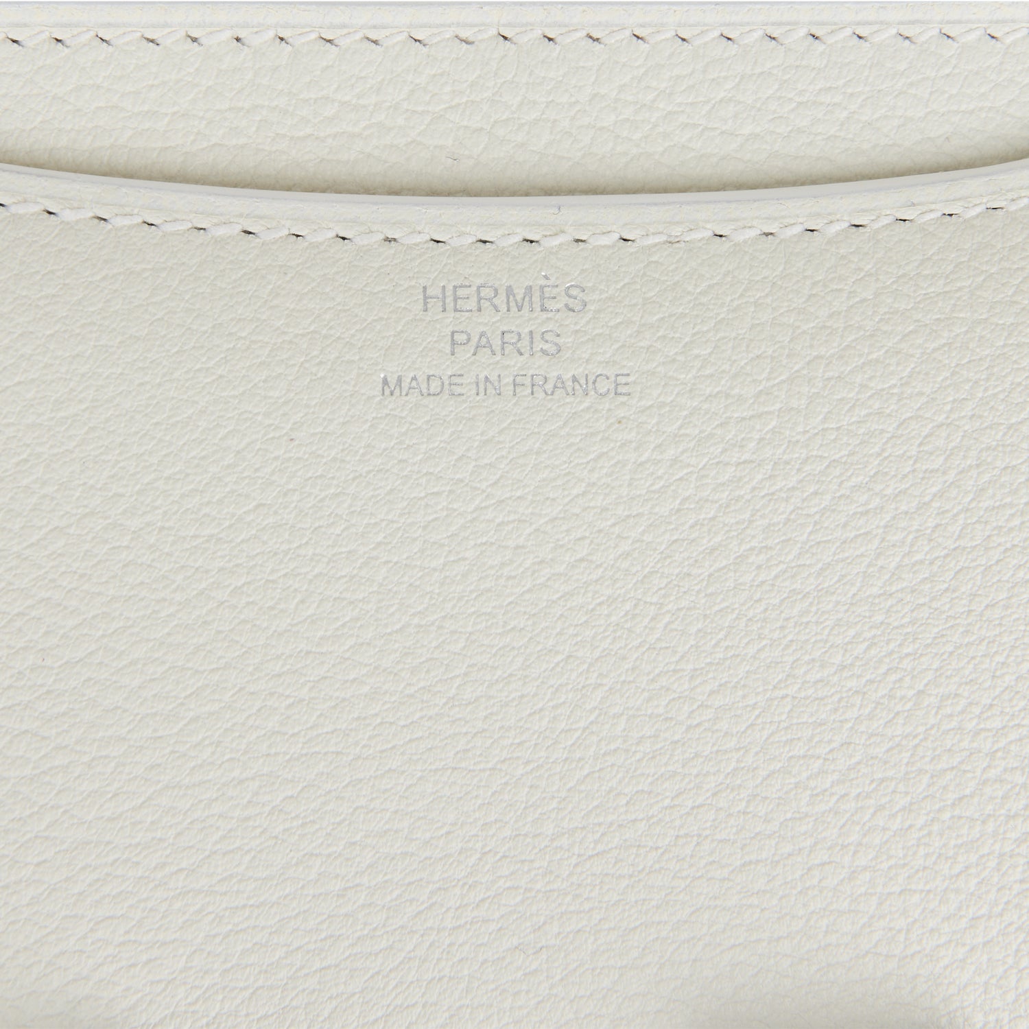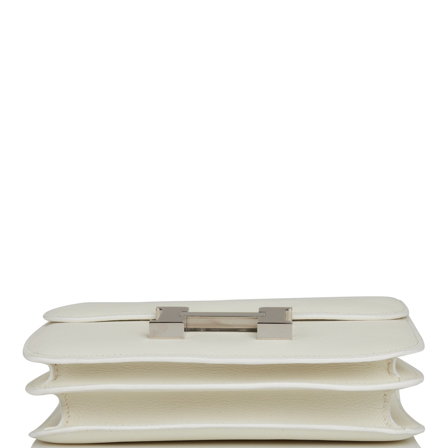 This Constance is in White evercolor leather with palladium hardware and has tonal stitching, a metal "H" snap lock closure and adjustable shoulder strap.