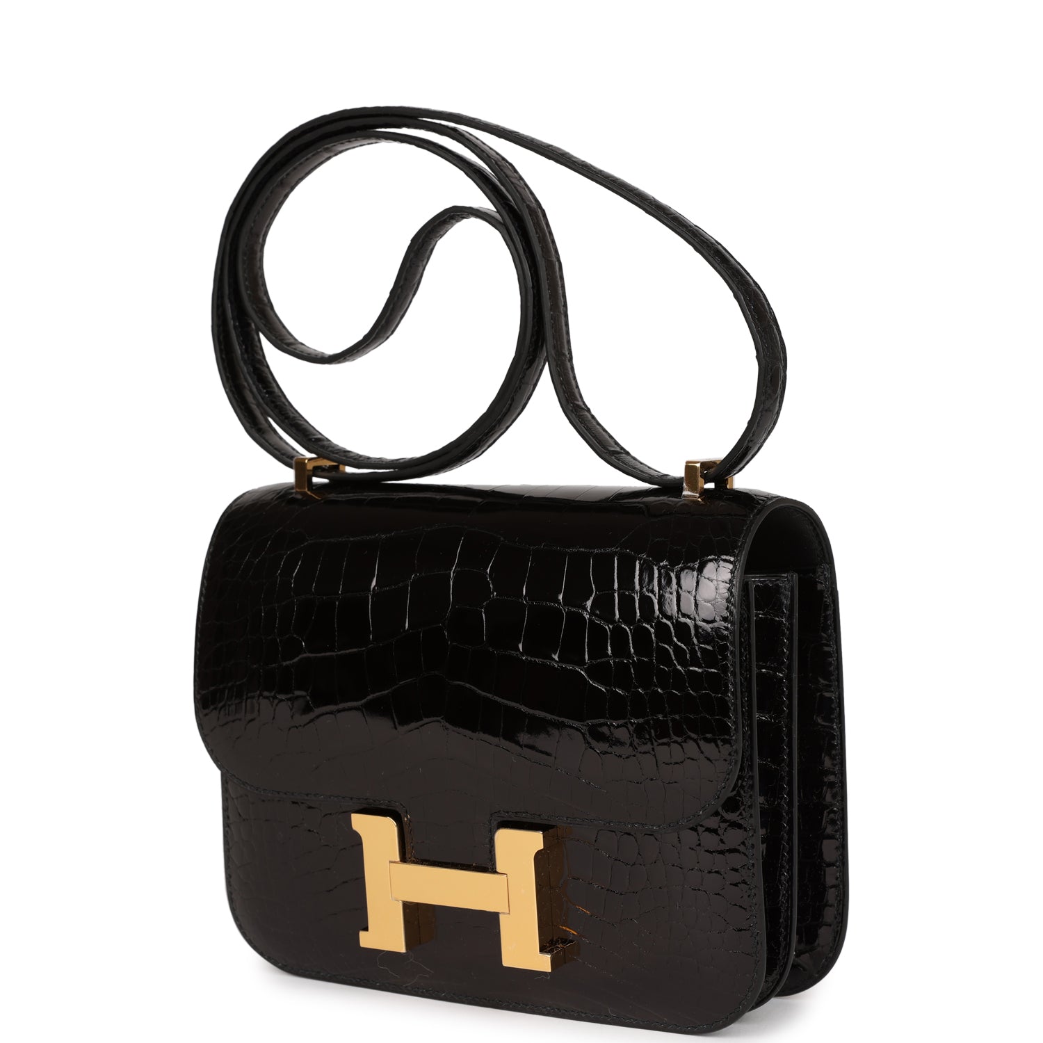 This Constance is of Black shiny Mississippiensis Alligator with gold hardware and features tonal stitching, a "H" snap lock closure, and an adjustable shoulder strap.