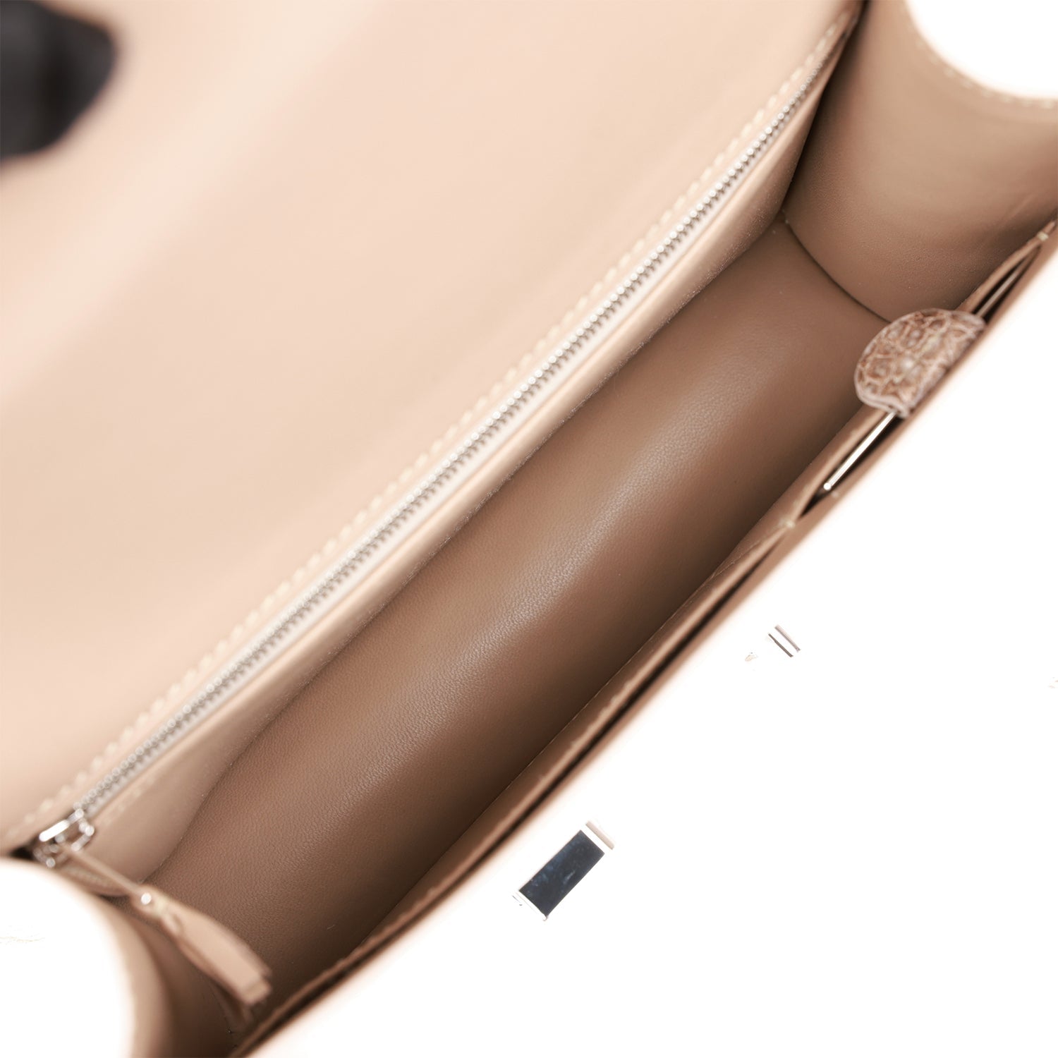 The interior is lined with Gris Perle lambskin and has two open pockets on the front wall, one with a removable mirror, and a back zip pocket.