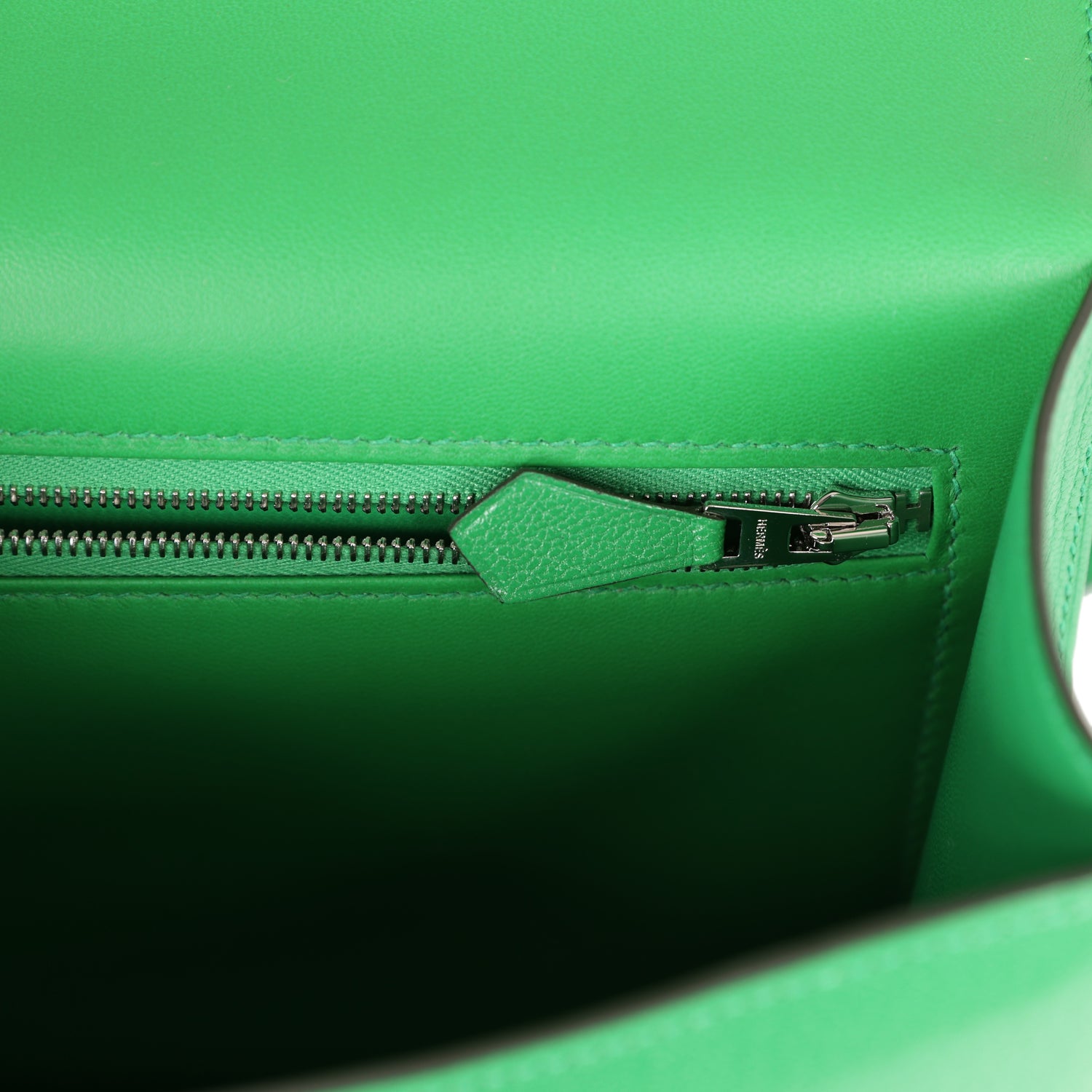 This Constance is in Bambou Chamkila Chevre with palladium hardware, has tonal stitching, a metal "H" snap lock closure and adjustable shoulder strap.