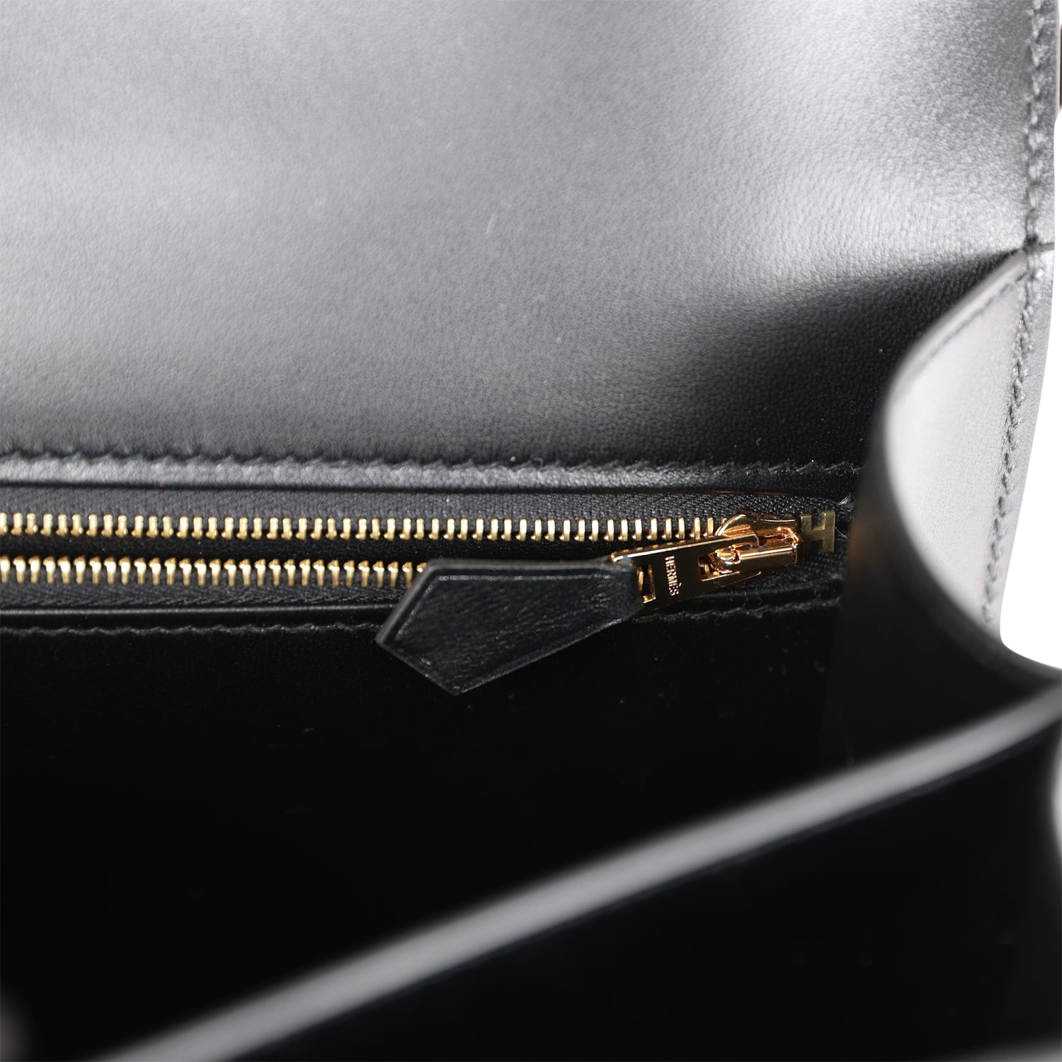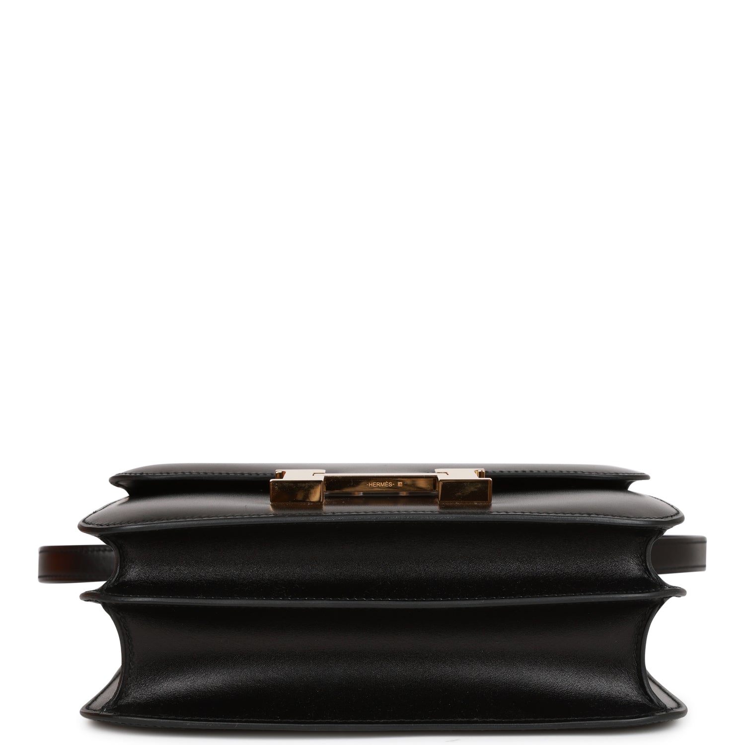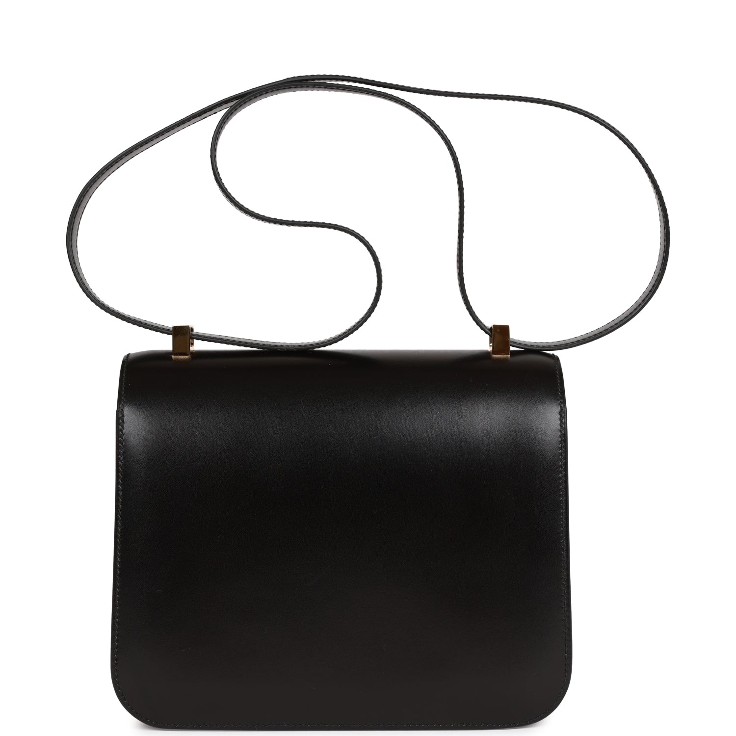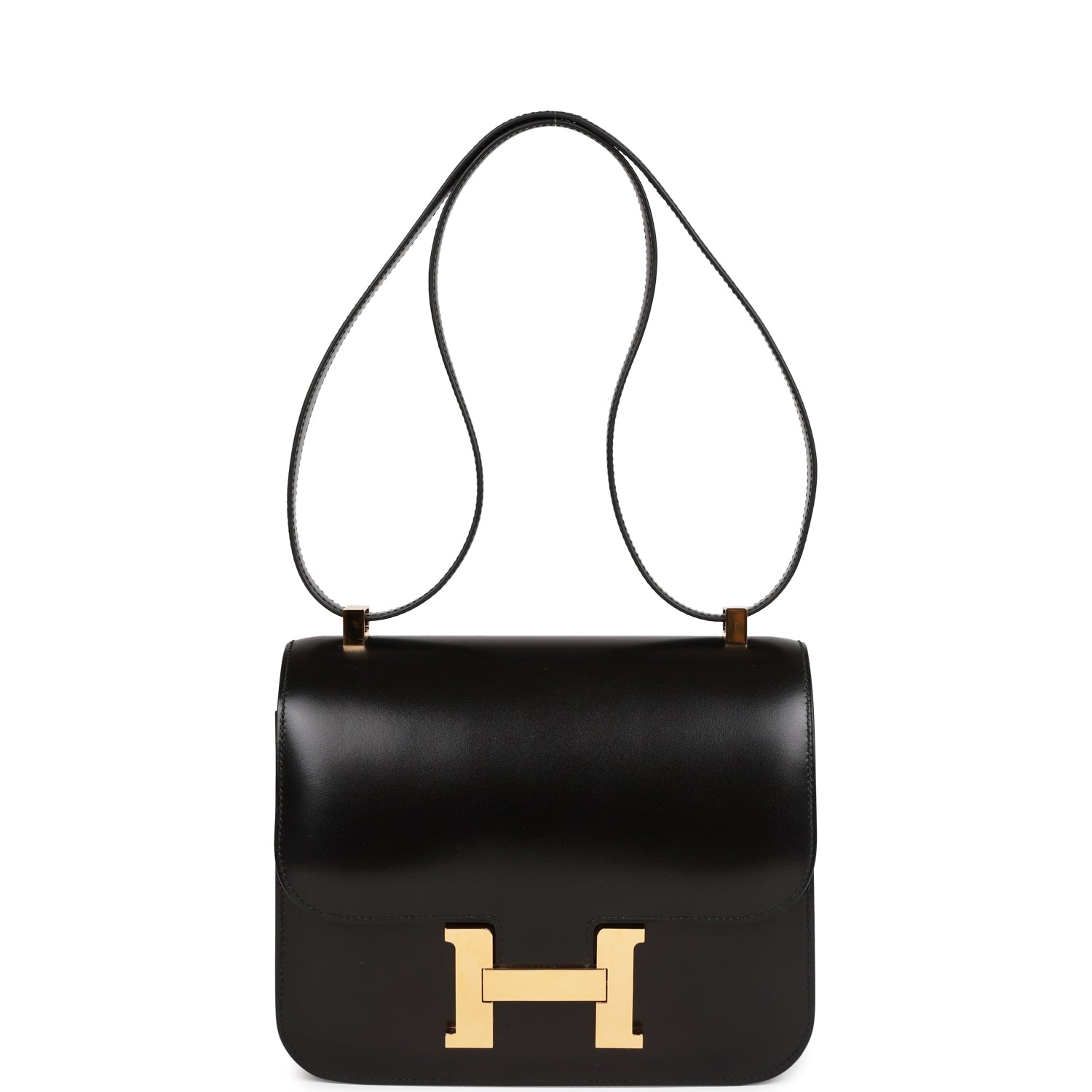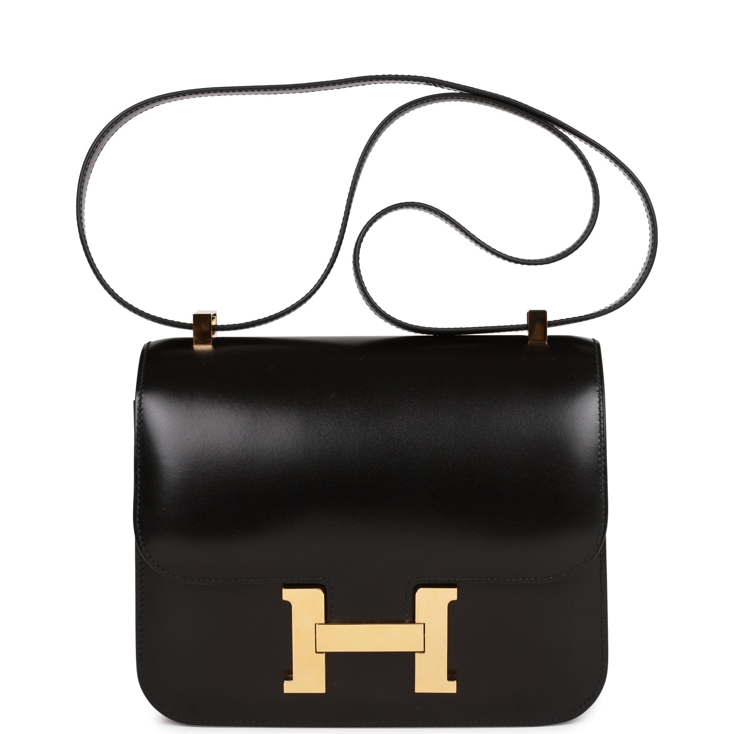 This Constance is in black box leather with gold hardware and has tonal stitching, a metal "H" snap lock closure, and adjustable shoulder strap.