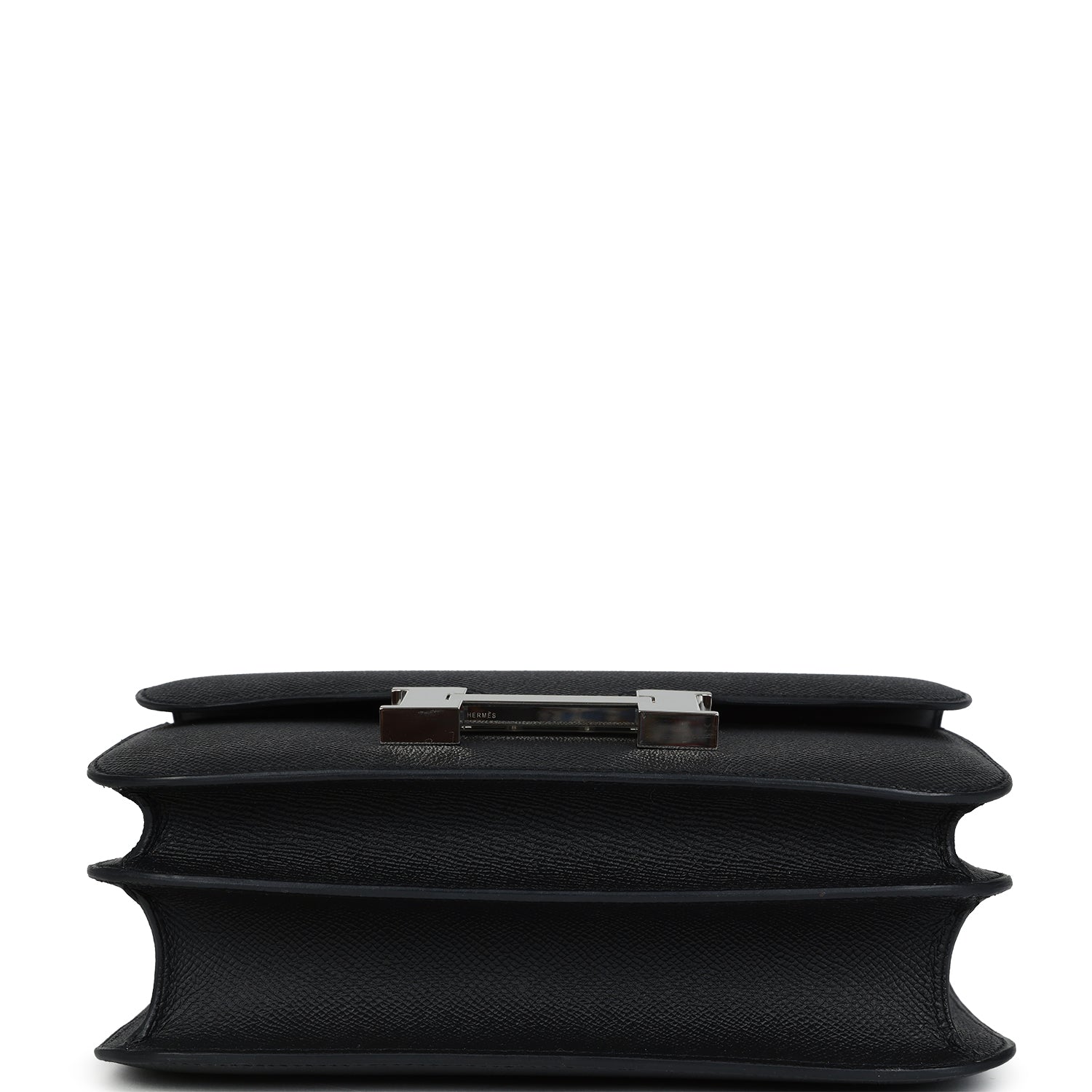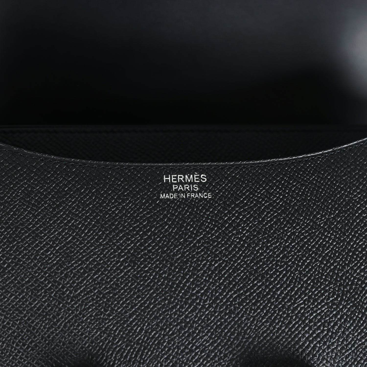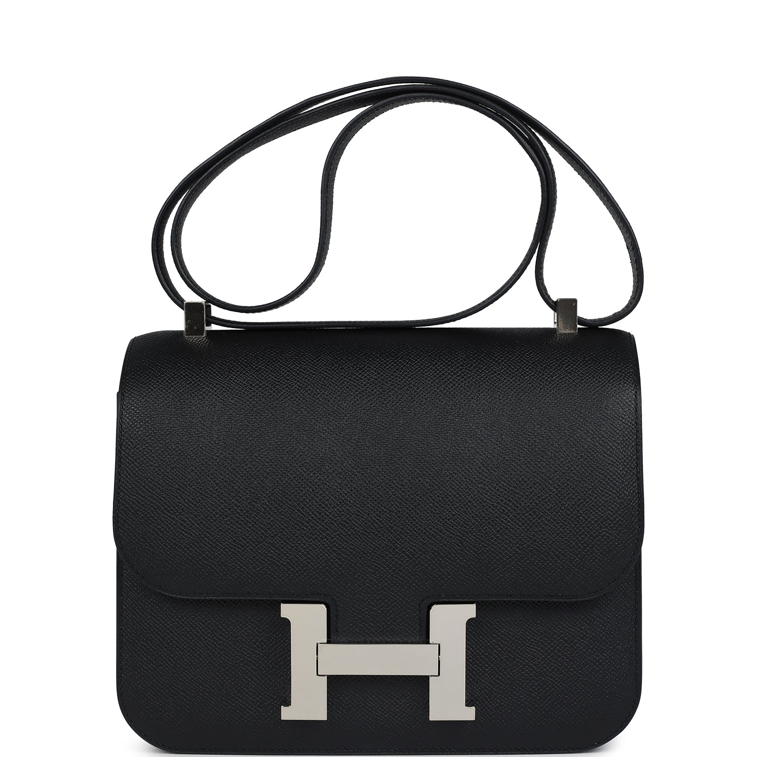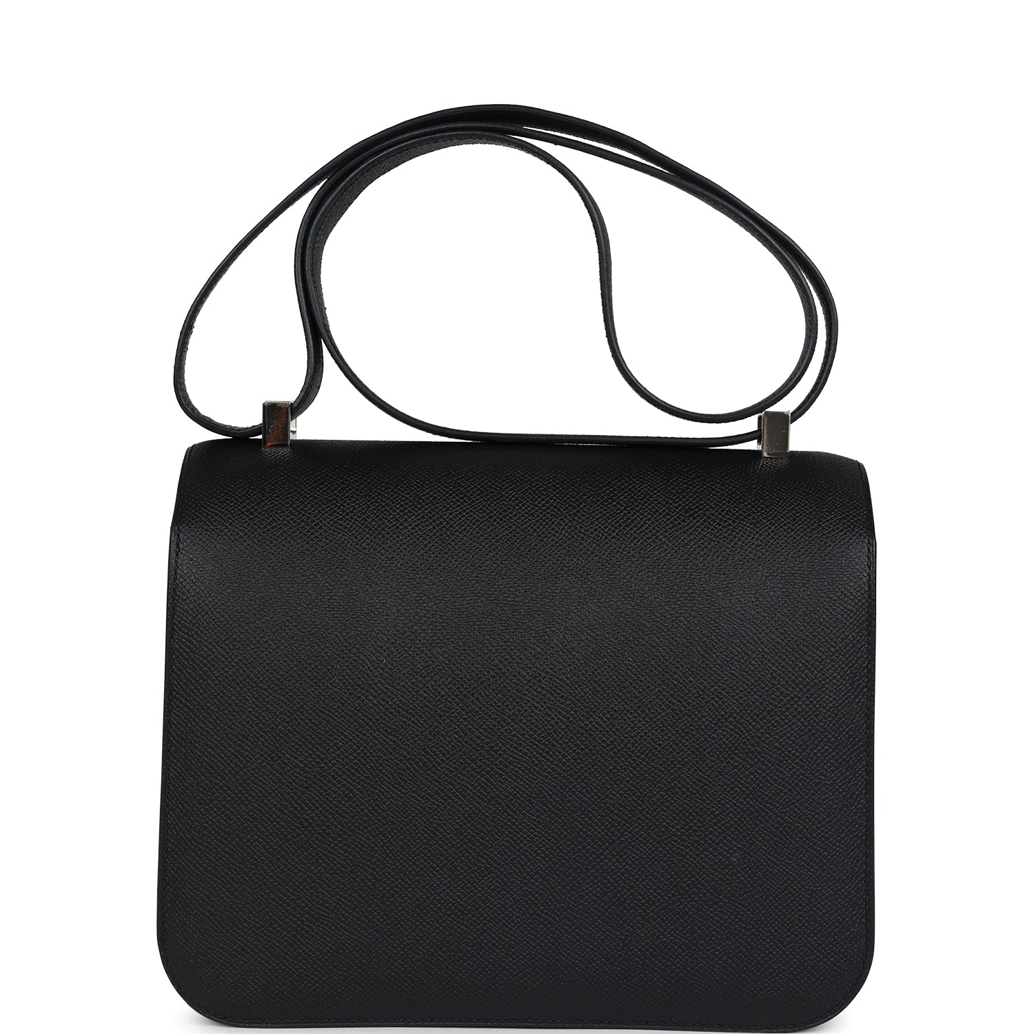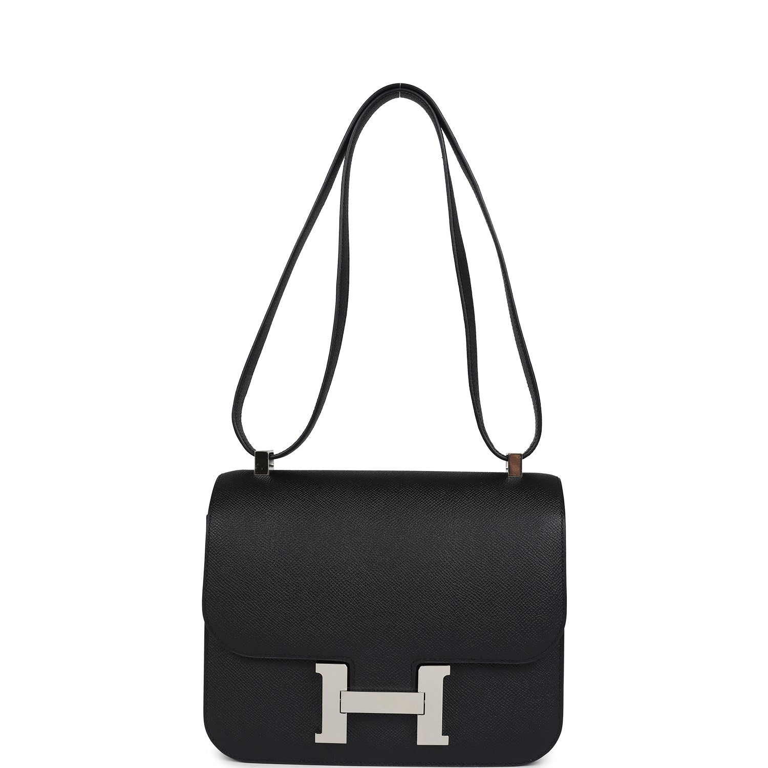 This Constance, is in Black epsom leather with palladium hardware and features tonal stitching, a "H" snap lock closure, and an adjustable shoulder strap.