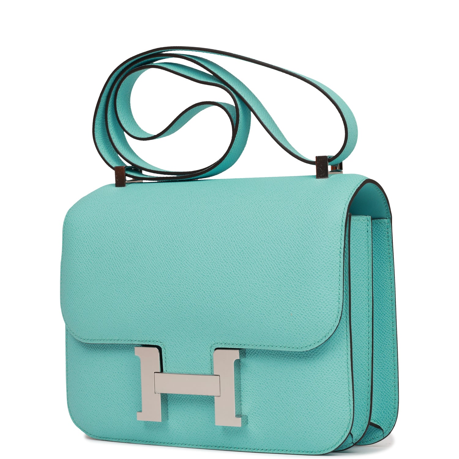 This Constance is in Bleu Atoll epsom leather with palladium hardware and has tonal stitching, a metal "H" snap lock closure, and adjustable shoulder strap.
