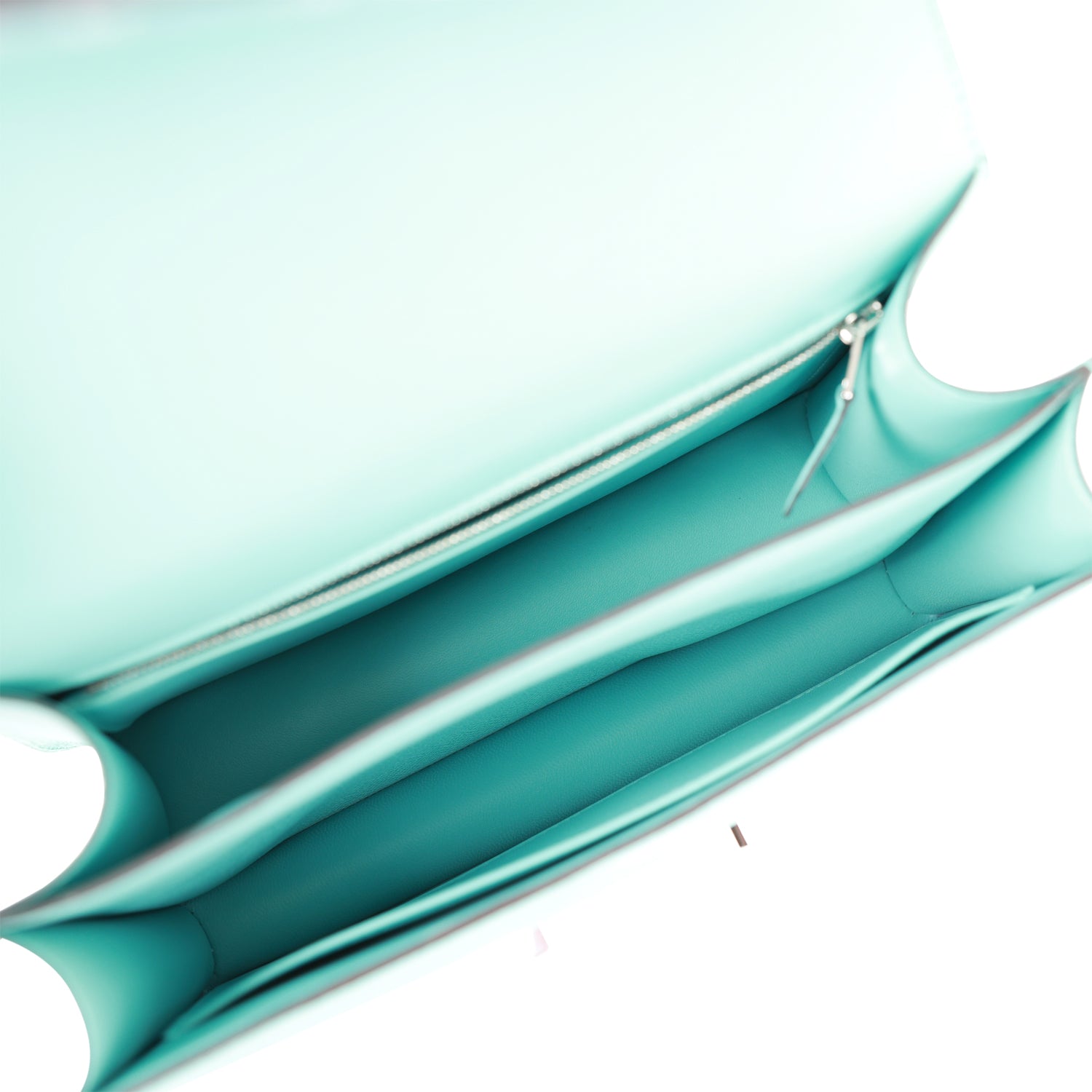 The interior is lined with Bleu Atoll lambskin leather and has a zip pocket with an Hermes engraved pull.