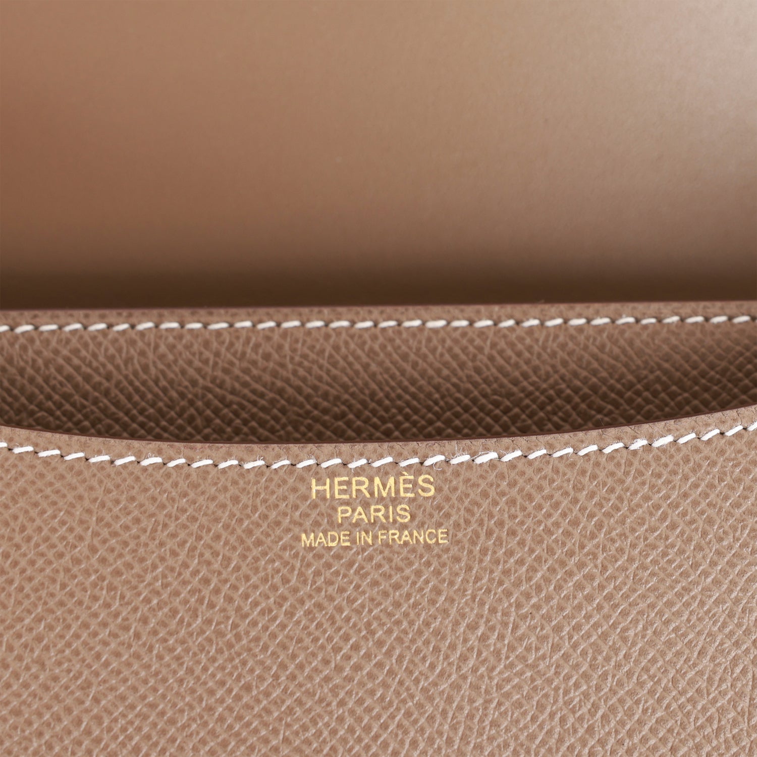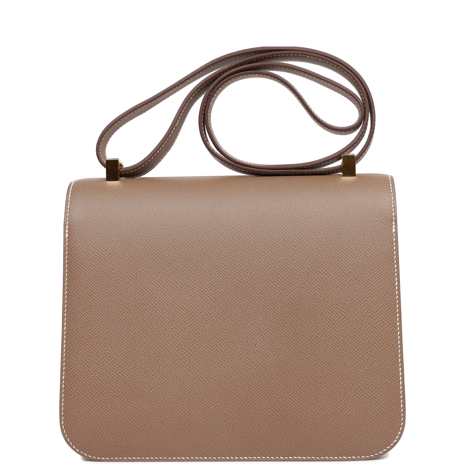 This Constance is in Etoupe epsom leather with gold hardware and has contrast stitching, a metal "H" snap lock closure, and adjustable shoulder strap.
