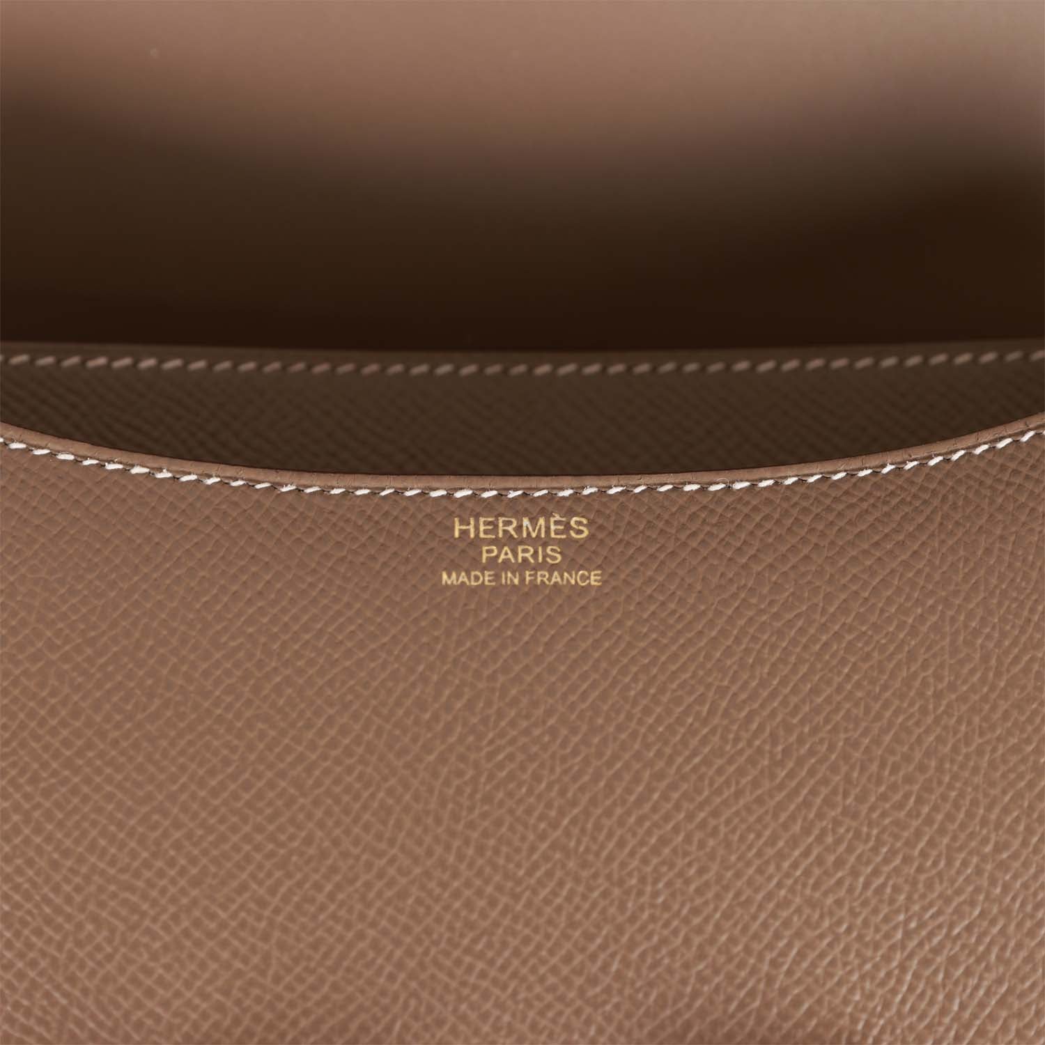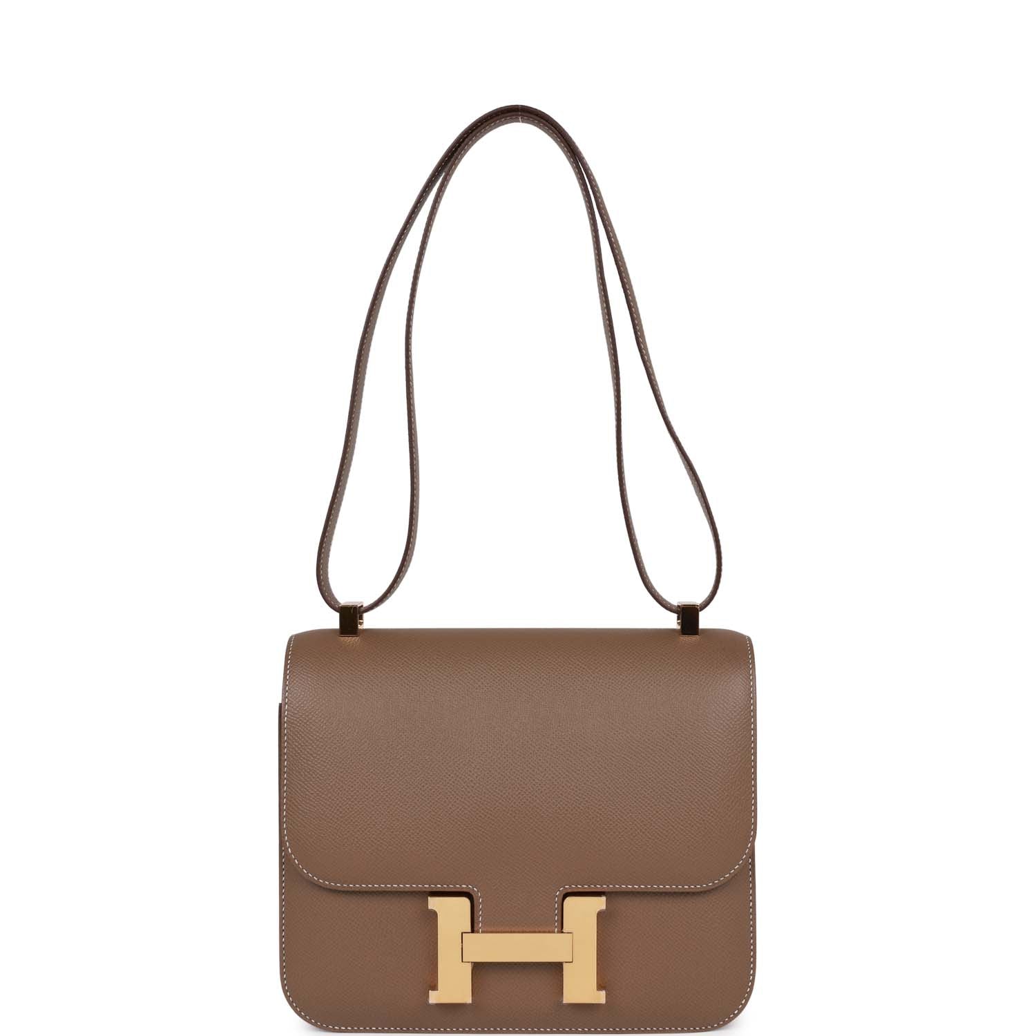 This Constance is in Etoupe epsom leather with gold hardware and has contrast stitching, a metal "H" snap lock closure, and adjustable shoulder strap.