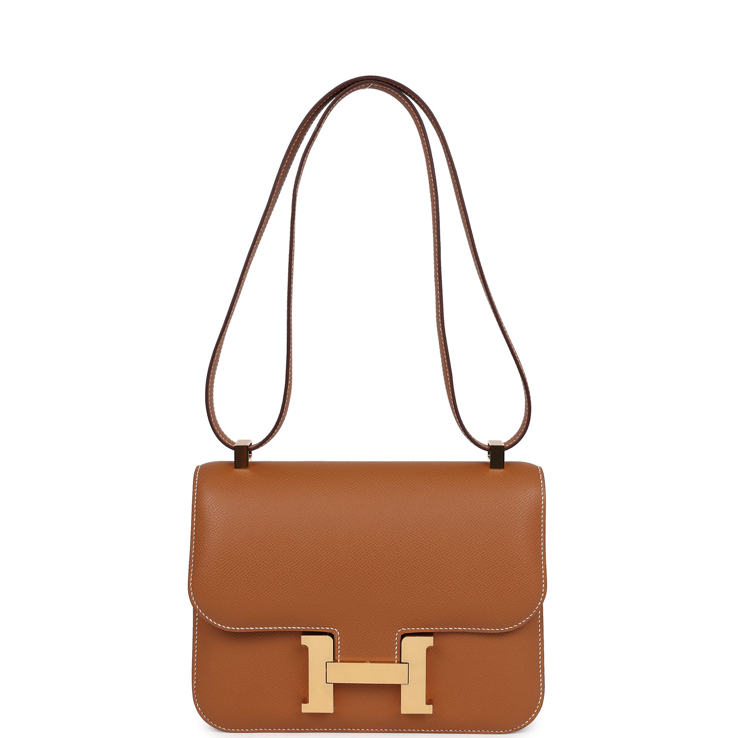 This Constance is in Gold epsom leather with gold hardware and has contrast stitching, a metal "H" snap lock closure and adjustable shoulder strap.