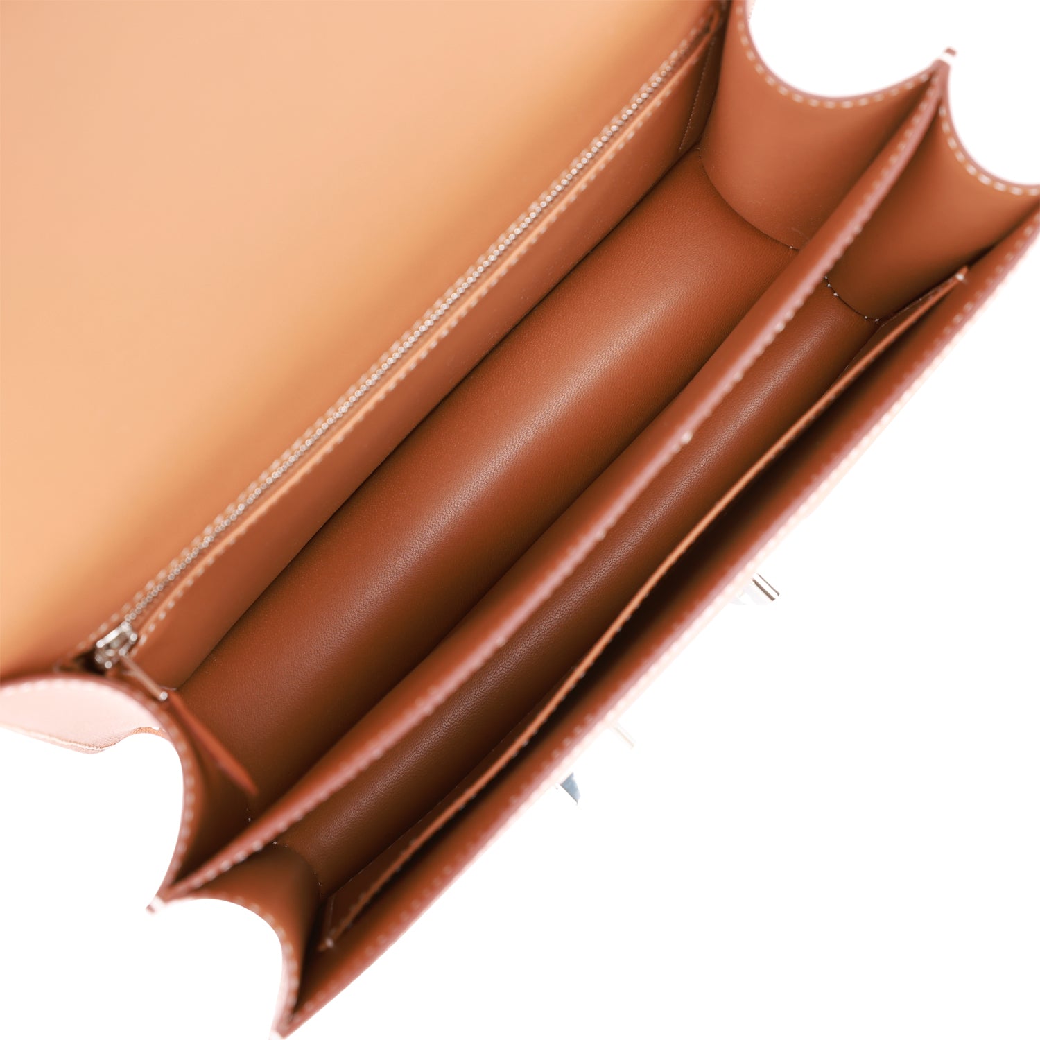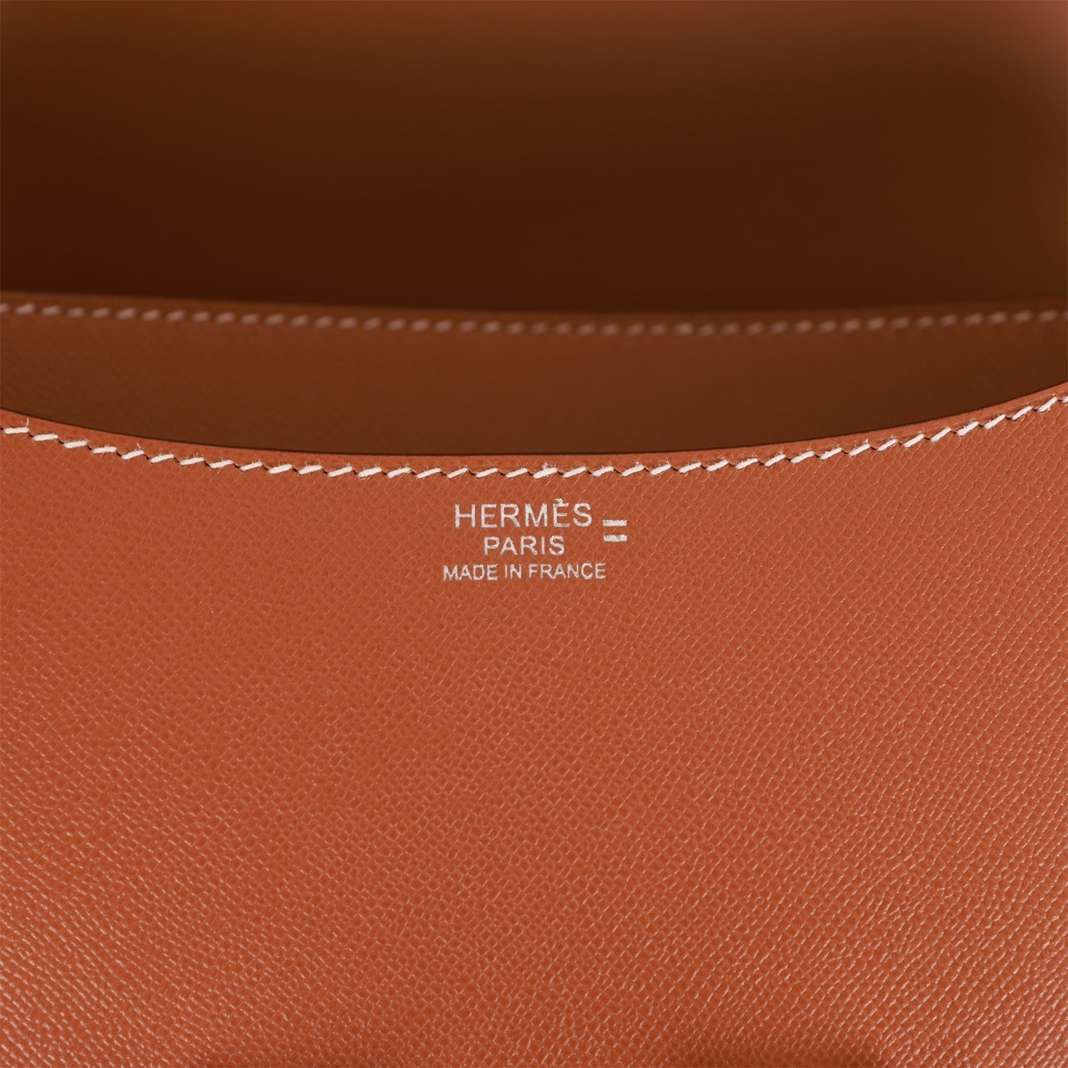The interior is lined with gold lambskin leather and has a zip pocket with an Hermes engraved pull.
