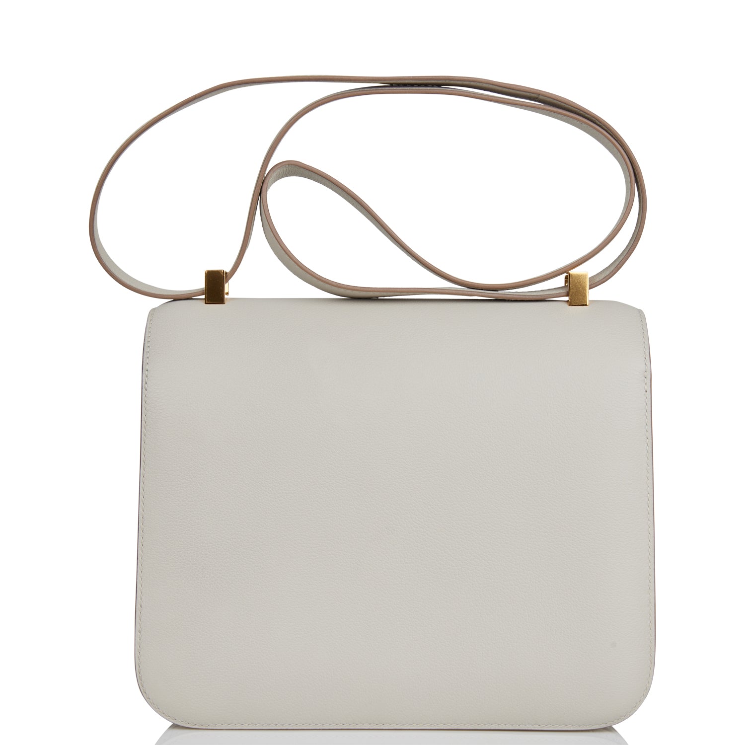 This Constance is in Gris Perle evercolor leather with gold hardware and has tonal stitching, a metal "H" snap lock closure, and adjustable shoulder strap.