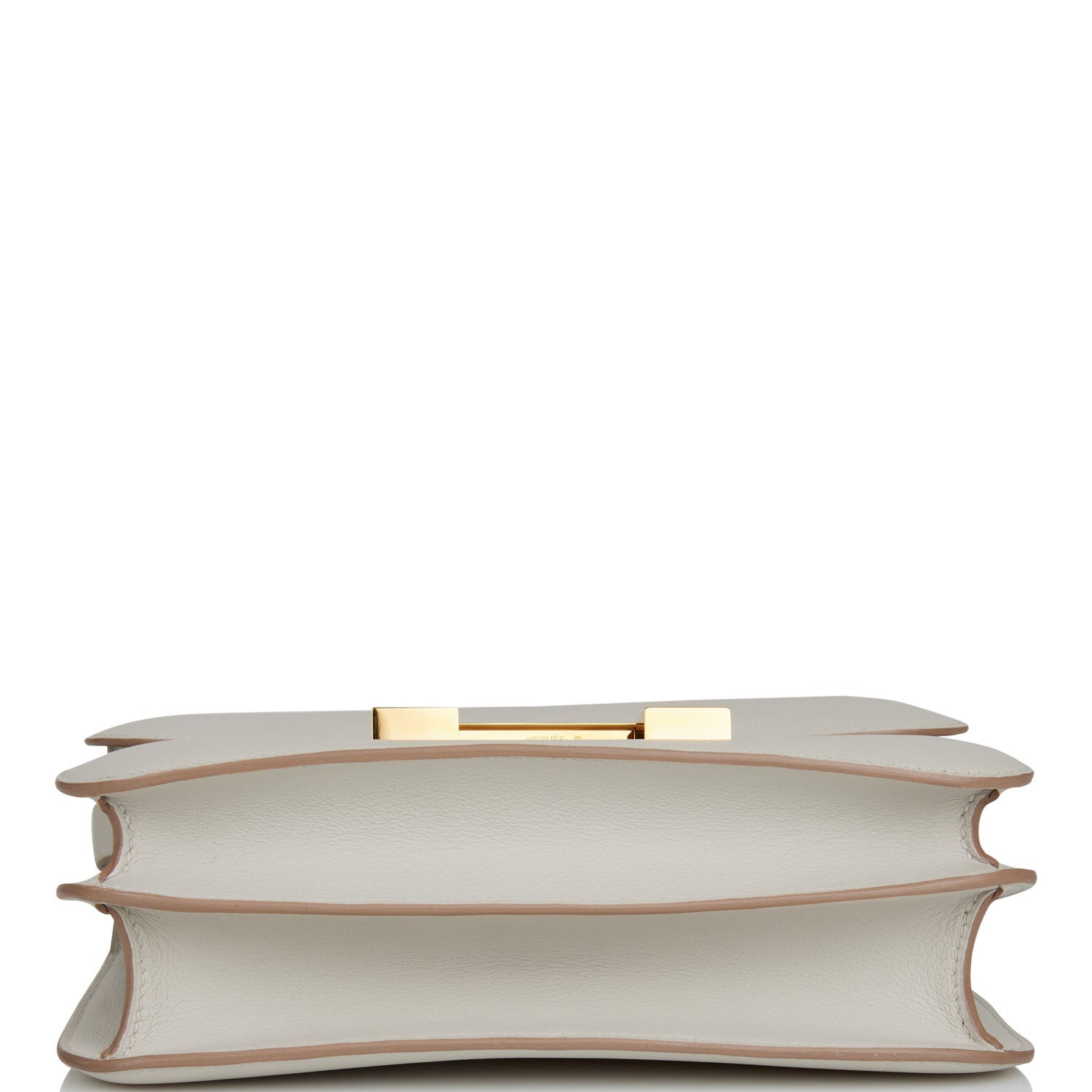 The interior is lined with Gris Perle lambskin leather and has a zip pocket with an Hermes engraved pull.