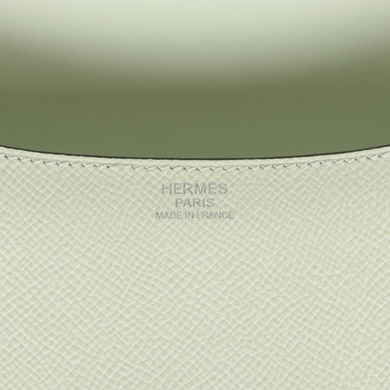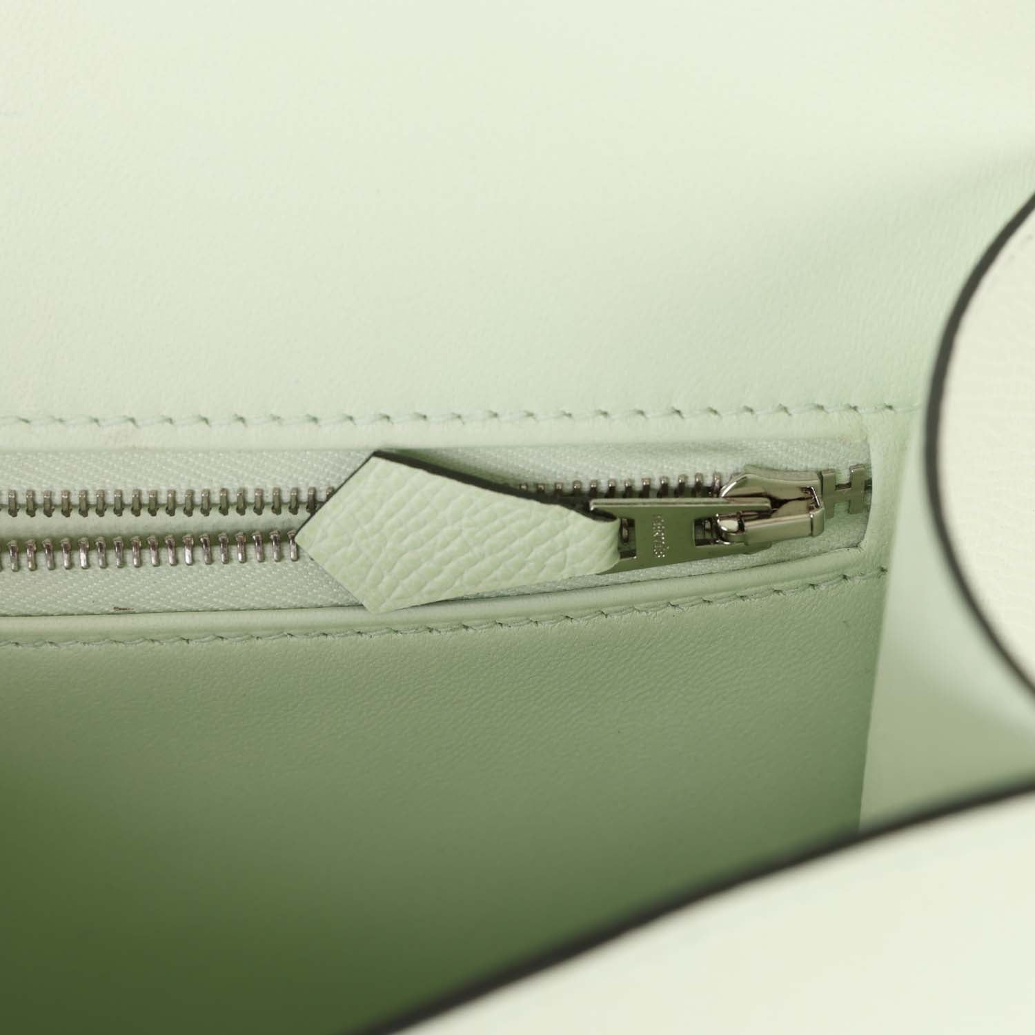 The interior is lined with Vert Fizz lambskin leather and has a zip pocket with an Hermes engraved pull, two slip pockets and a removable mirror.