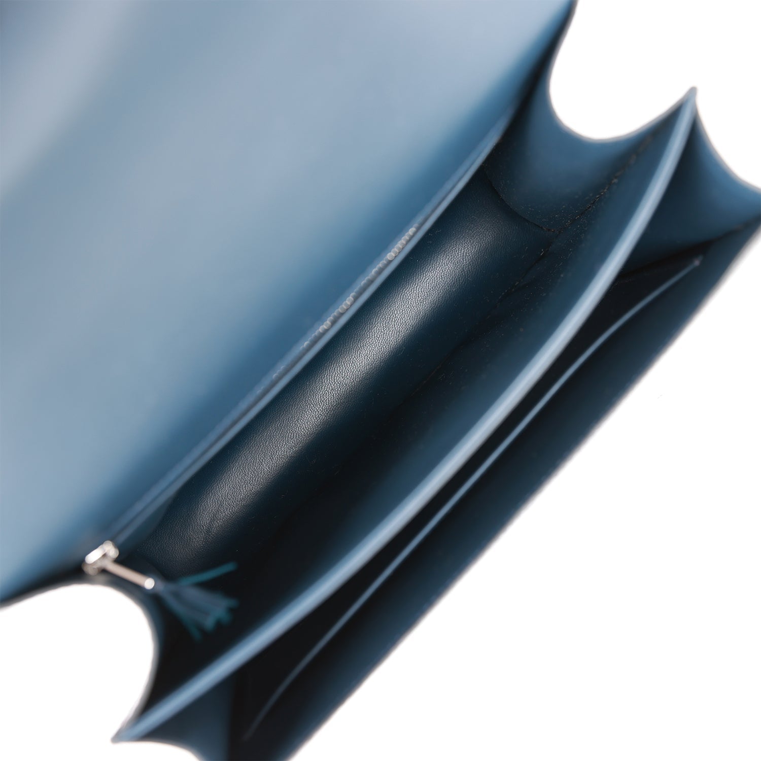 The interior is lined with Bleu Baltique lambskin and has an open pocket on the front wall, two main compartments, back zip pocket and a slit pocket on the back wall.