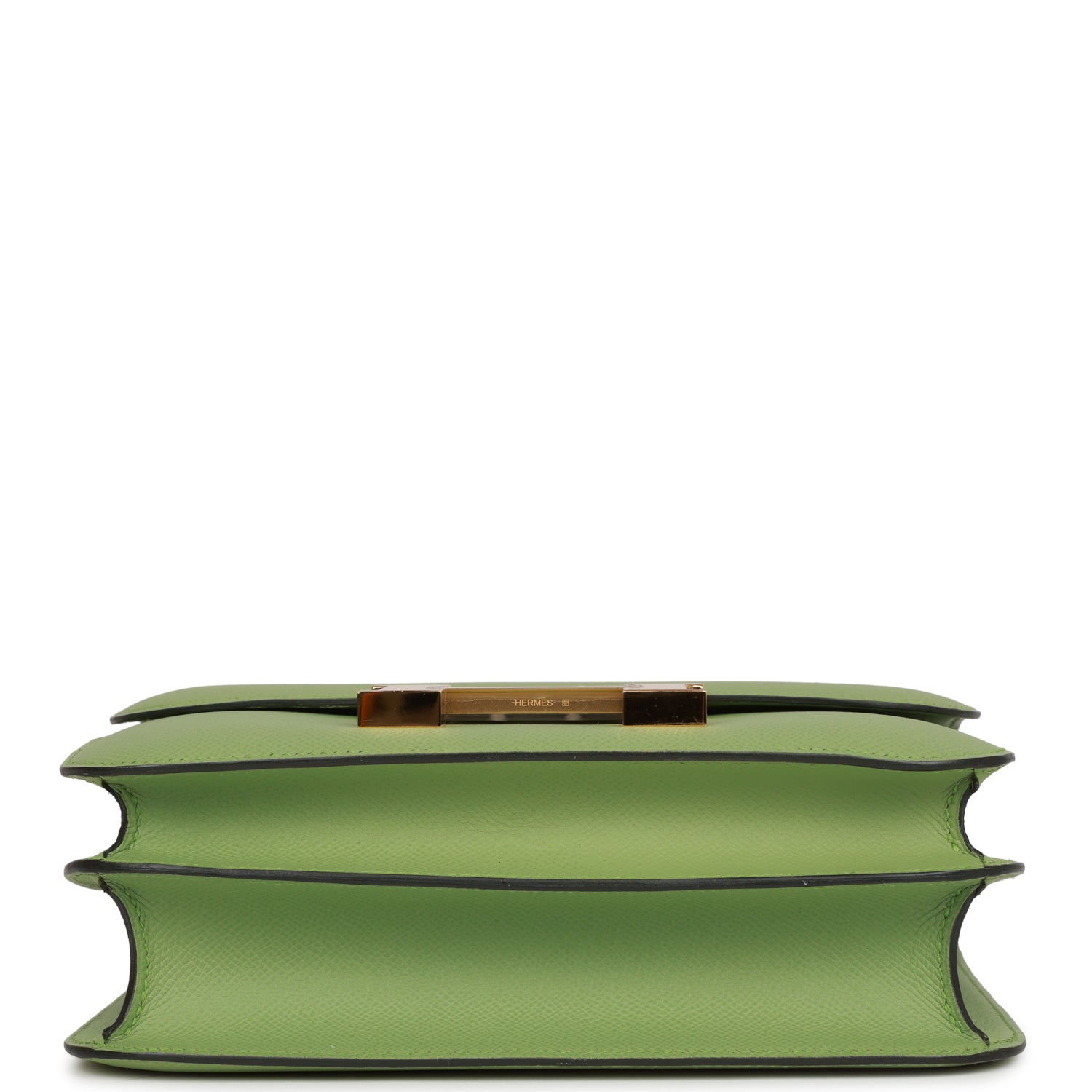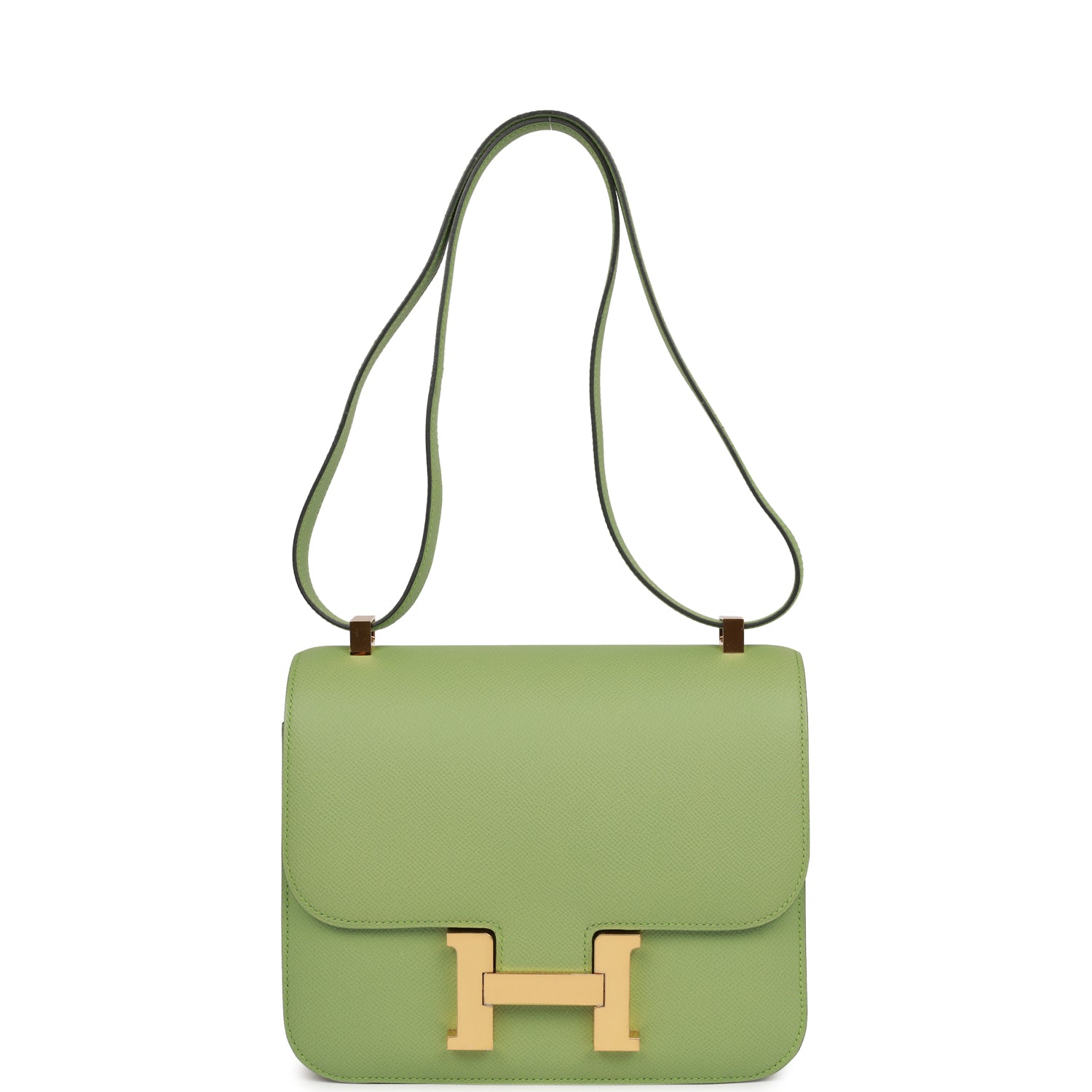 This Constance is in Vert Criquet epsom leather with gold hardware and has tonal stitching, a metal "H" snap lock closure, and adjustable shoulder strap.