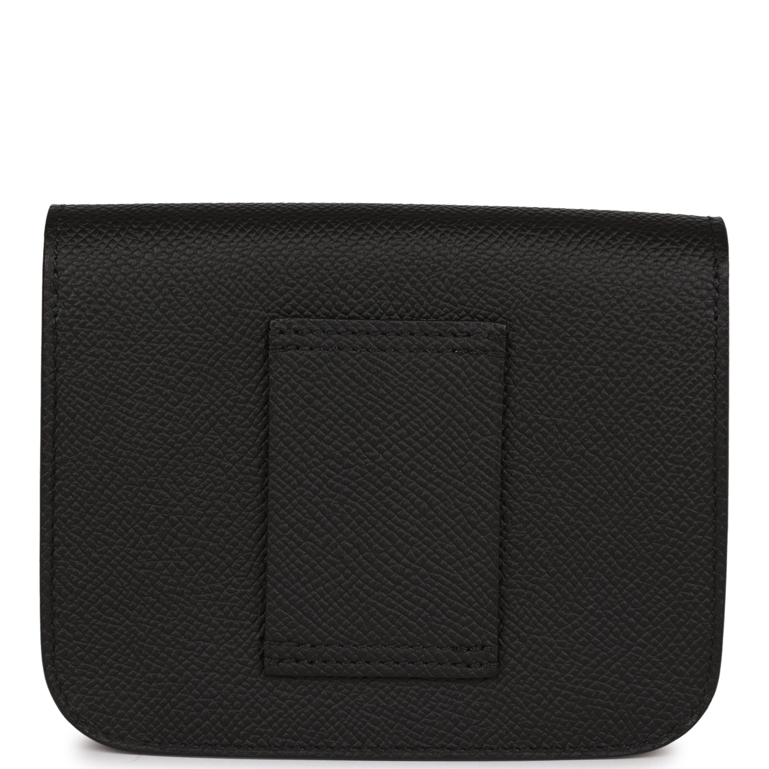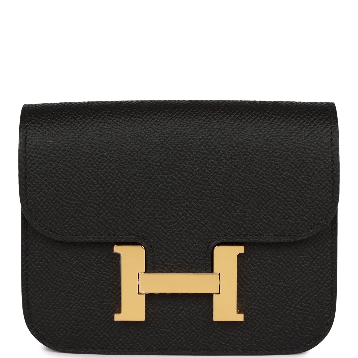 This Constance Slim Wallet is in Black Epsom leather with gold hardware and has tonal stitching, rear belt loop, front flap and removable coin pouch.