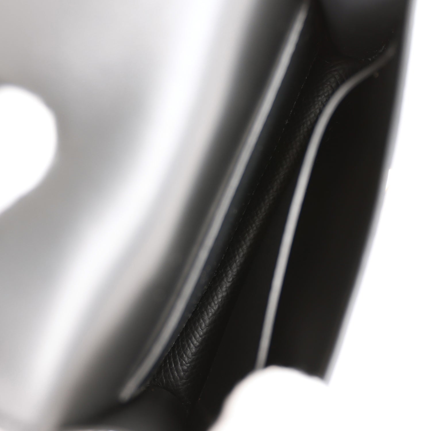 The interior is lined with black leather and features one slip pocket on the rear wall and one on the front wall pocket with snap "H" lock closure.