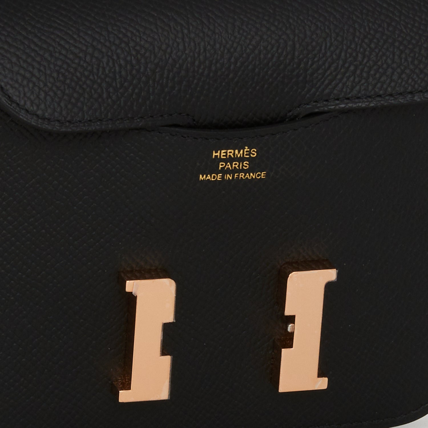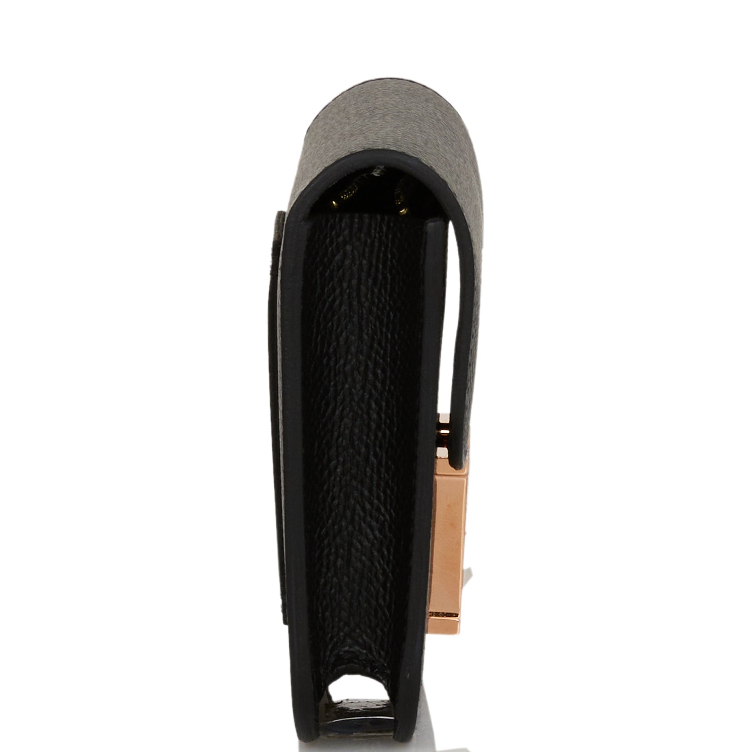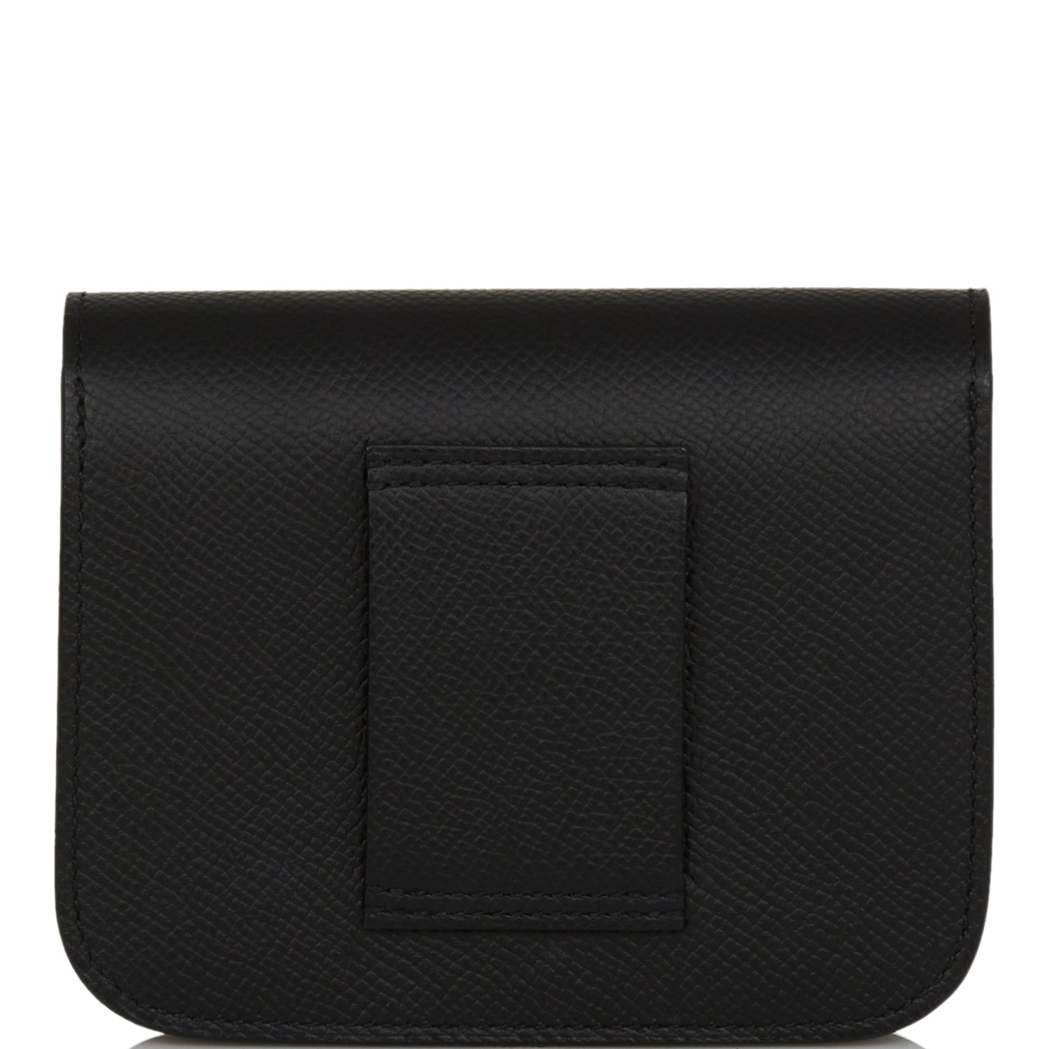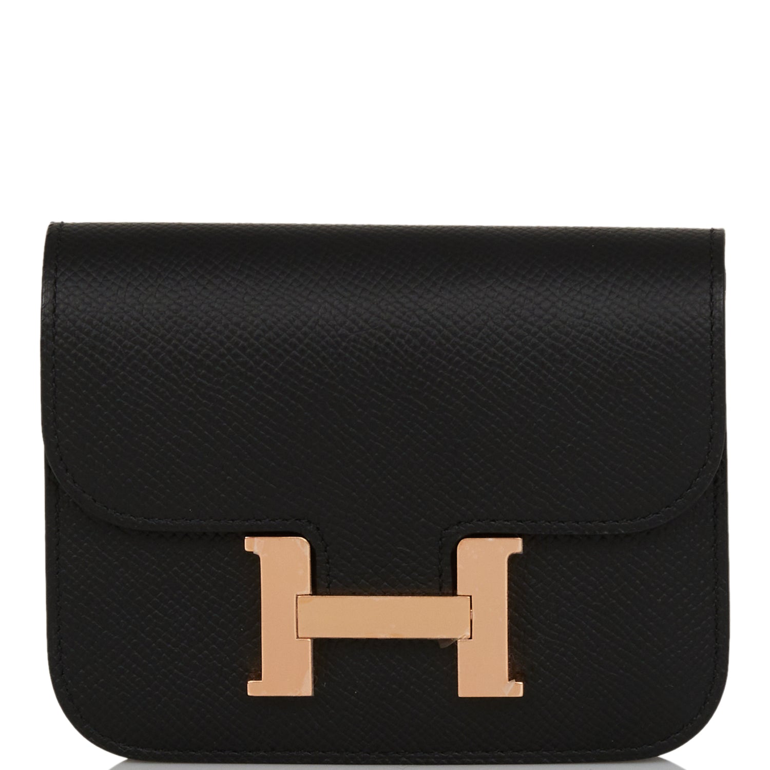 This Constance Slim Wallet is in black epsom leather with rose gold hardware and has tonal stitching, rear belt loop, front flap and removable coin pouch.