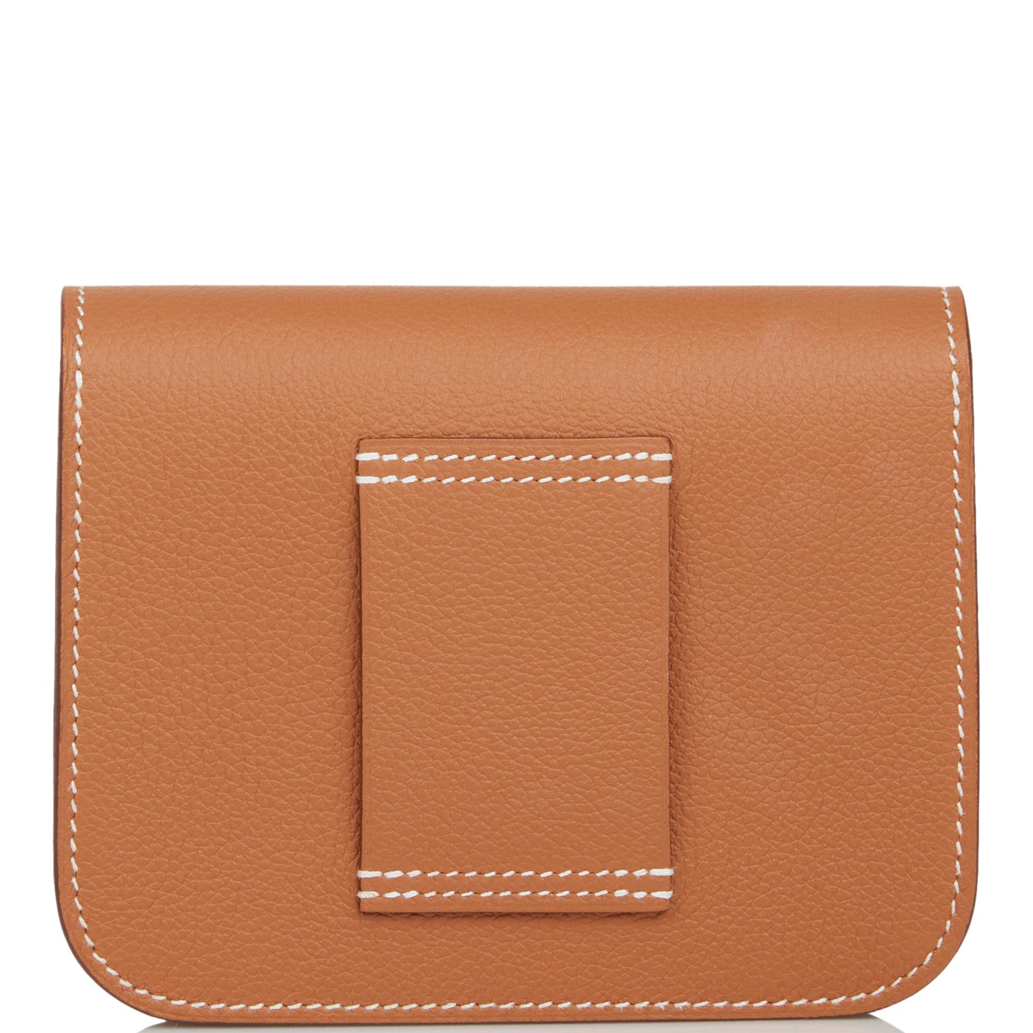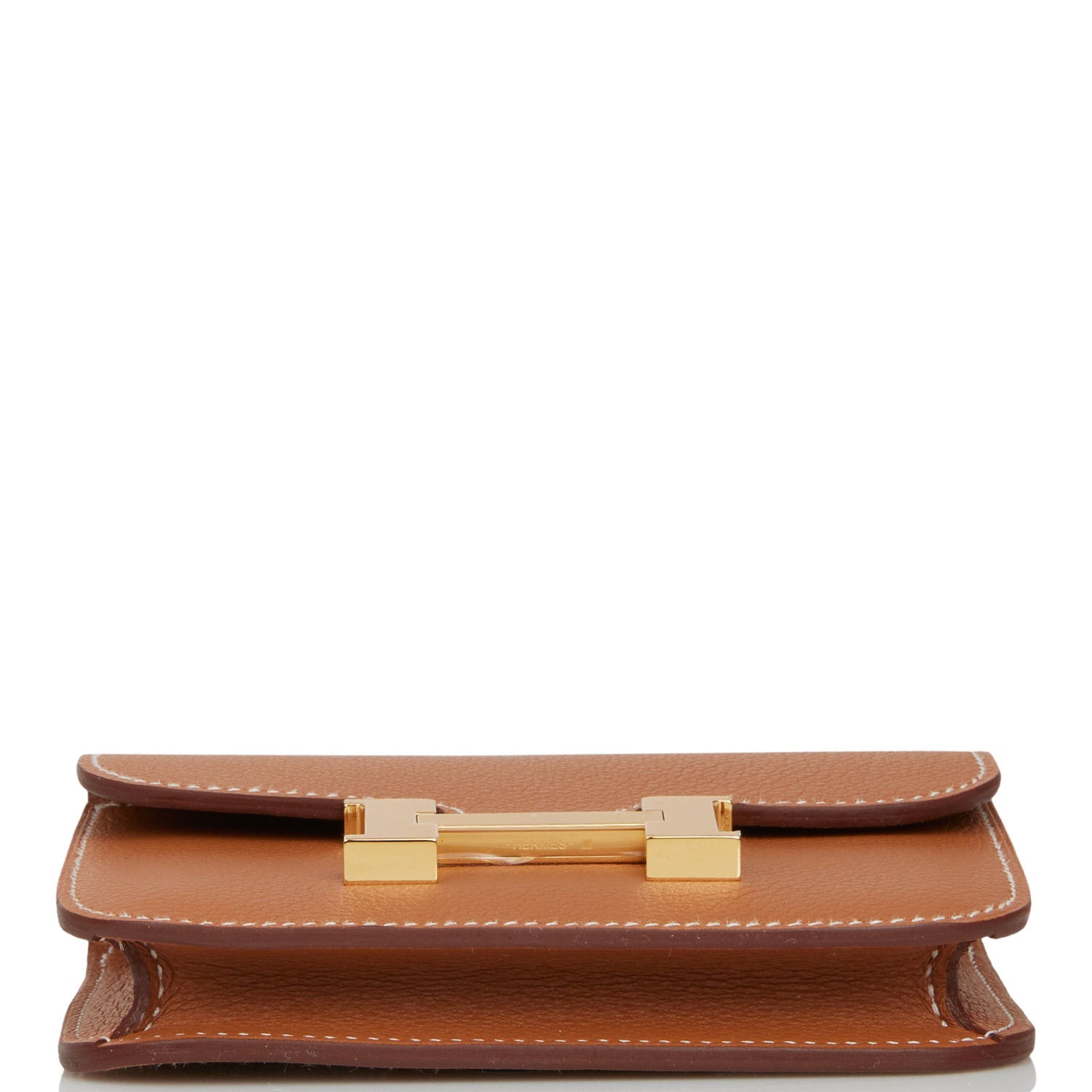 This Constance Slim Wallet is in Gold evercolor leather with gold hardware and has contrast stitching, rear belt loop, front flap and removable coin pouch.
