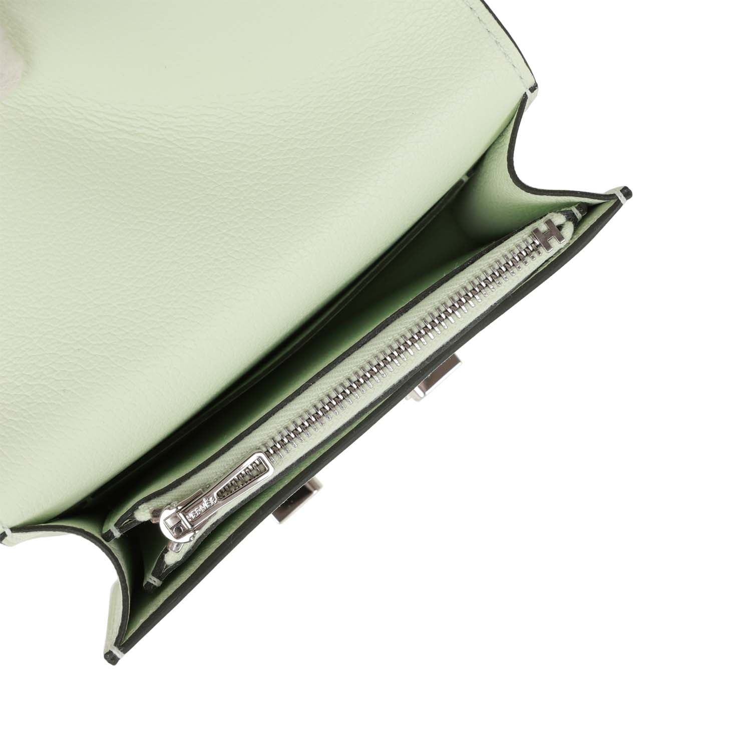The interior is lined with Vert Fizz leather and features one slip pocket on the rear wall and one on the front wall.