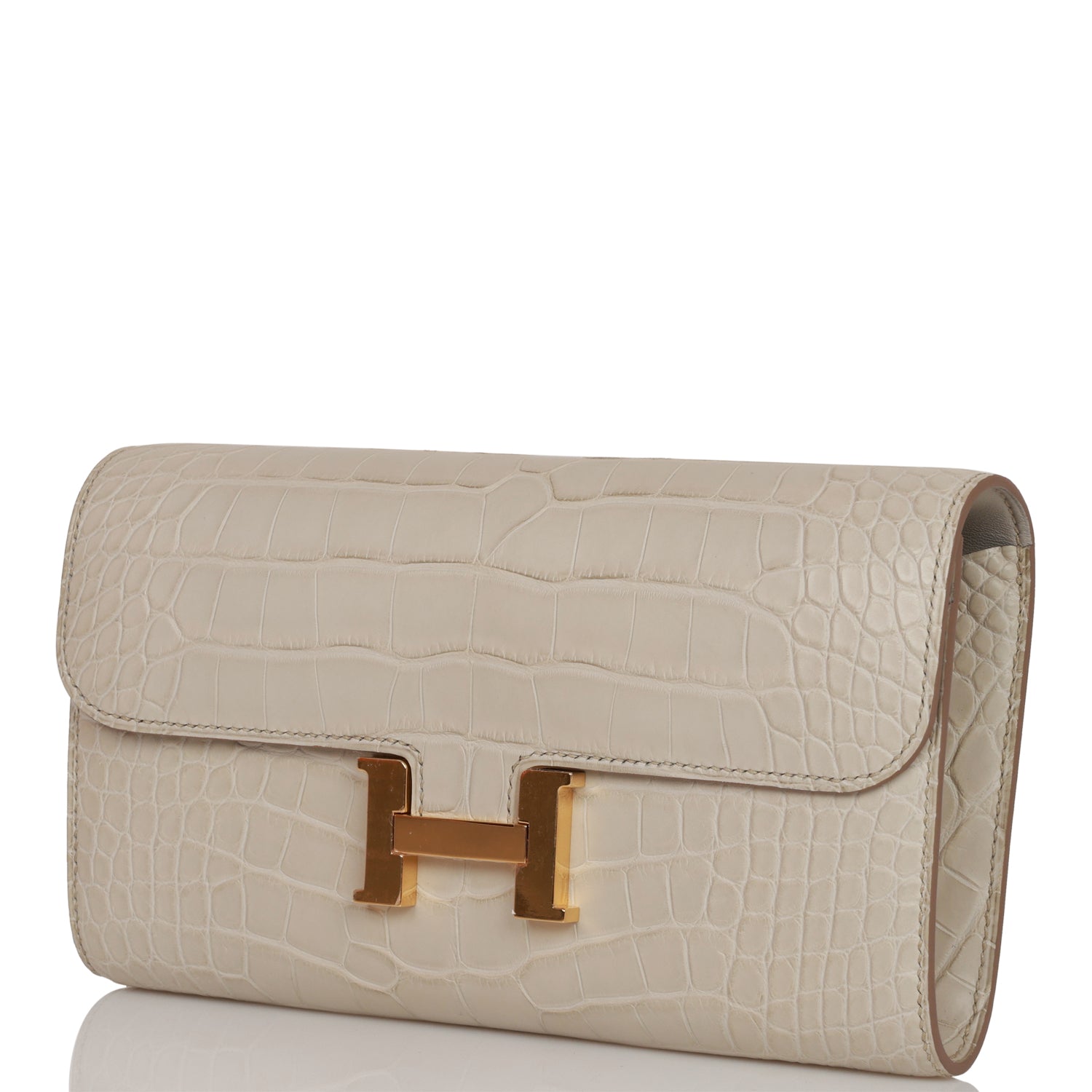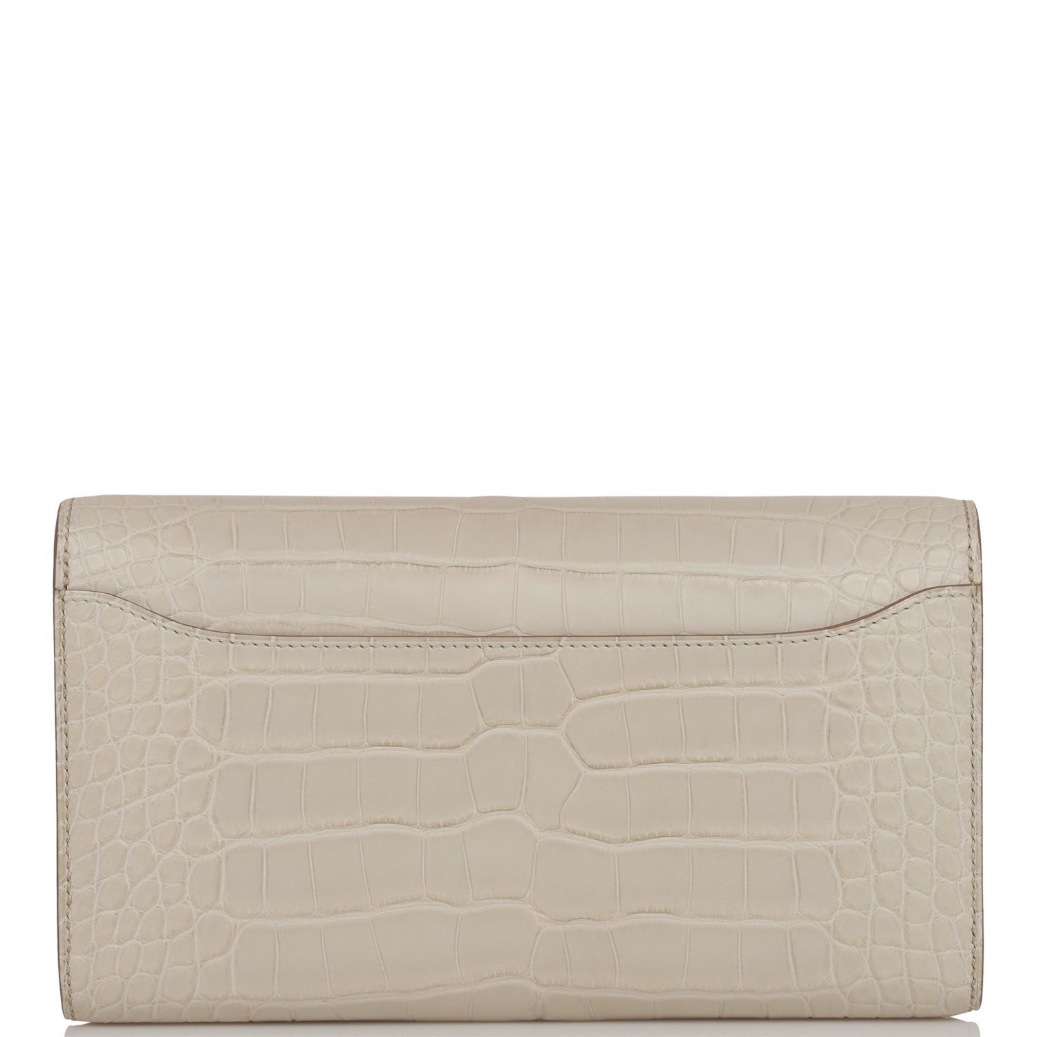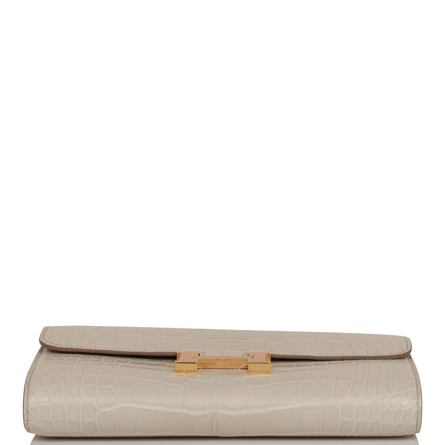 This Constance Wallet To Go is in Beton matte alligator with gold hardware and has tonal stitching, metal "H" snap lock closure, open front compartment and removable crossbody strap.