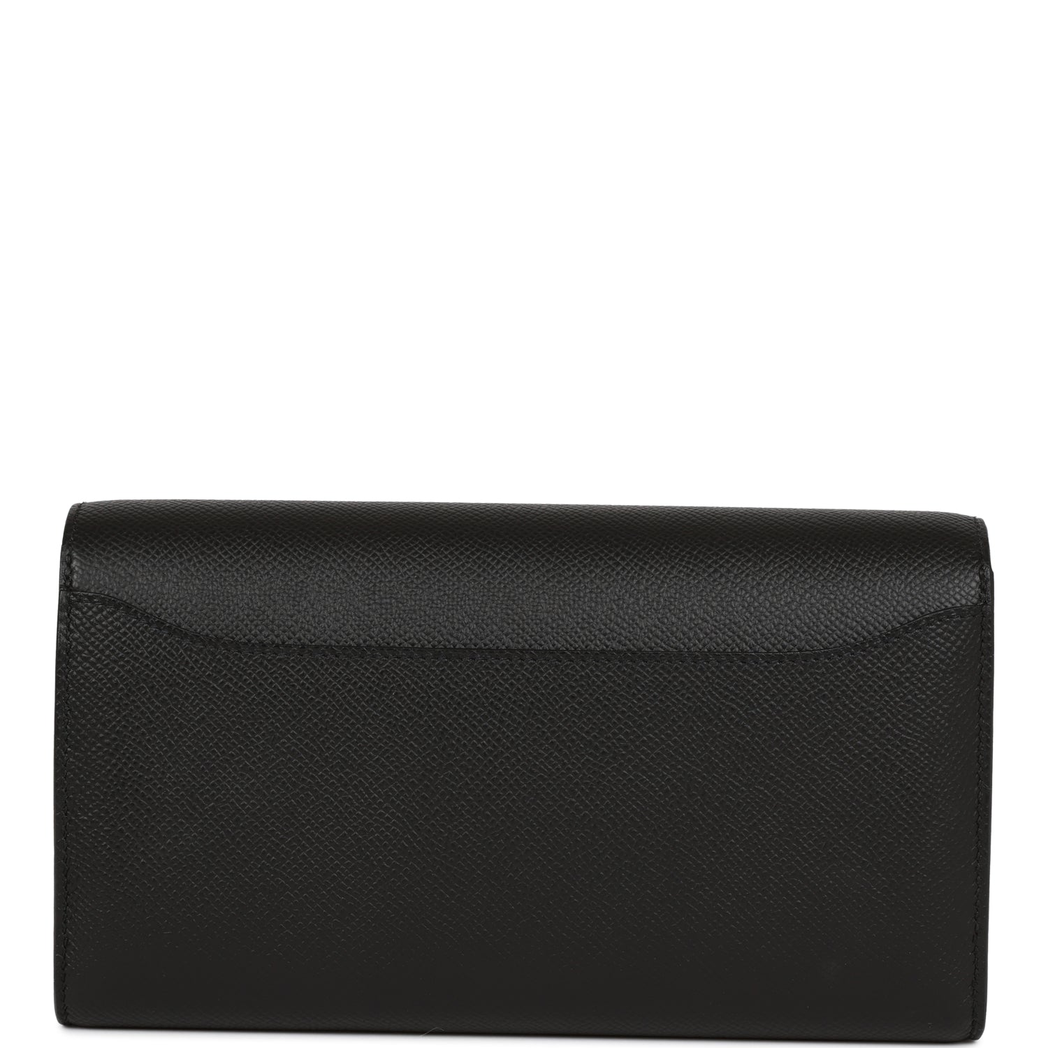 This Constance Wallet To Go is in Black epsom leather with gold hardware and has tonal stitching, metal "H" snap lock closure, open front compartment and removable crossbody strap.