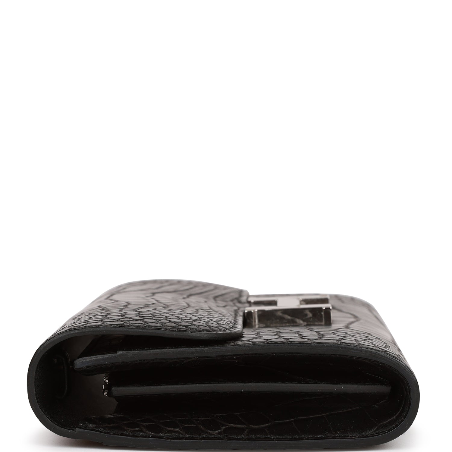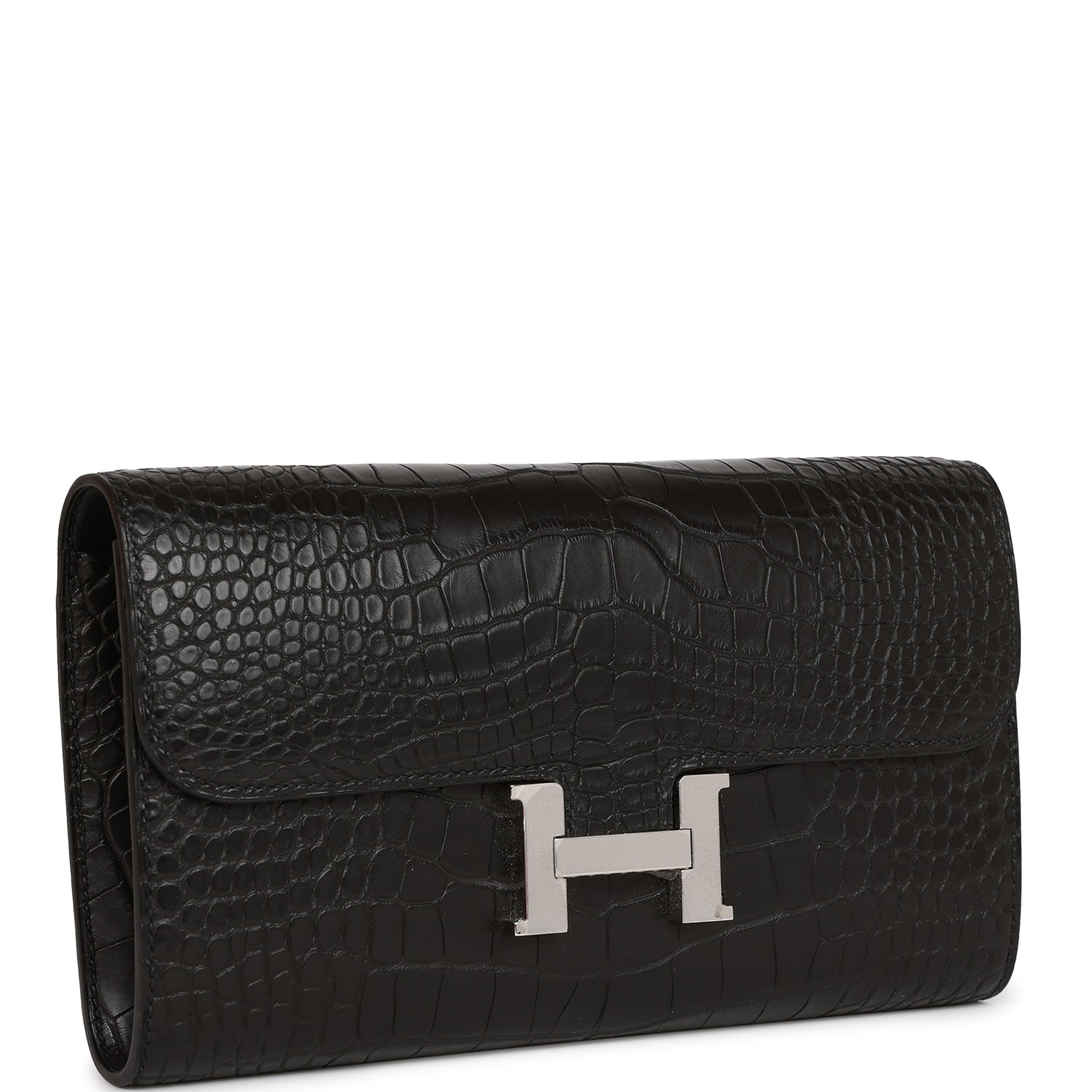 This Constance Wallet To Go is in black matte alligator with palladium hardware and has tonal stitching, metal "H" snap lock closure, open front compartment and removable crossbody strap.