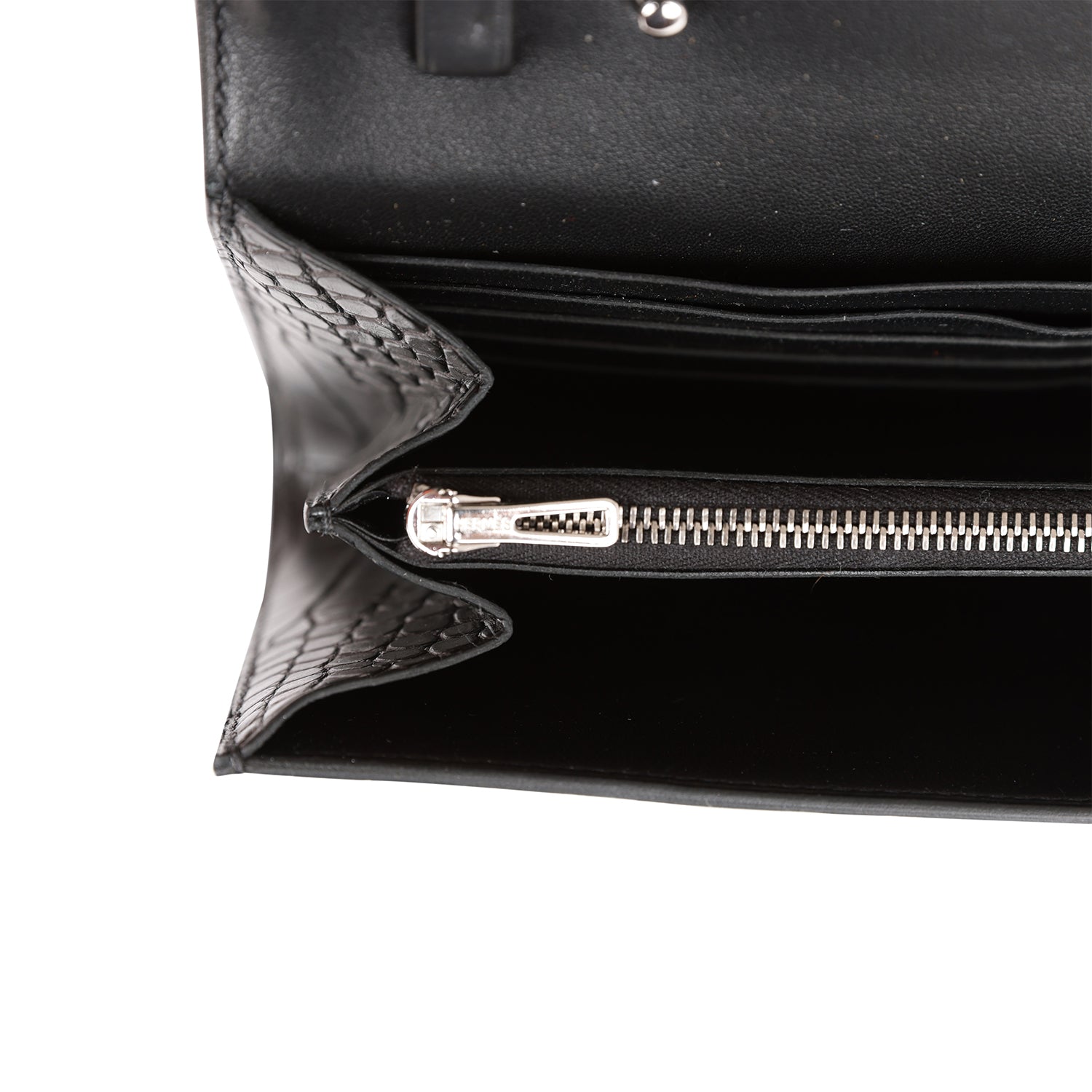 The interior is lined with black leather and two main compartments with six credit card slots and a zippered center compartment with Hermes H lock pull.