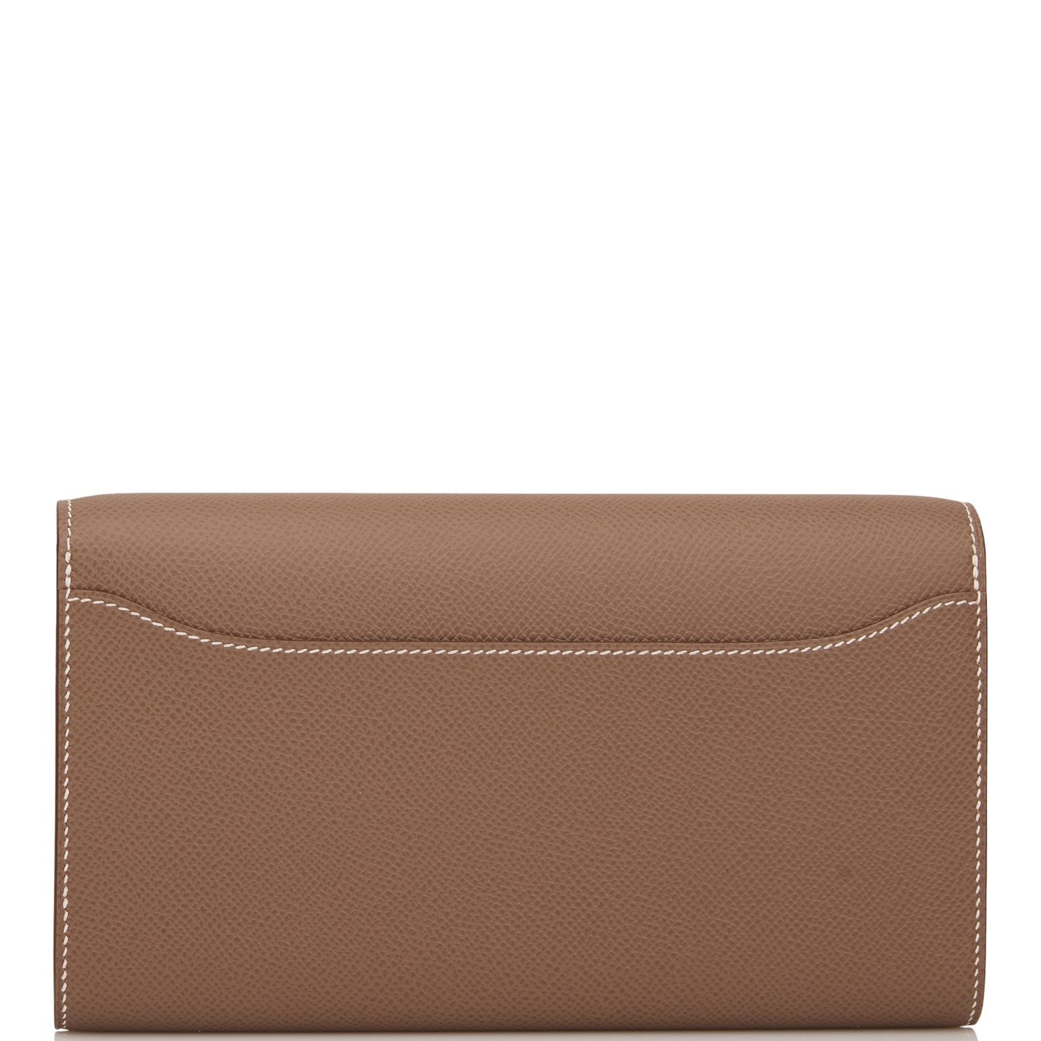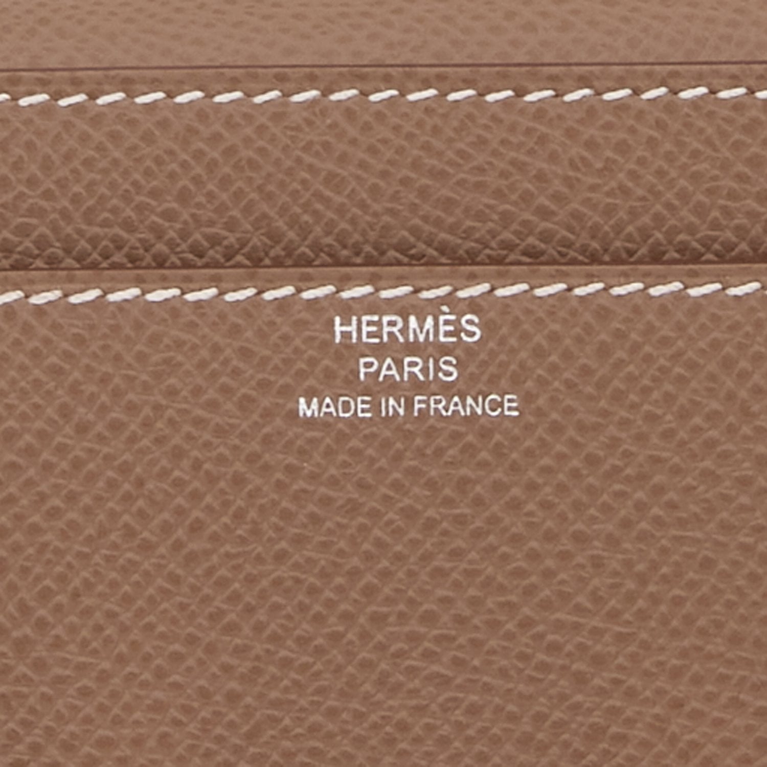 This Constance Wallet To Go is in Etoupe epsom leather with palladium hardware and has contrast stitching, metal "H" snap lock closure, open front compartment and removable crossbody strap.