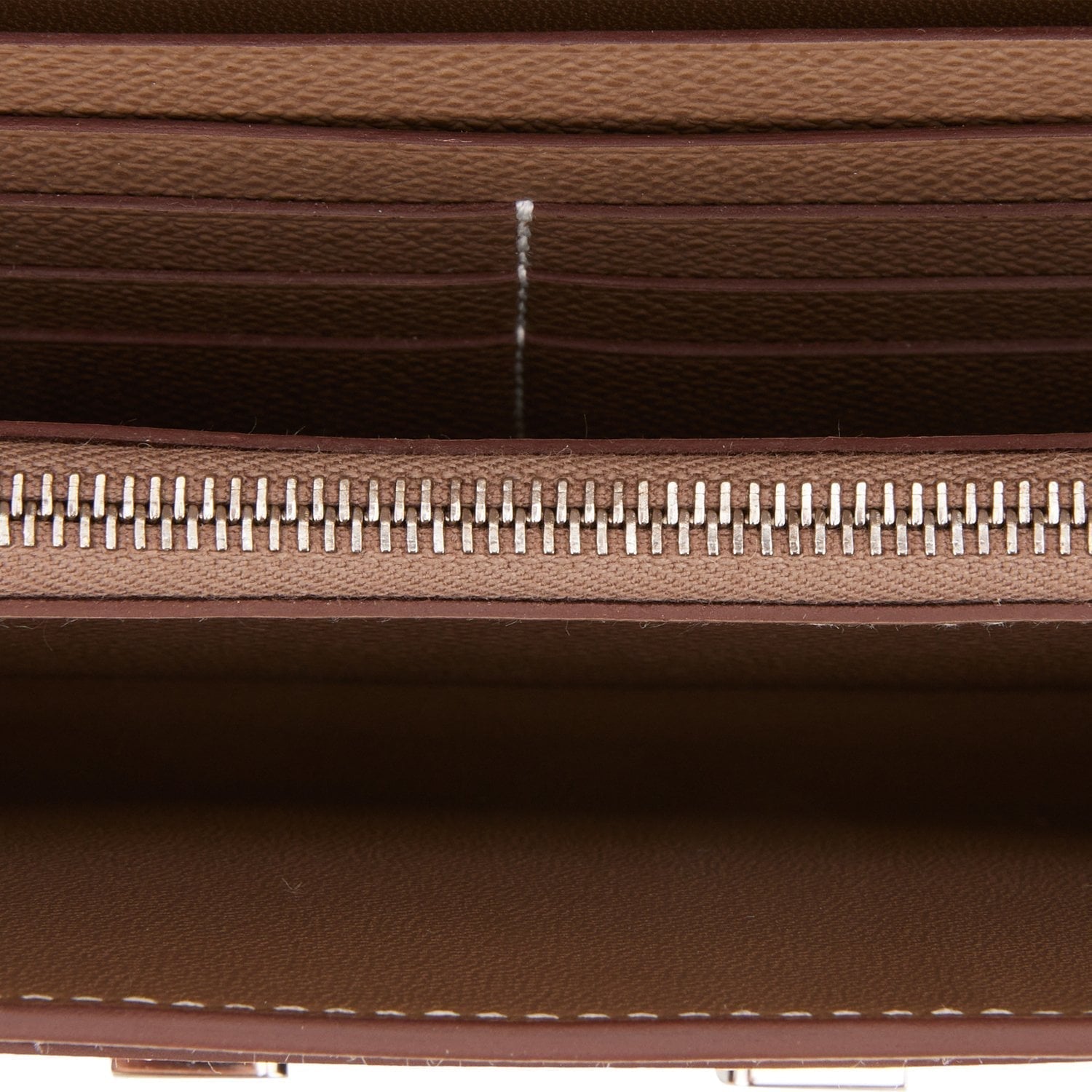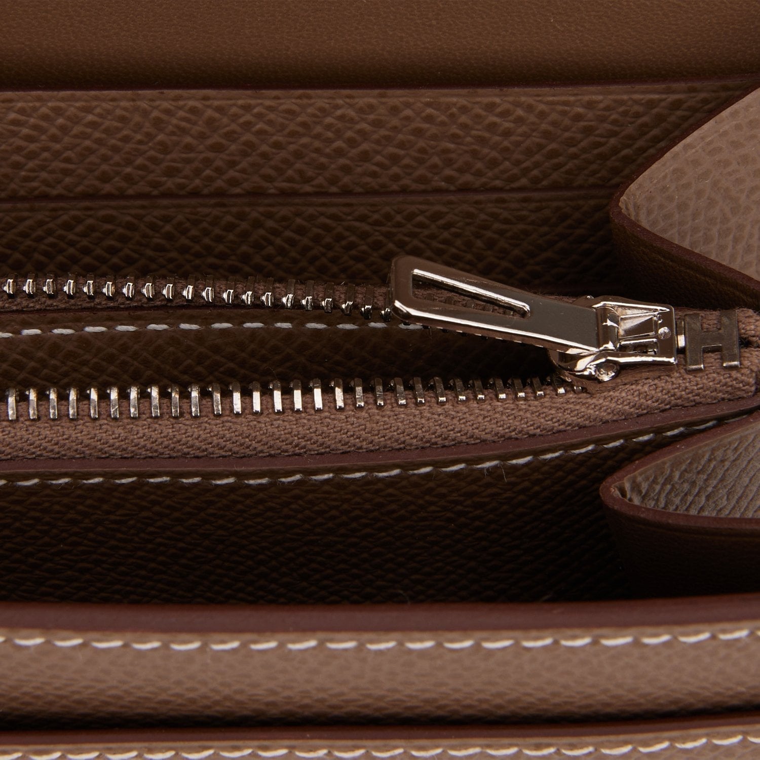 The interior is lined with Etoupe epsom leather and two main compartments with six credit card slots and a zippered center compartment with Hermes H lock pull.