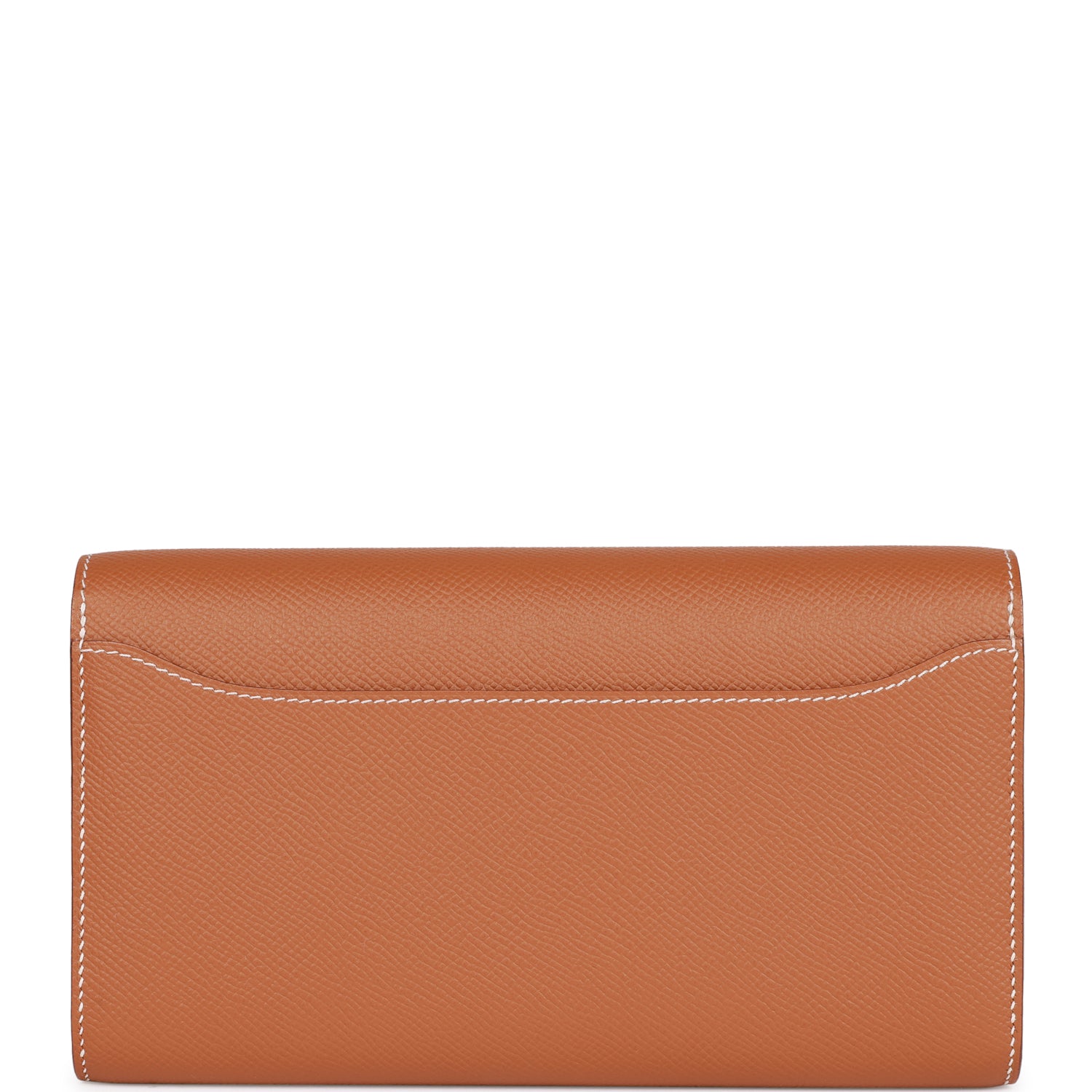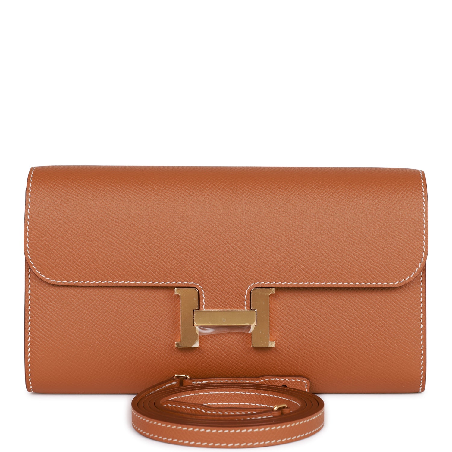 This Constance Wallet To Go is in gold epsom leather with gold hardware and has contrast stitching, metal "H" snap lock closure, open front compartment and removable crossbody strap.