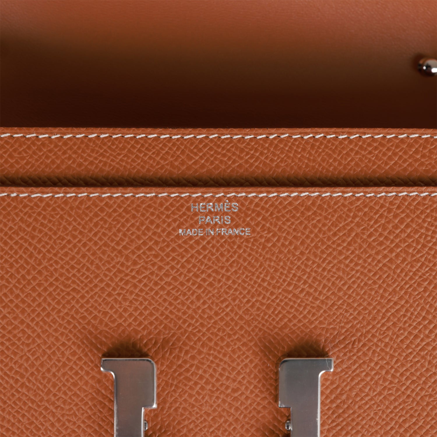 This Constance Wallet To Go is in gold epsom leather with palladium hardware and has contrast stitching, metal "H" snap lock closure, open front compartment and removable crossbody strap.