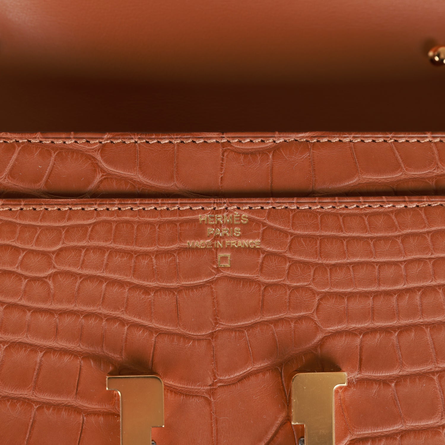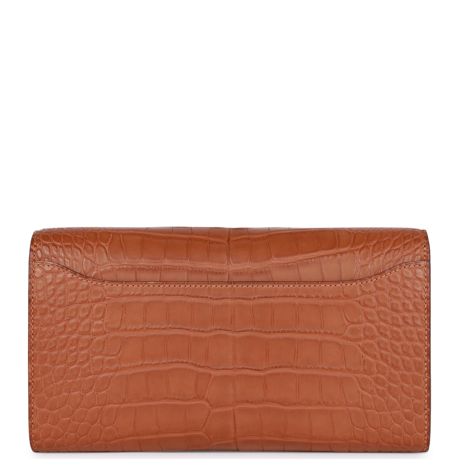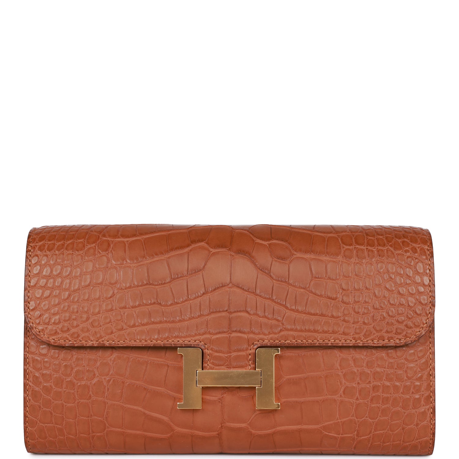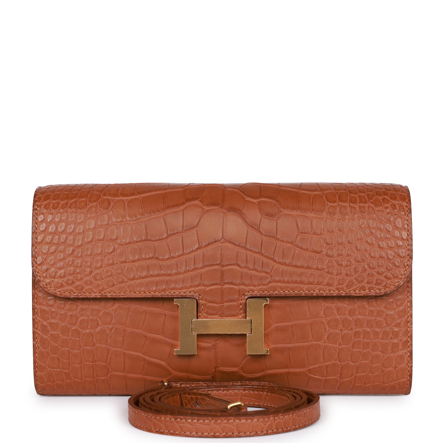 This Constance Wallet To Go is in Gold matte alligator with gold hardware and has tonal stitching, metal "H" snap lock closure, open front compartment and removable crossbody strap.