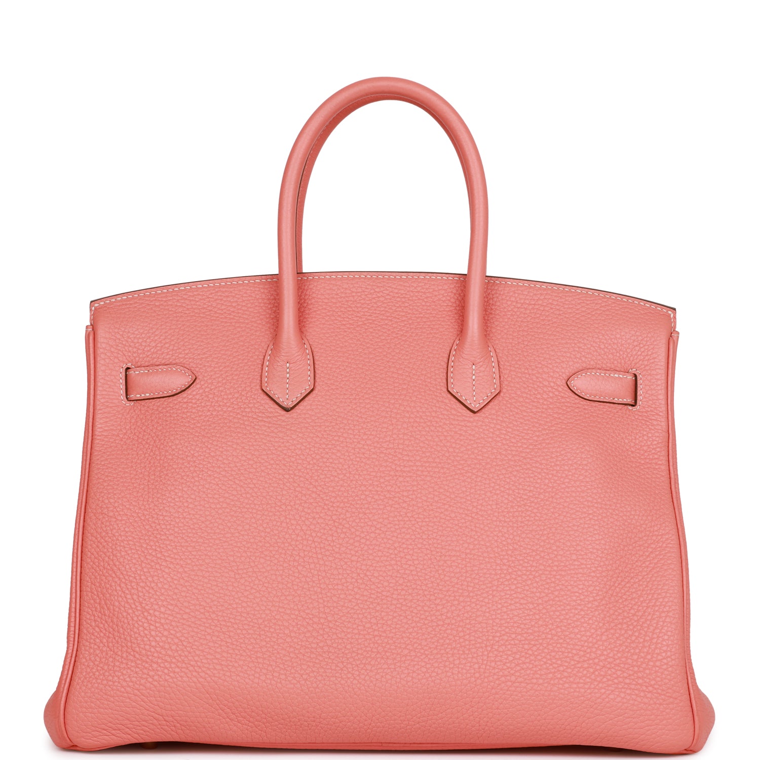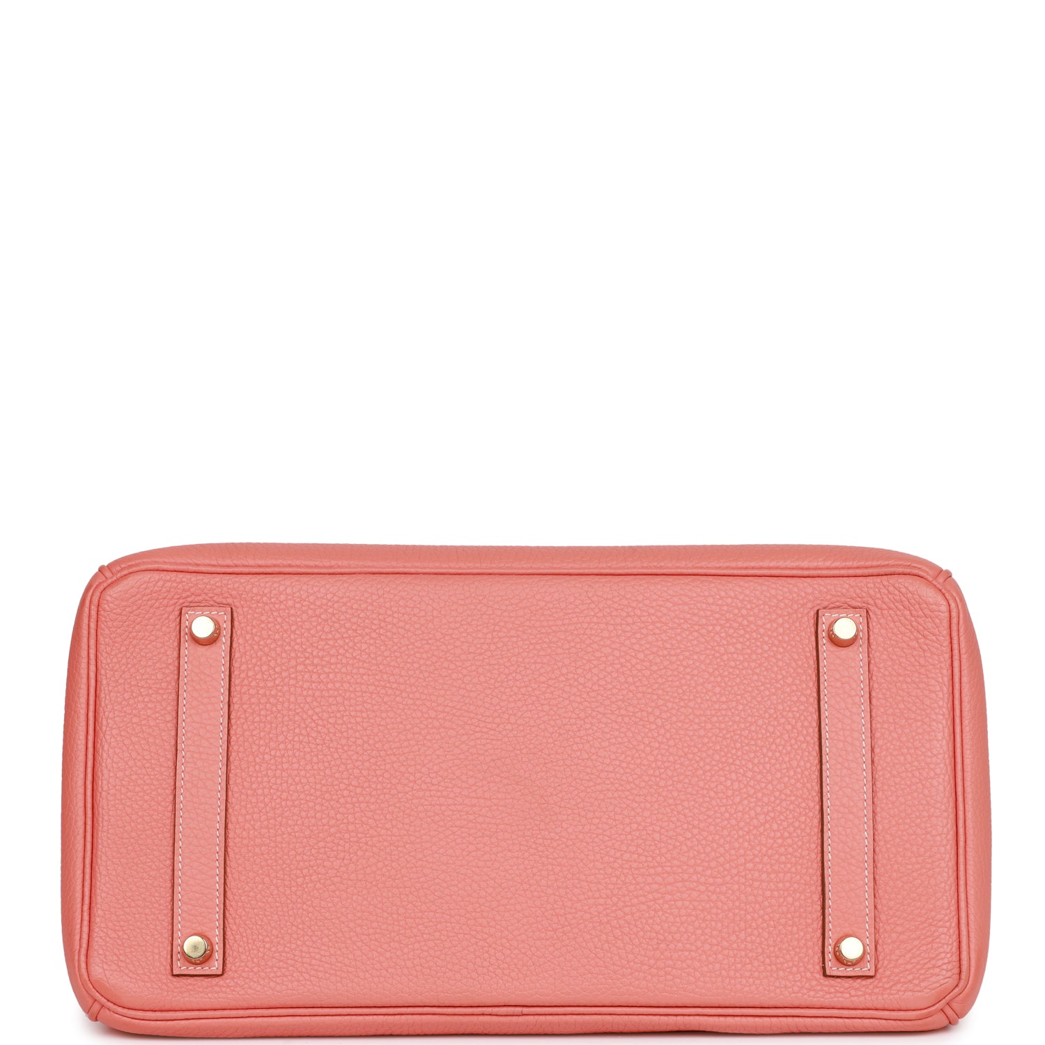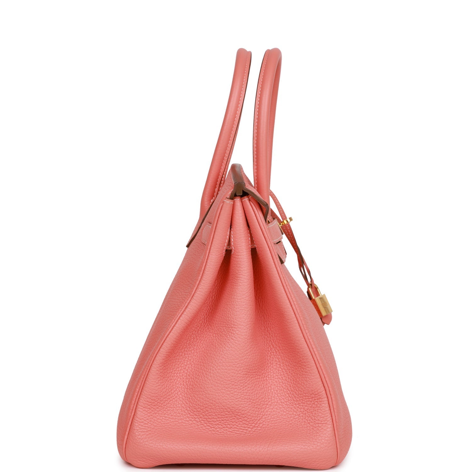 This Birkin is in Crevette togo leather with gold hardware and has contrast stitching, front flap, two straps with center toggle closure, clochette with lock and two keys and double rolled handles.