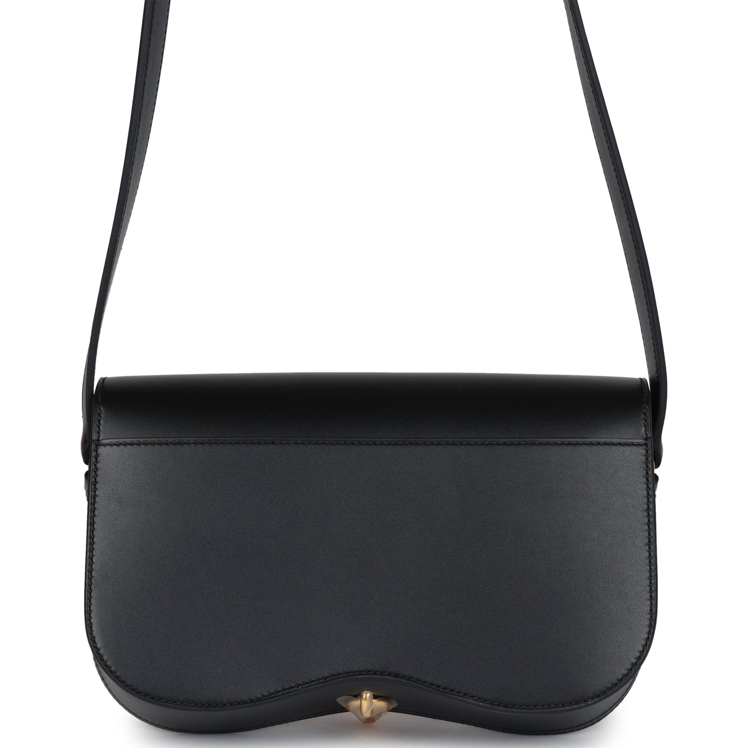 This Della Cavalleria Elan is of Black Tadelakt leather with gold hardware, features tonal stitching, rectangular shaped bag with curved base, gold half-bit clasp closure, a flat leather buckle shoulder/crossbody strap with one exterior back pocket.