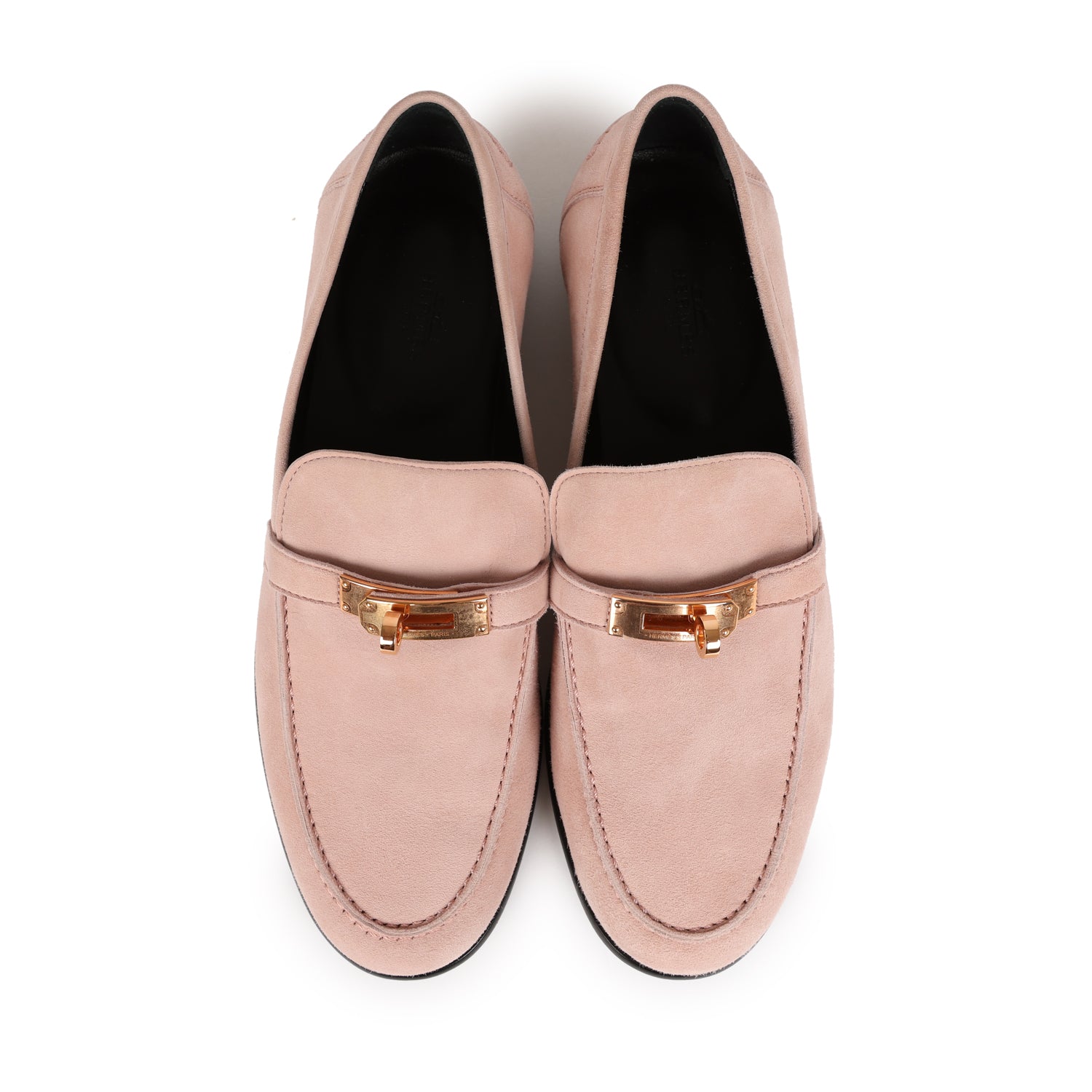 This pair of Hermes Destin Loafer are in Rose Aube suede with rose gold hardware featuring the signature Kelly turnlock and tonal stitching.