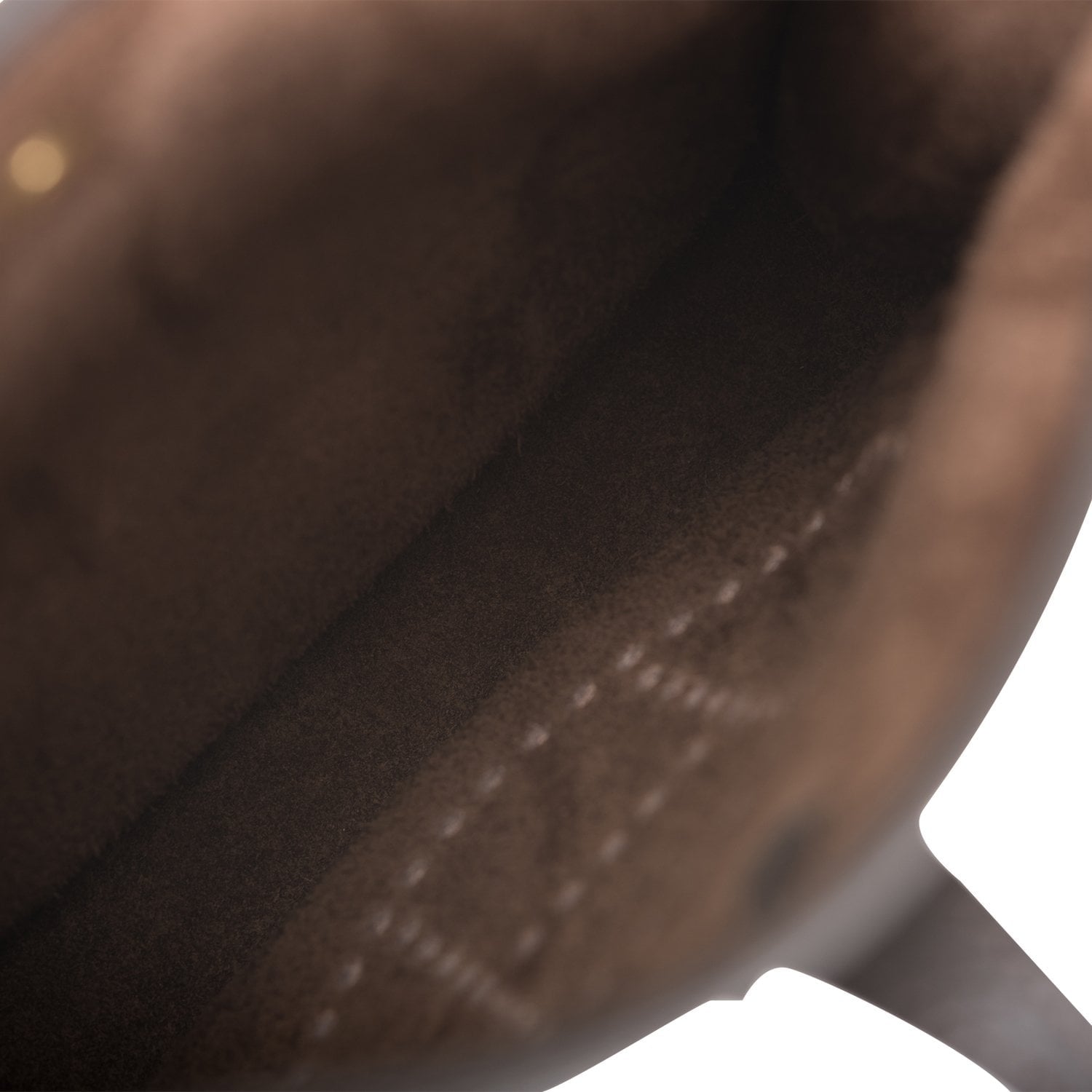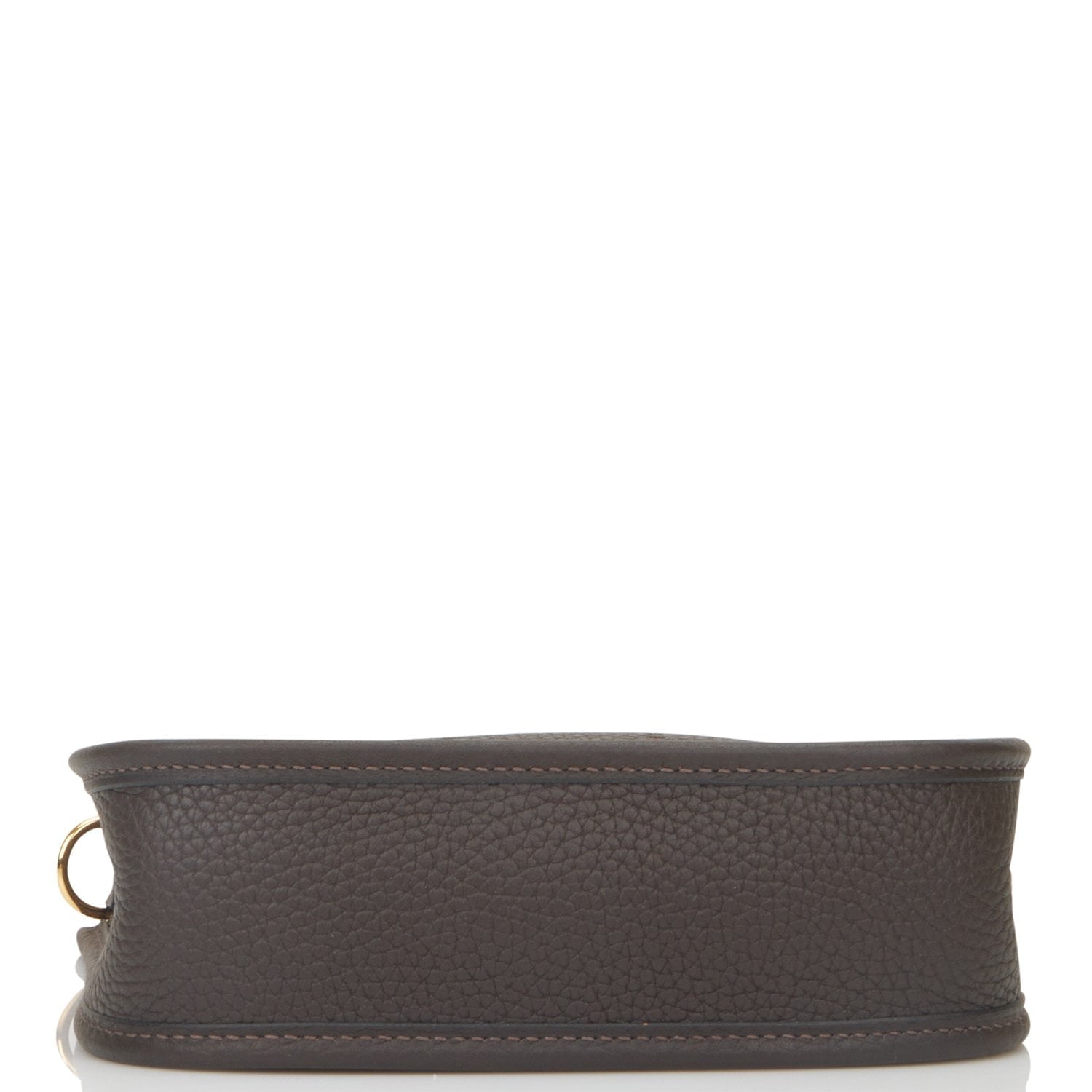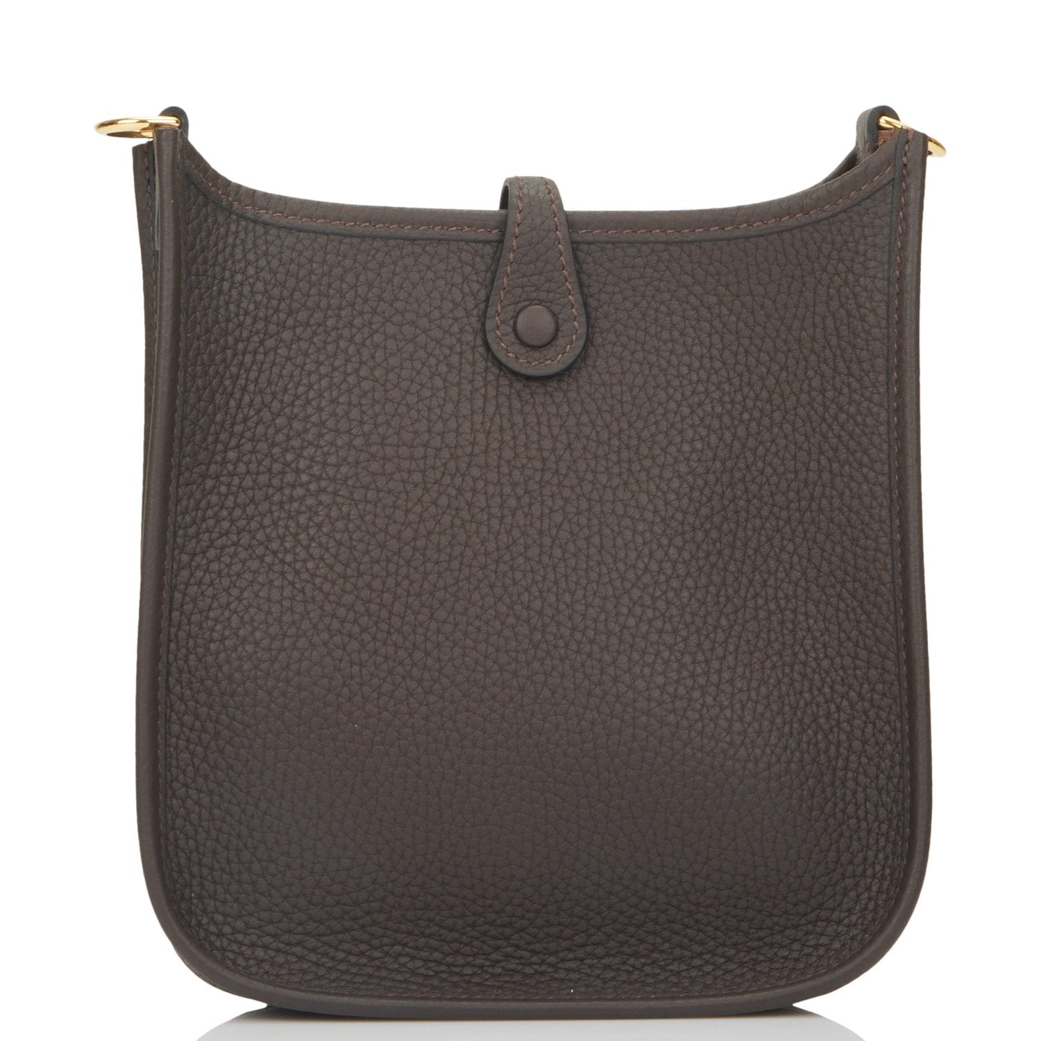 This Evelyne is in Ebene clemence leather with gold hardware and has tonal stitching, pull tab top closure and an Ebene removable canvas and leather shoulder/crossbody strap.