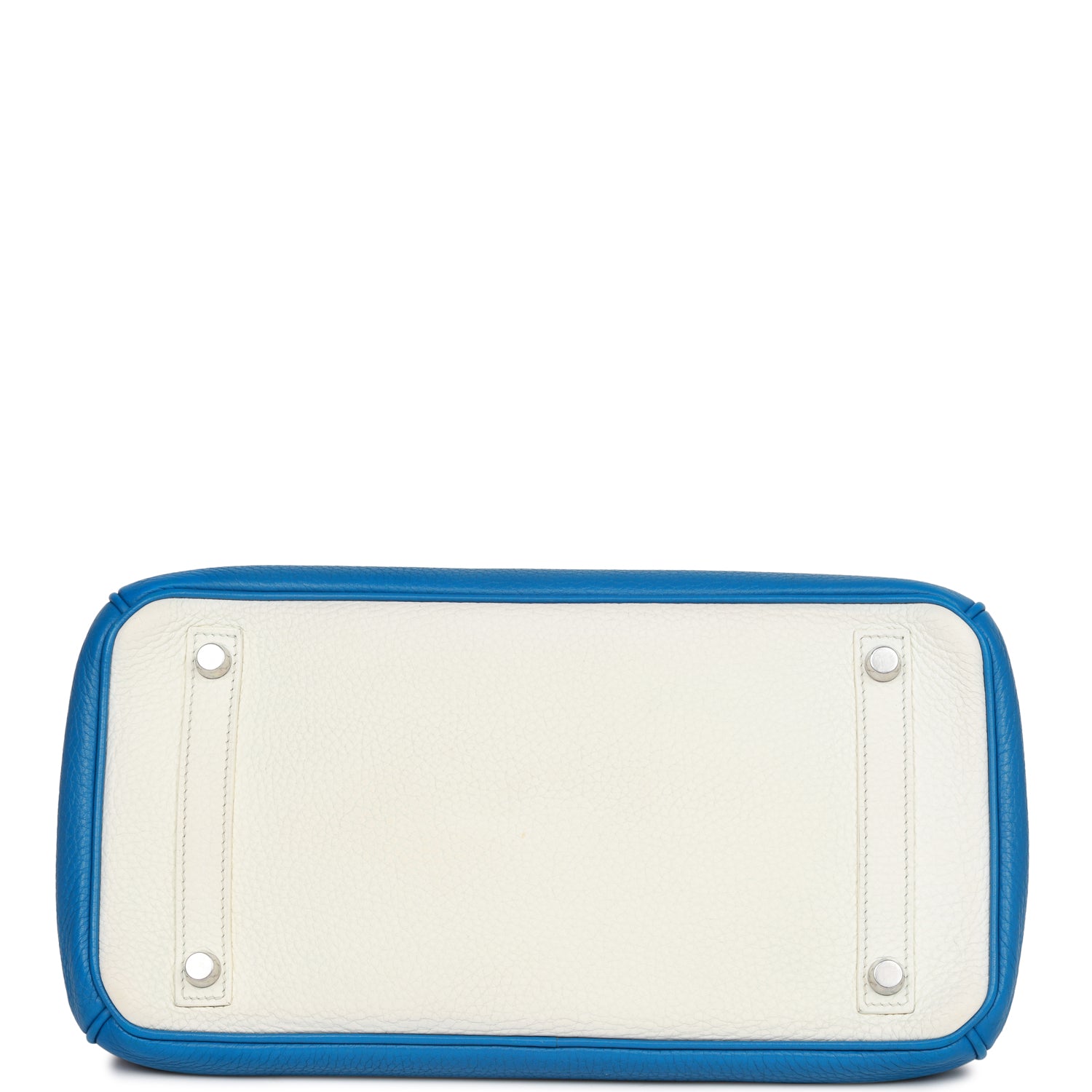 This Eclat Birkin is in Mykonos and White clemence leather with palladium hardware and has contrast stitching, front flap, two straps with center toggle closure, clochette with lock and two keys, and double rolled handles.