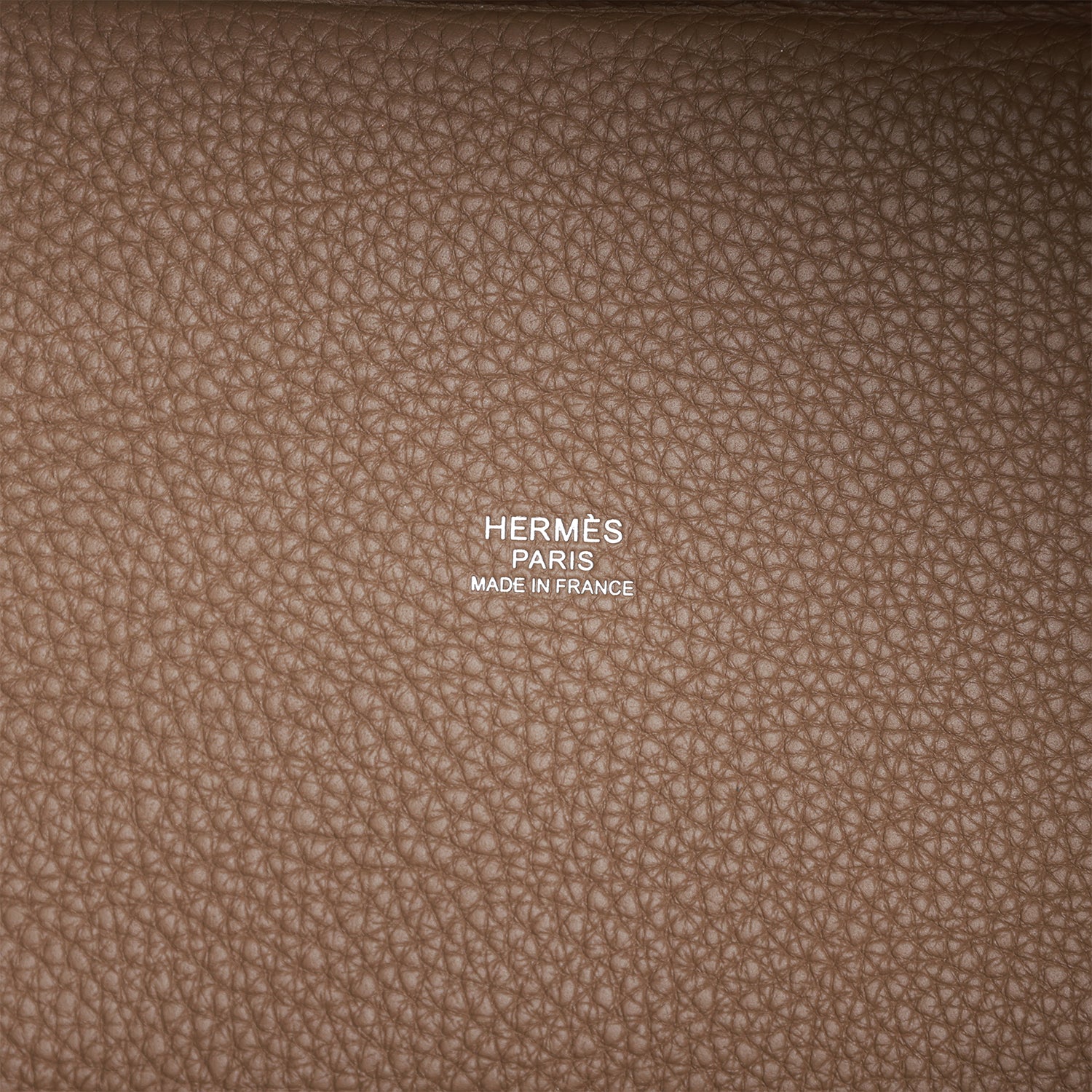 This Picotin Lock is in Etoupe clemence leather with palladium hardware and has contrast stitching with two top handles.