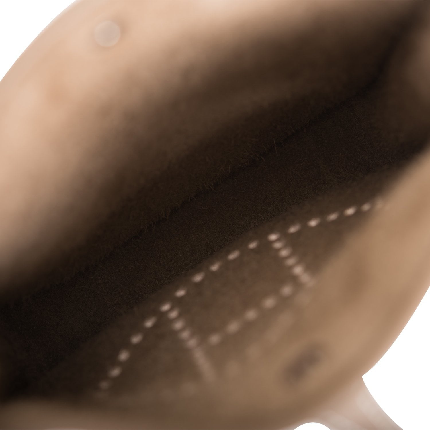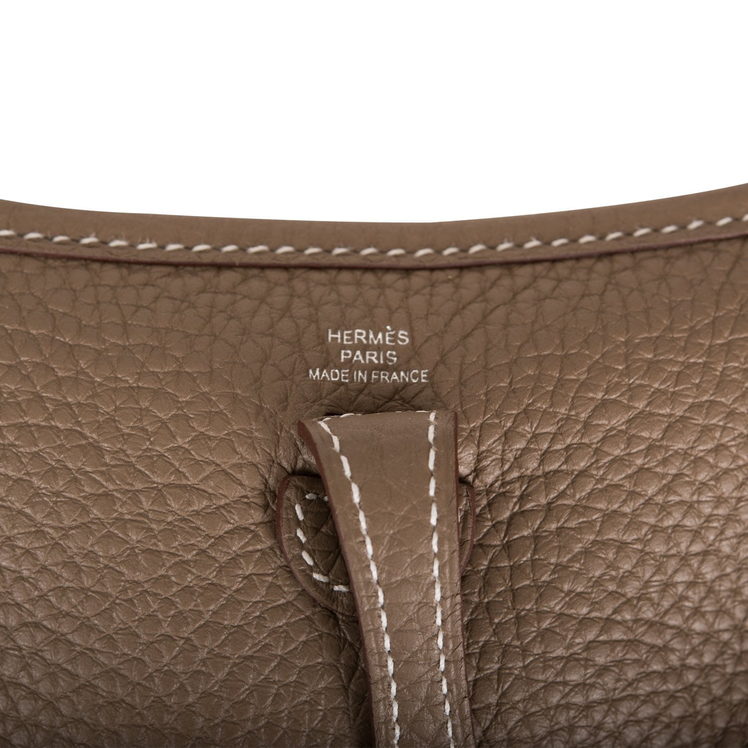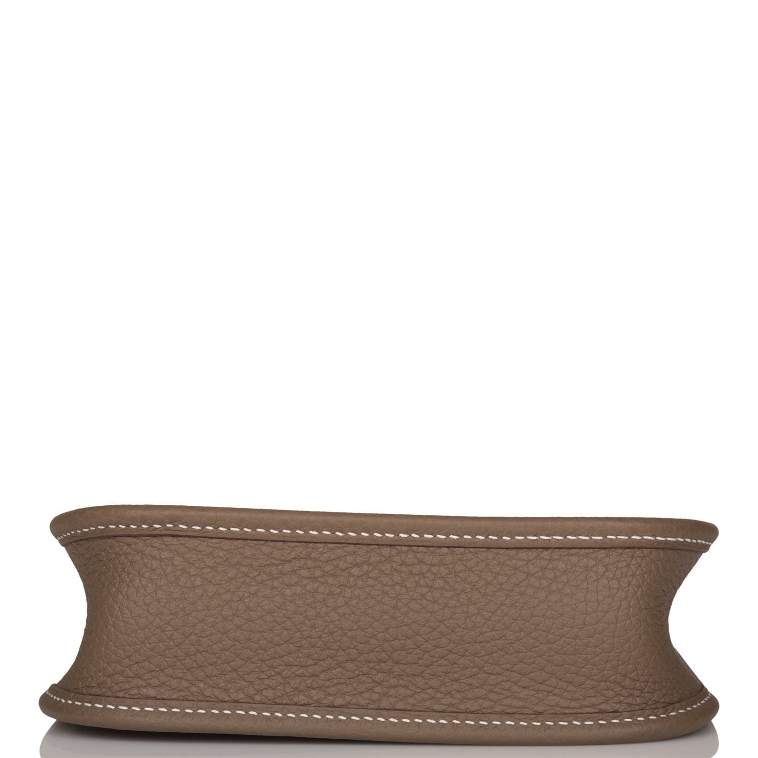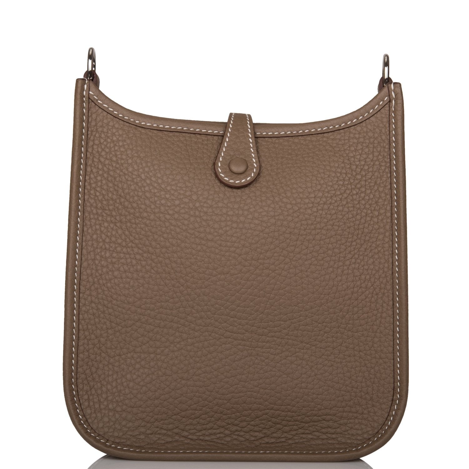 This Evelyne is in Etoupe clemence leather with palladium hardware and has contrast stitching, pull tab top closure and an Etoupe removable canvas and leather shoulder/crossbody strap.