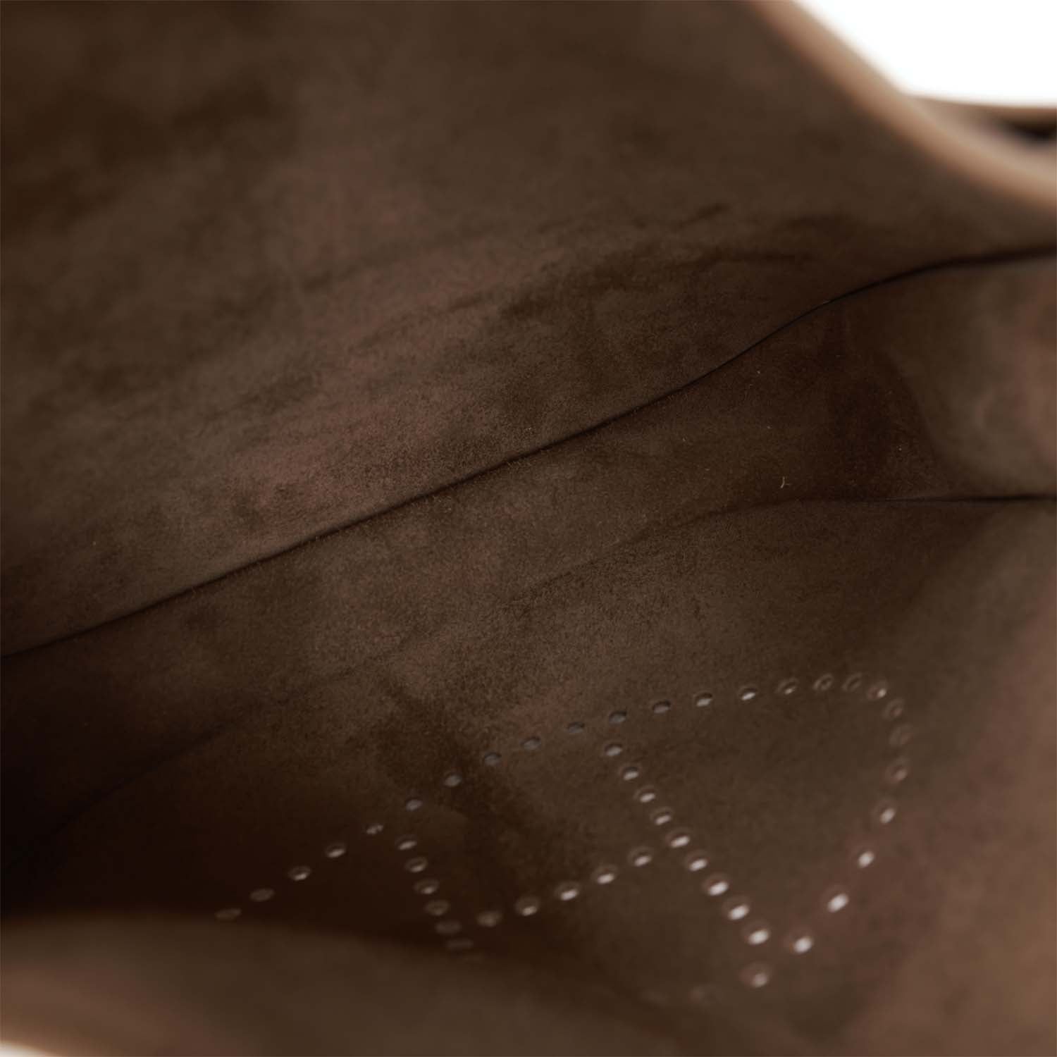 This Evelyne is in Etoupe clemence leather with gold hardware and has contrast stitching, pull tab top closure and etoupe removable canvas and leather shoulder/crossbody strap.