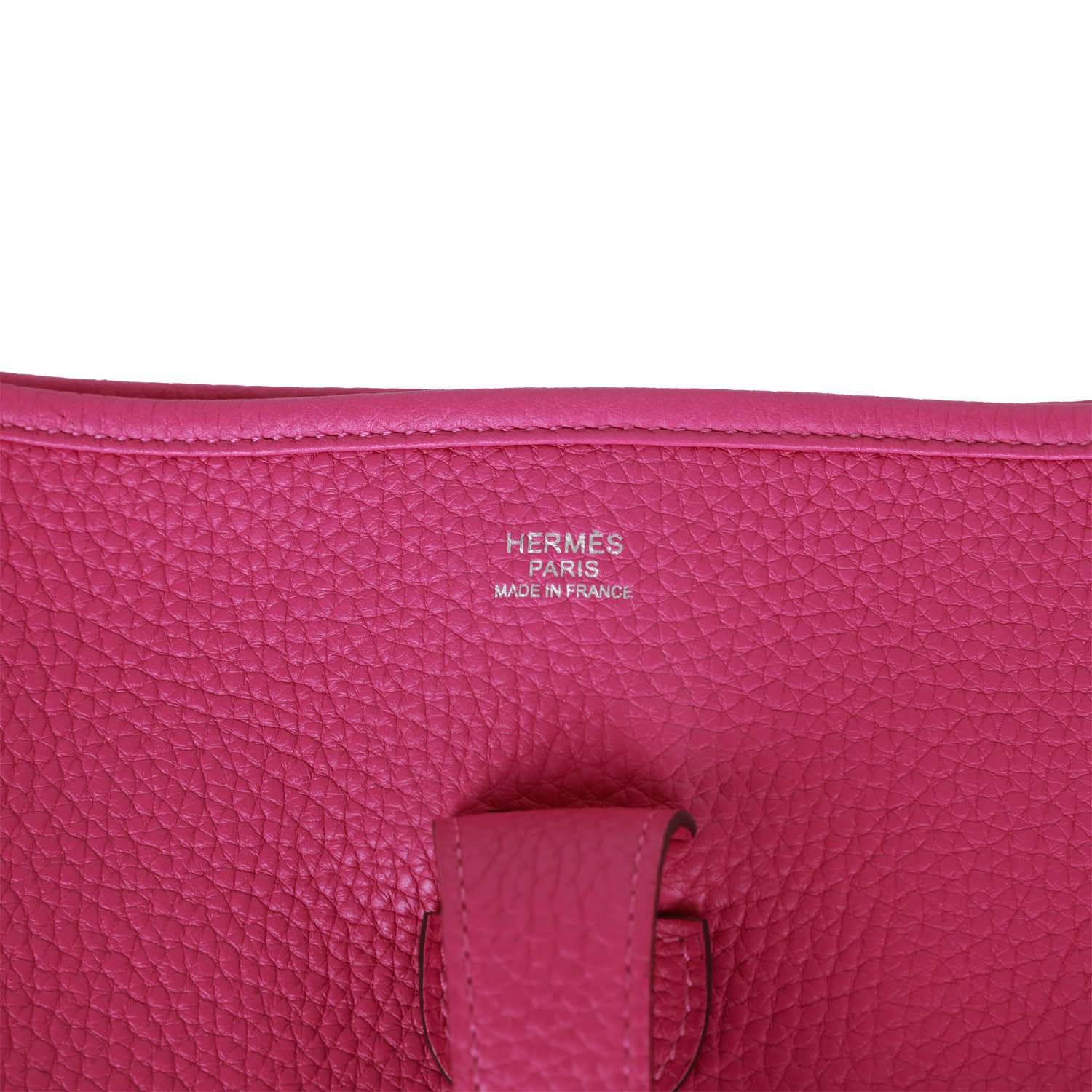This Evelyne is in Rose Pourpre clemence leather with palladium hardware and has tonal stitching, pull tab top closure and Rose Pourpre removable canvas and leather shoulder/crossbody strap.