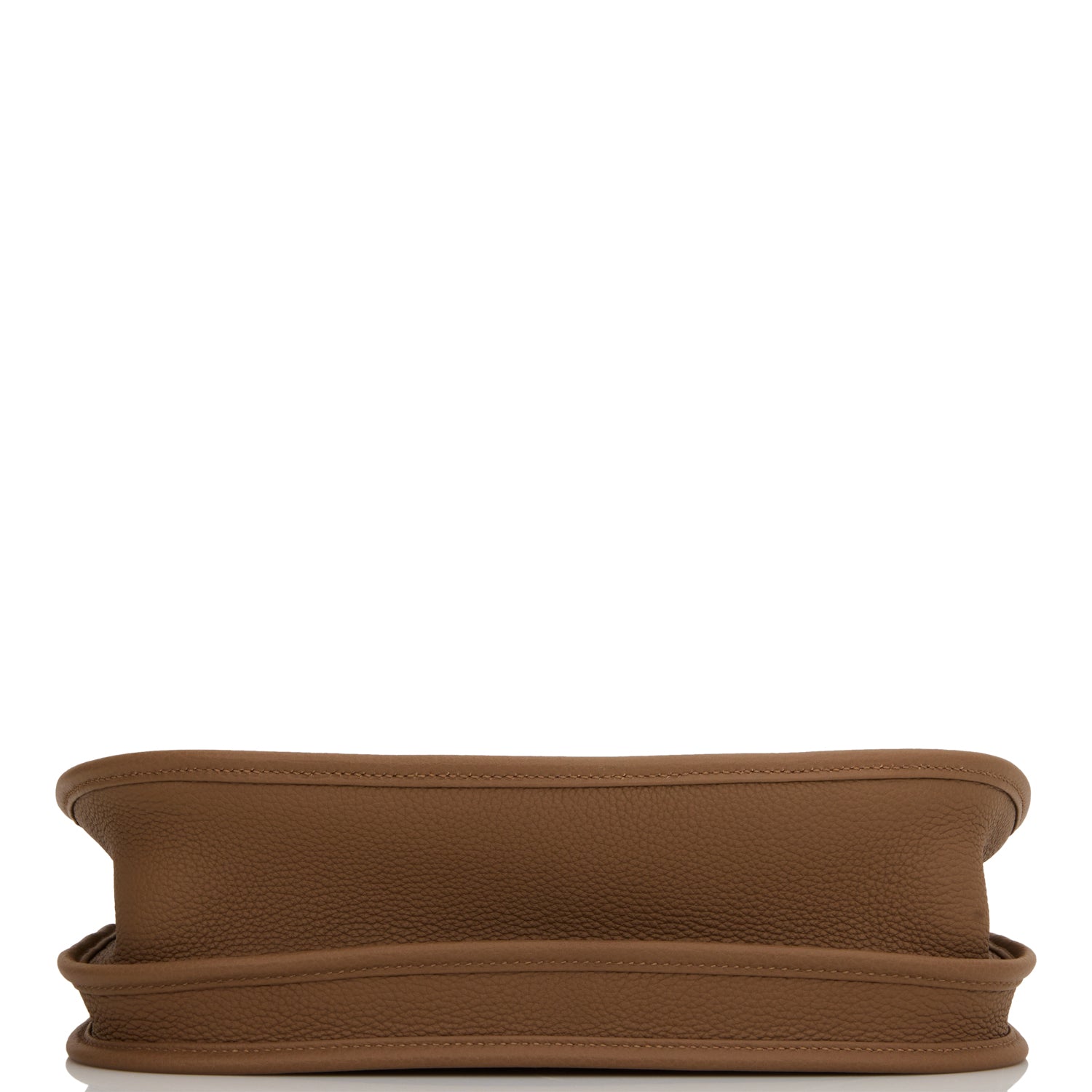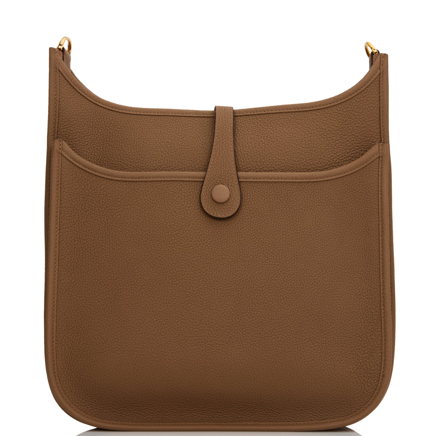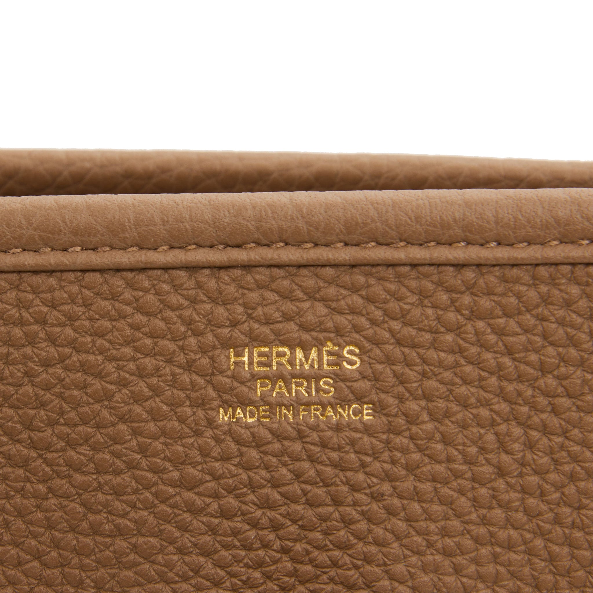 This Evelyne is in Beige de Weimar maurice leather with gold hardware and has tonal stitching, pull tab top closure and Beige de Weimar removable canvas and leather shoulder/crossbody strap.