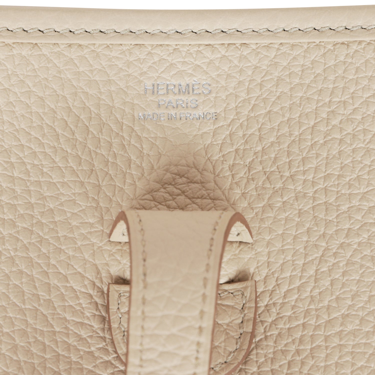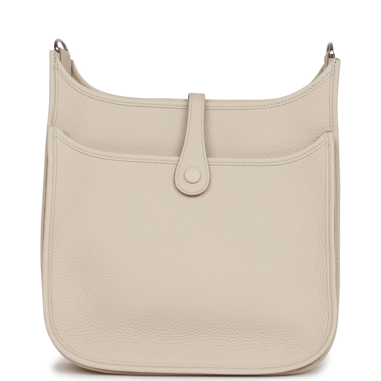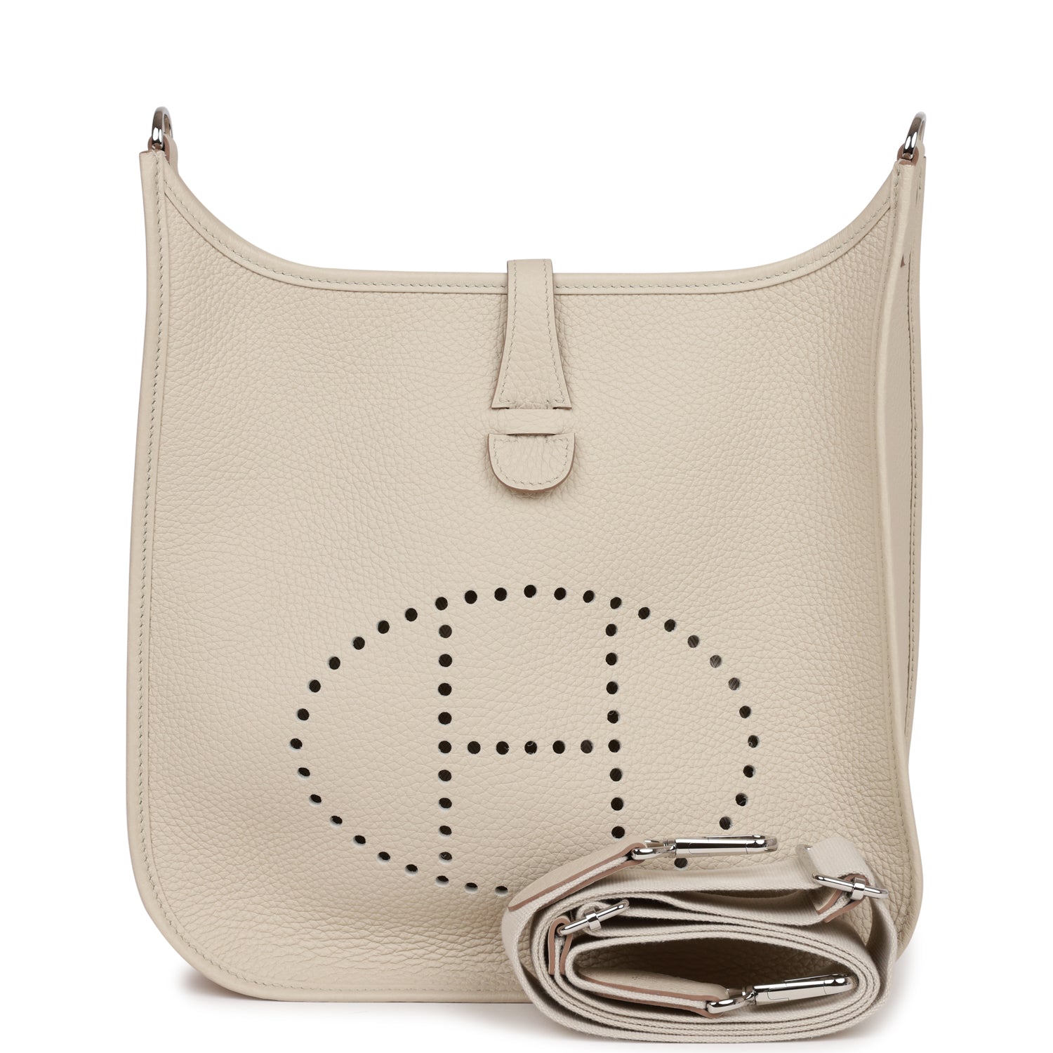 This Evelyne is in Beton clemence leather with palladium hardware and has tonal stitching, pull tab top closure and beton removable canvas and leather shoulder/crossbody strap.