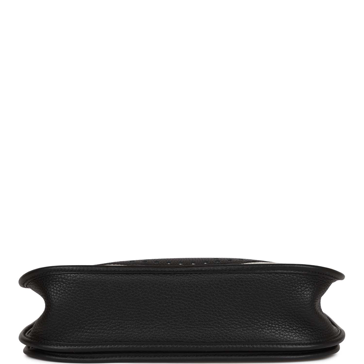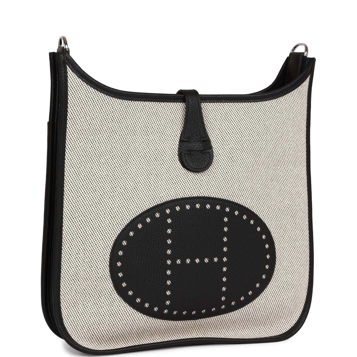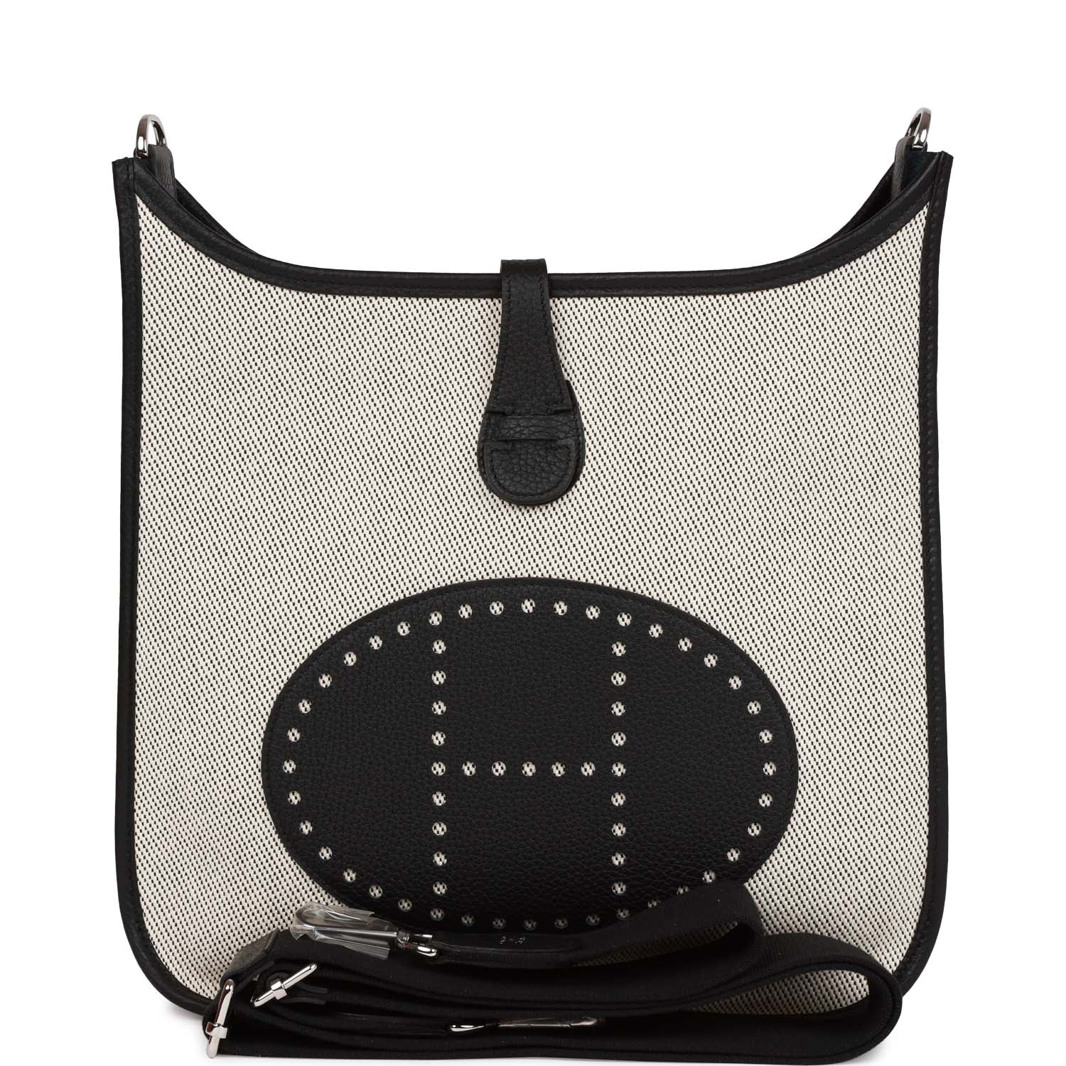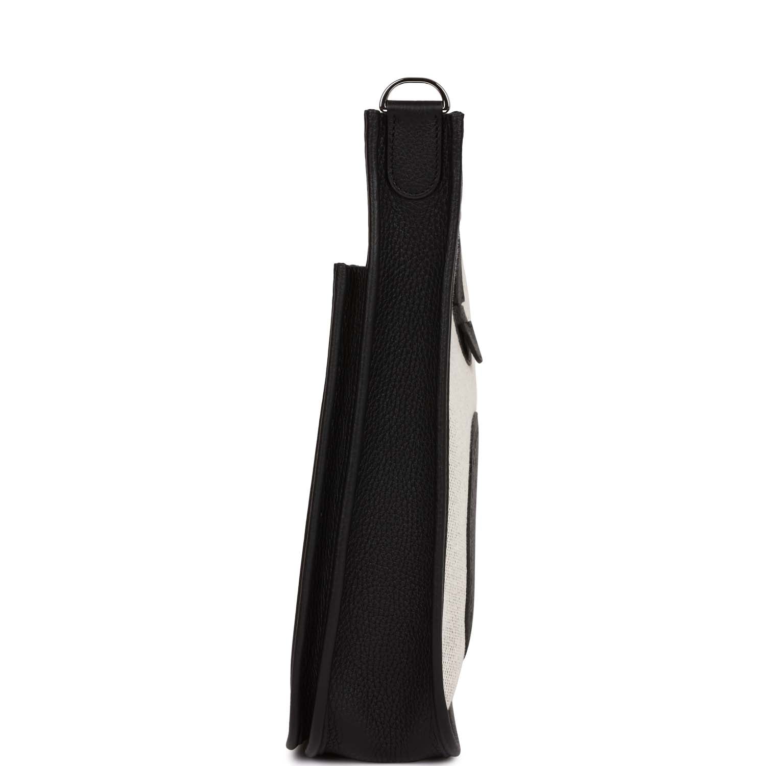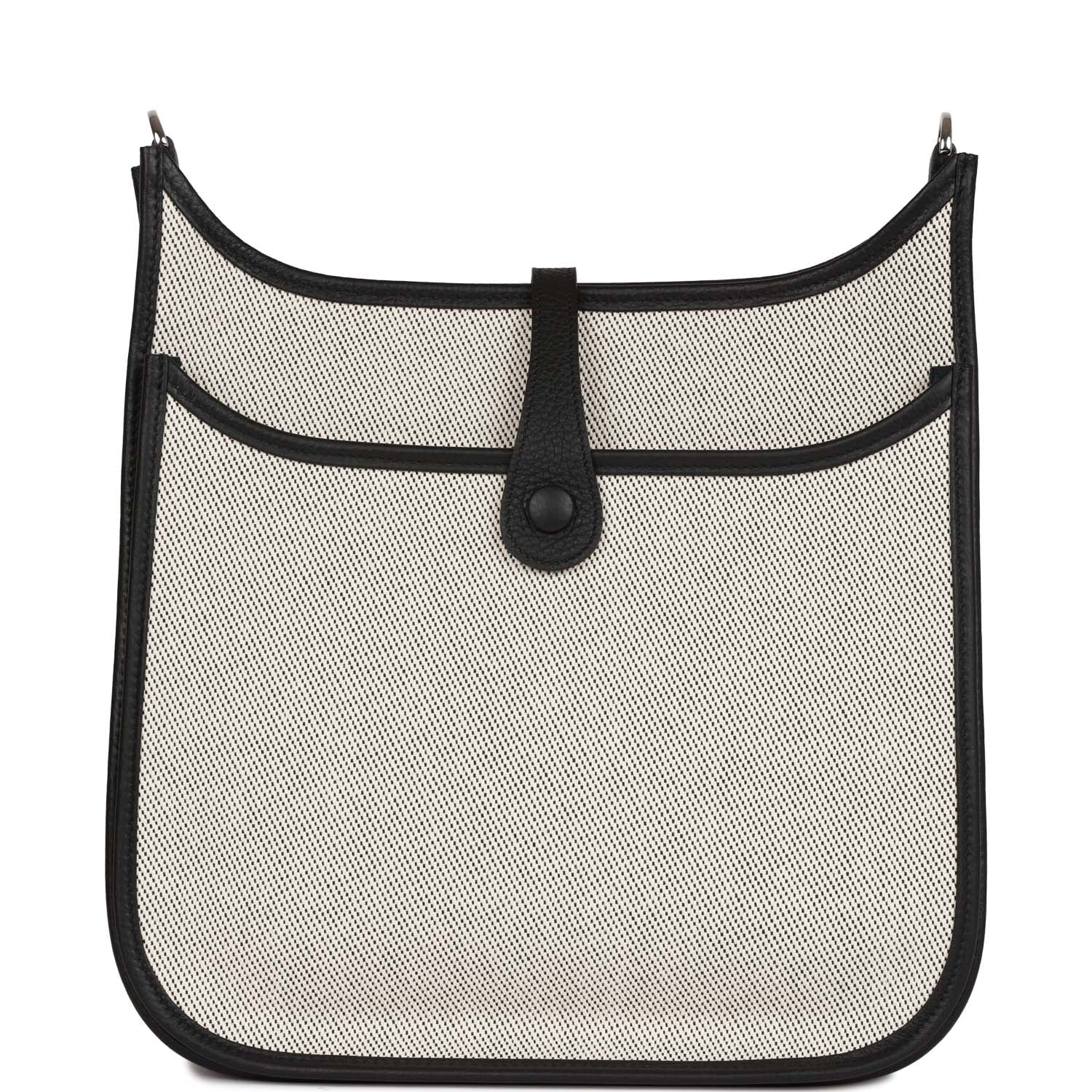 This Evelyne is in Black clemence leather and toile with palladium hardware and has tonal stitching, pull tab top closure and black removable canvas and leather shoulder/crossbody strap.